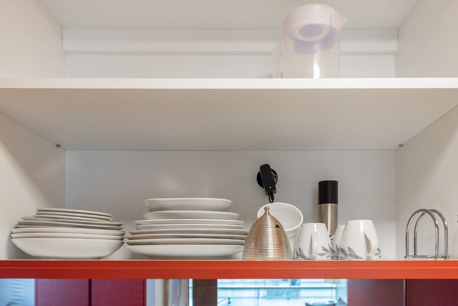 Pots, glasses, wine glasses, dishes, cutlery, and basic kitchen utensils