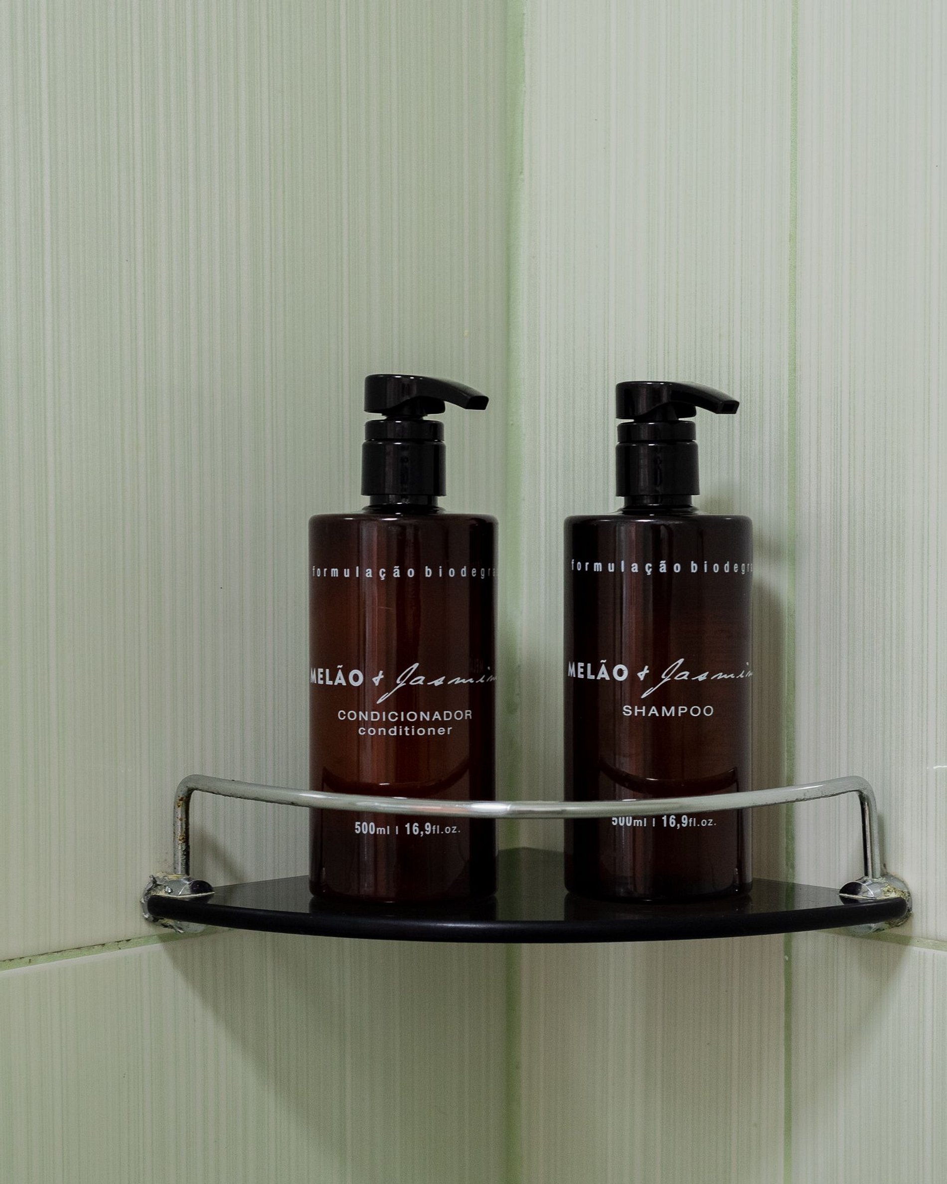 (shampoo, conditioner, soap, and toilet paper)