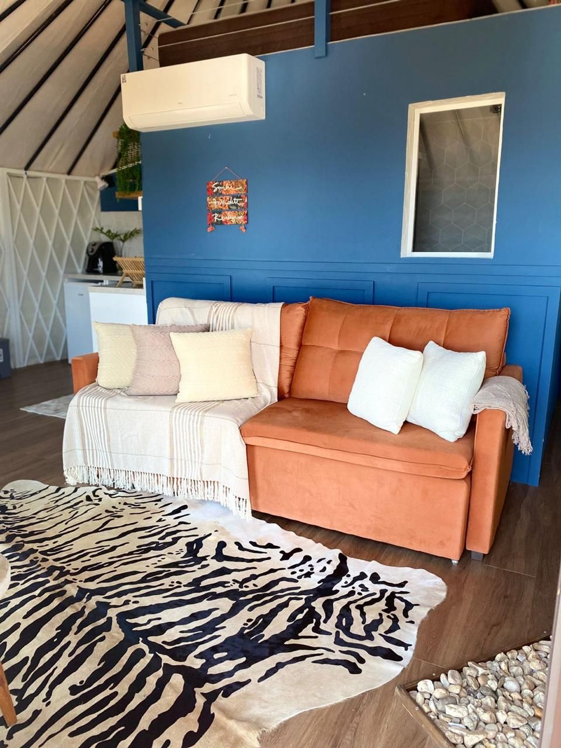 Our accommodations combine comfort and design with a warm, intimate atmosphere. You will find a thoughtfully prepared environment, featuring cozy lighting, natural elements, and everything you need for a practical and memorable stay.