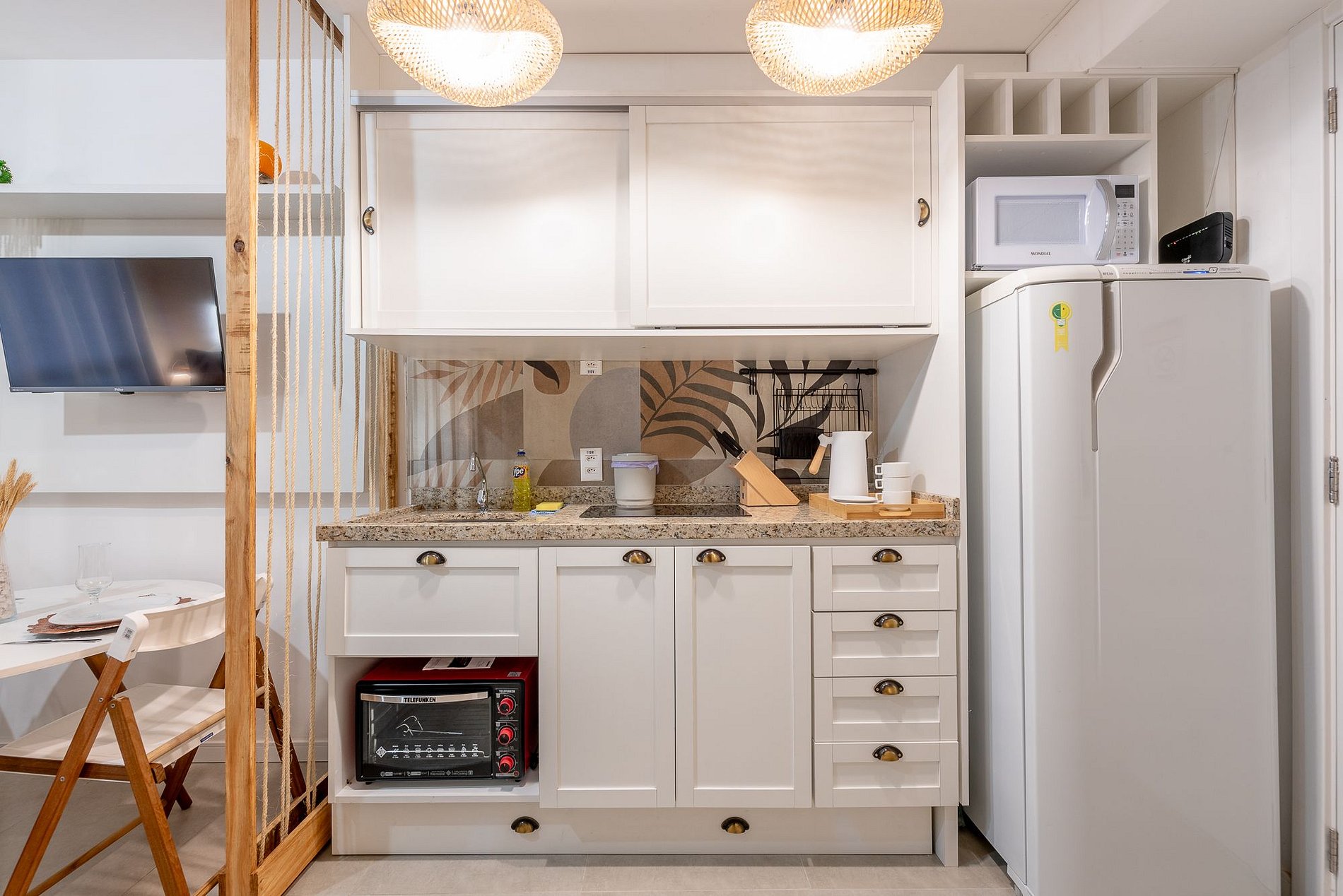 Our Studio offers: Bed linen, pillows, blankets, towels, and amenities (shampoo, conditioner, soap, and toilet paper) 32" Smart TV Queen bed Sofa bed Pots, glasses, wine glasses, champagne flutes, dishes, and cutlery Cooking accessories Dining table for three people Microwave Oven Electric kettle Blender Toaster 2-burner induction cooktop Duplex refrigerator Split air conditioning (cool/heat) Iron and ironing board Shower Hairdryer Fast Wi-Fi Self check-in via digital lock 1 rotating uncovered parking spot at no additional cost