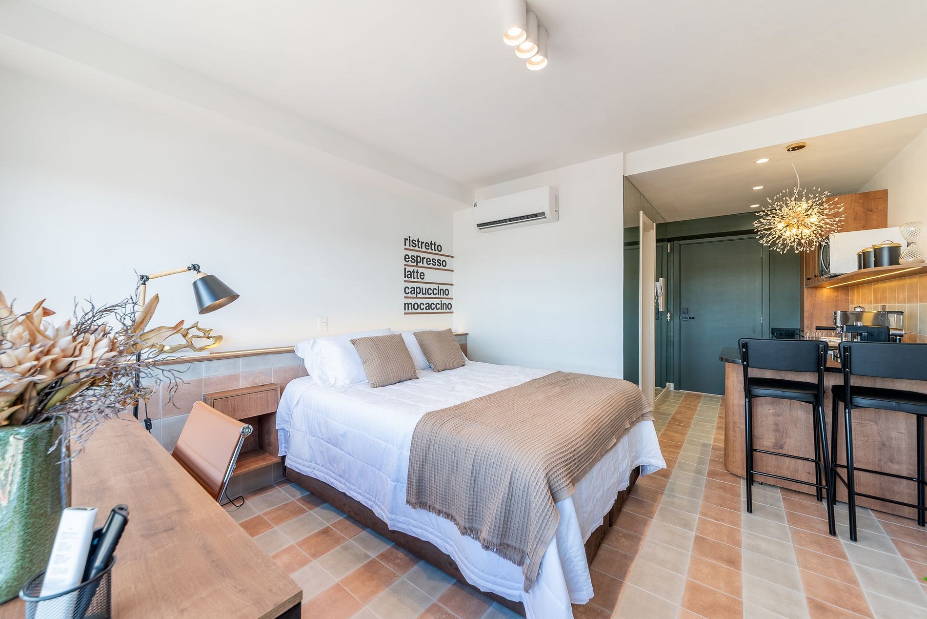 The Loft Capuccino was inspired by Italy and the Viveur concept, combining lifestyle and pleasure in every detail. With references to Italian cafés, the space recreates a cozy and sophisticated atmosphere. Located at Rua Cubanos, 114, in Porto Alegre, near PUC-RS University and PUC-RS Hospital, it offers modern comfort and easy access to essential services. Embark on this unique experience of charm and coziness.