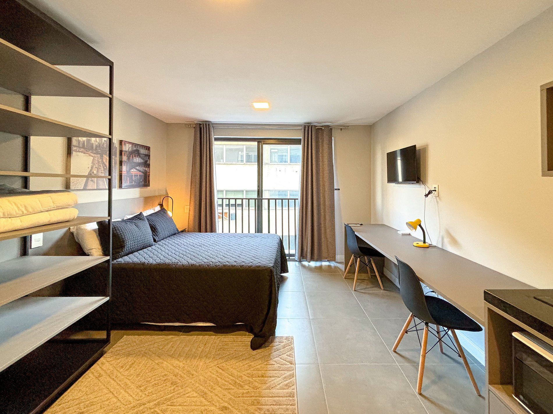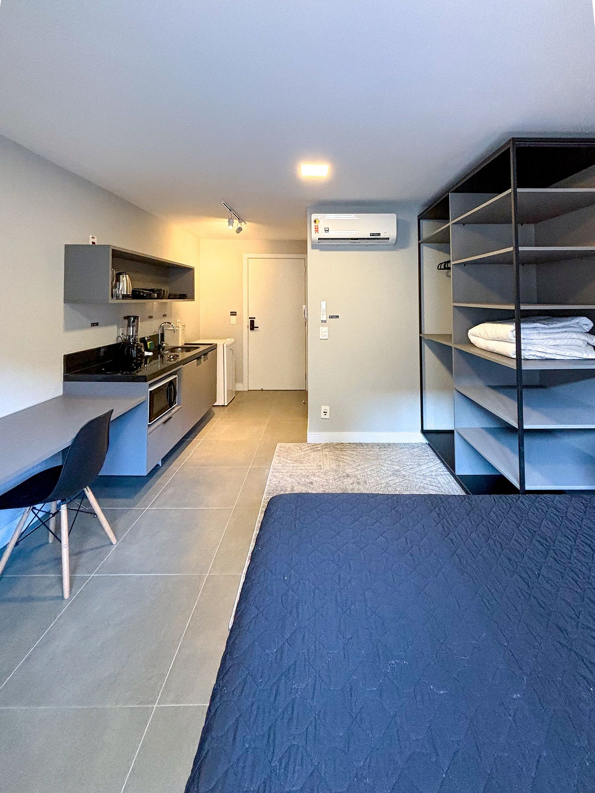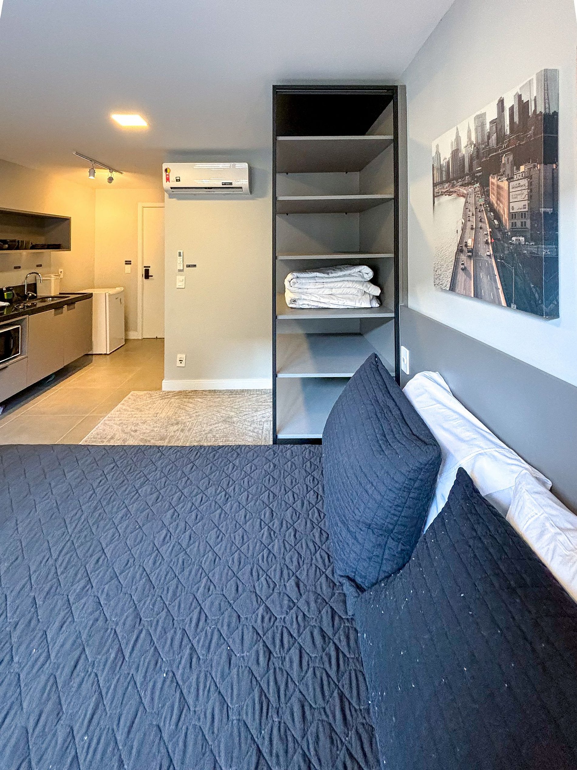 Welcome to this sophisticated studio, featuring a black and gray color palette that exudes modern and minimalist charm. Ideal for those seeking a clean and functional space, this studio is the perfect retreat in the heart of the city. It has been thoughtfully designed to maximize comfort and practicality, offering a cozy living and sleeping area.
