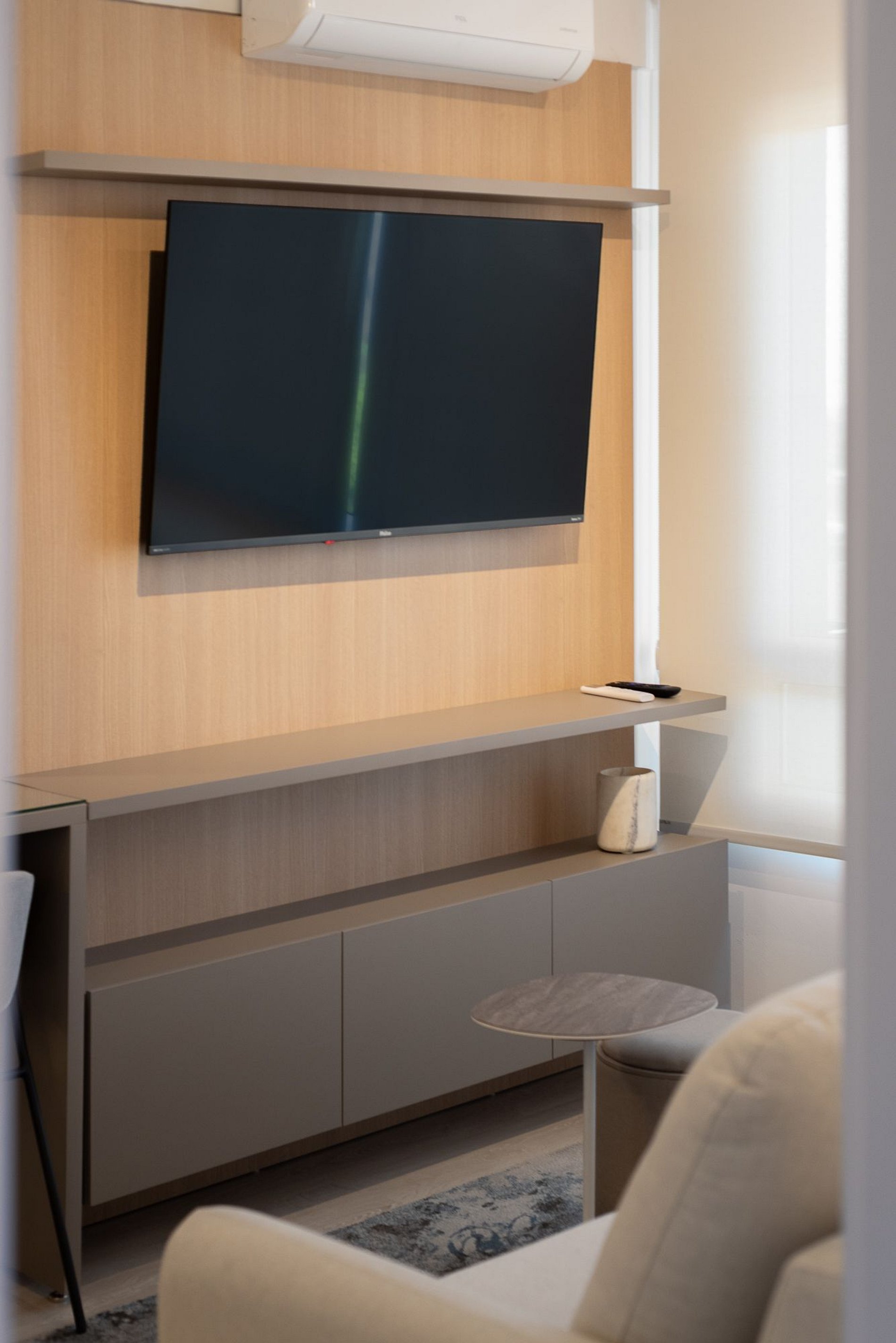 Natural light fills this 10th-floor apartment, showcasing panoramic views of Porto Alegre. Cozy suite with TV and air conditioning, stylish guest bathroom, and living room with TV and air conditioning. Fully equipped kitchen, Wi-Fi, private parking, and digital self check-in ensure a comfortable and convenient stay.