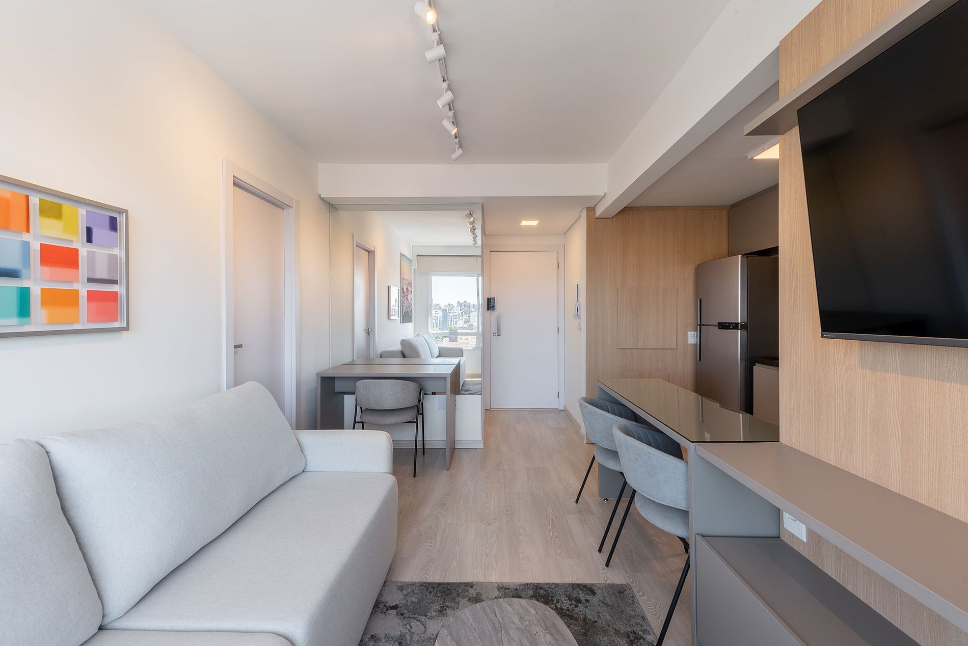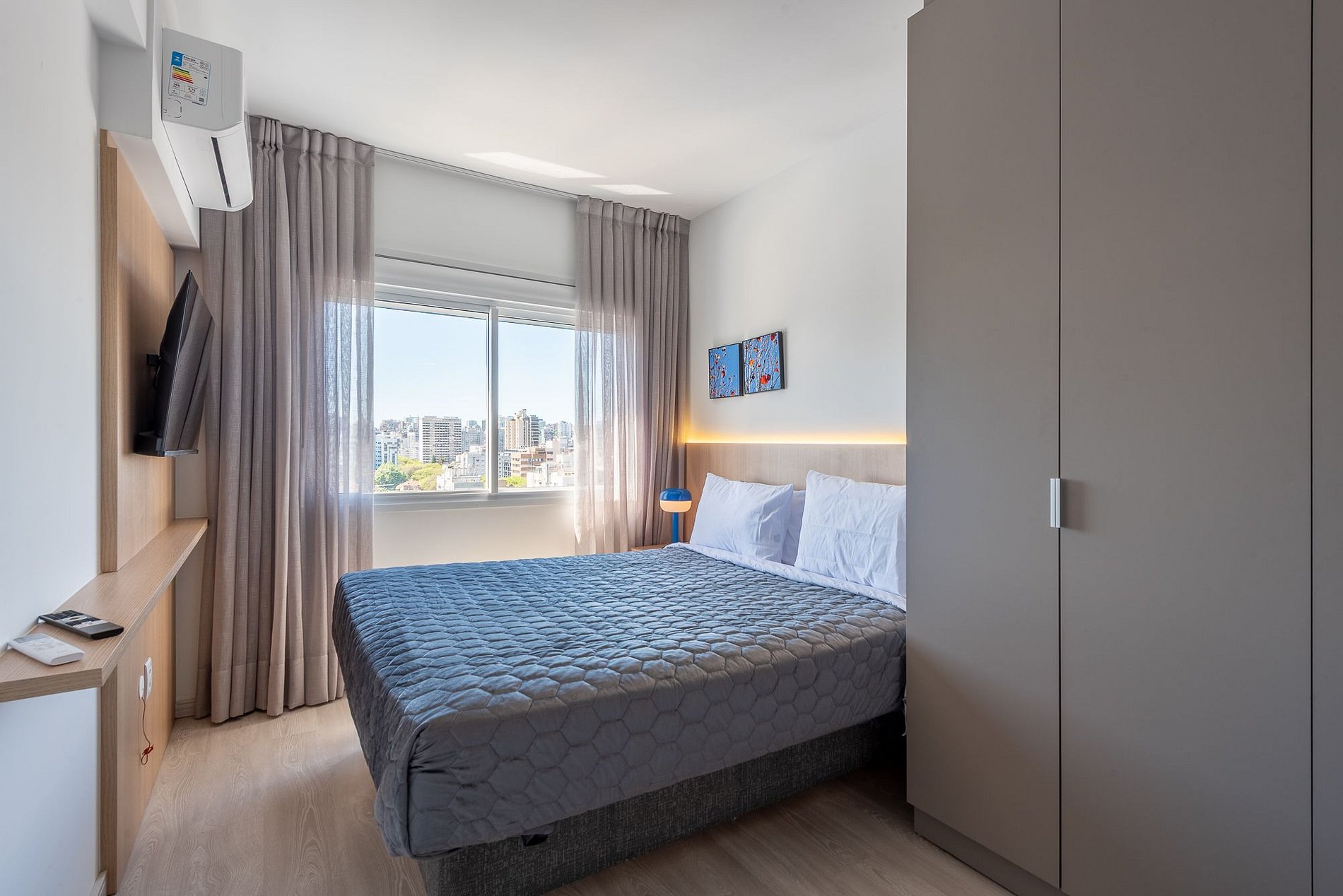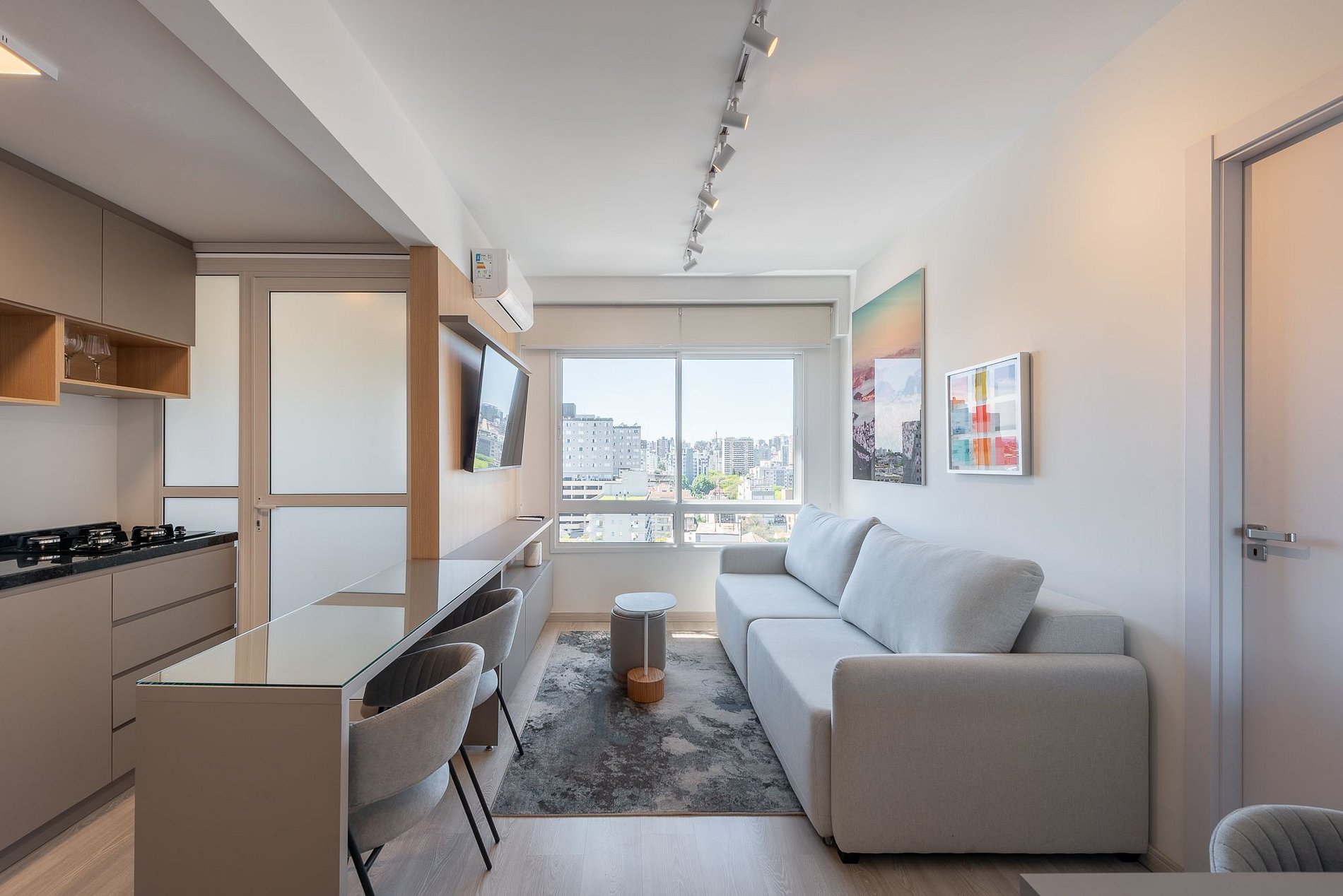 Natural light fills this 10th-floor apartment, showcasing panoramic views of Porto Alegre. Cozy suite with TV and air conditioning, stylish guest bathroom, and living room with TV and air conditioning. Fully equipped kitchen, Wi-Fi, private parking, and digital self check-in ensure a comfortable and convenient stay.