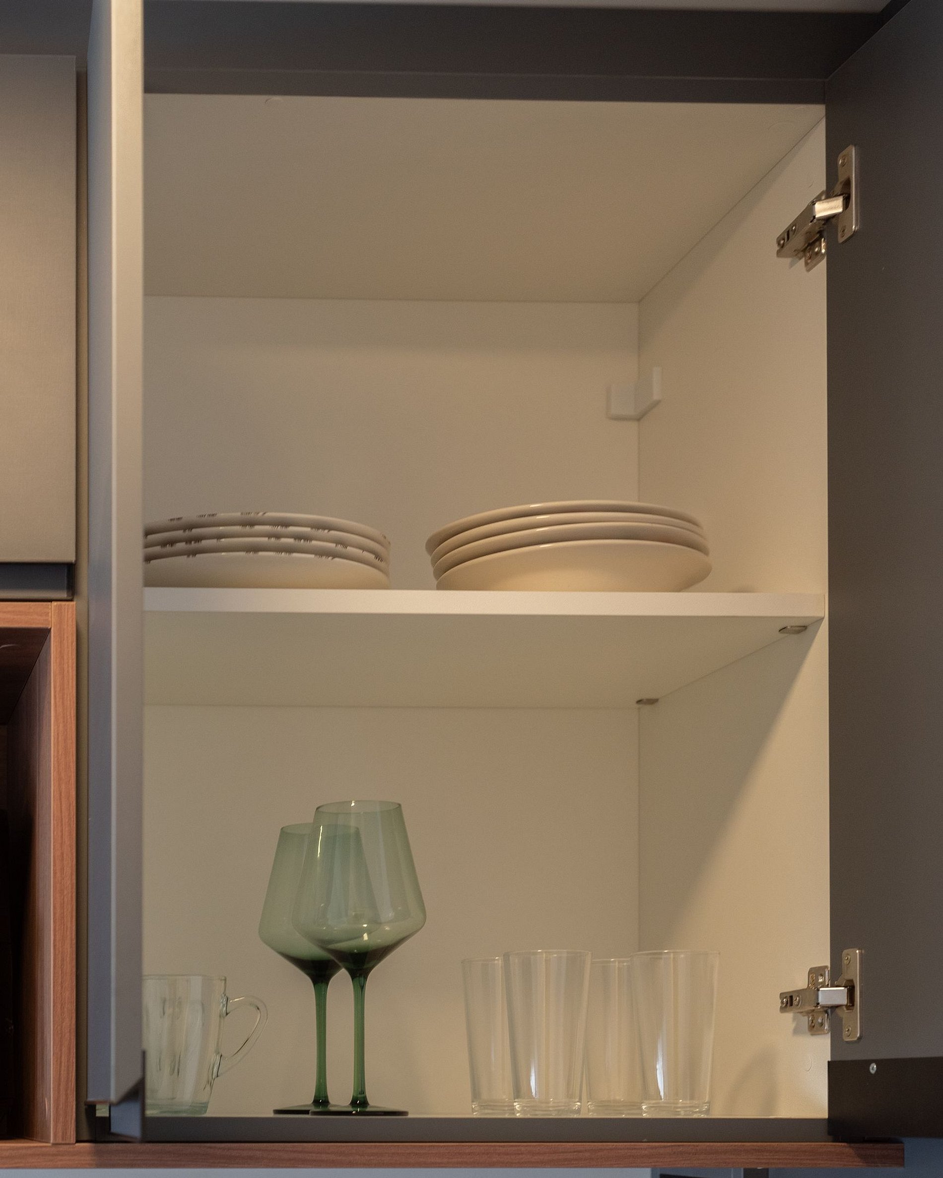 Pots, glasses, wine glasses, plates, cutlery, and basic kitchen utensils