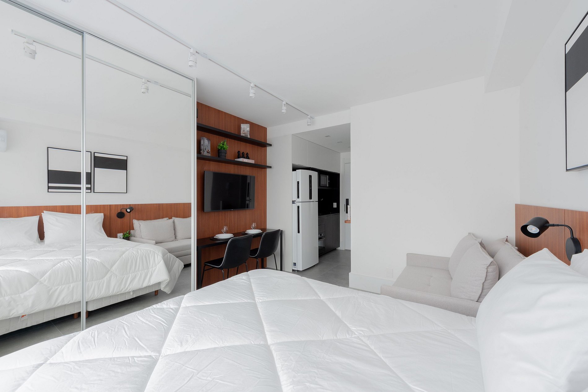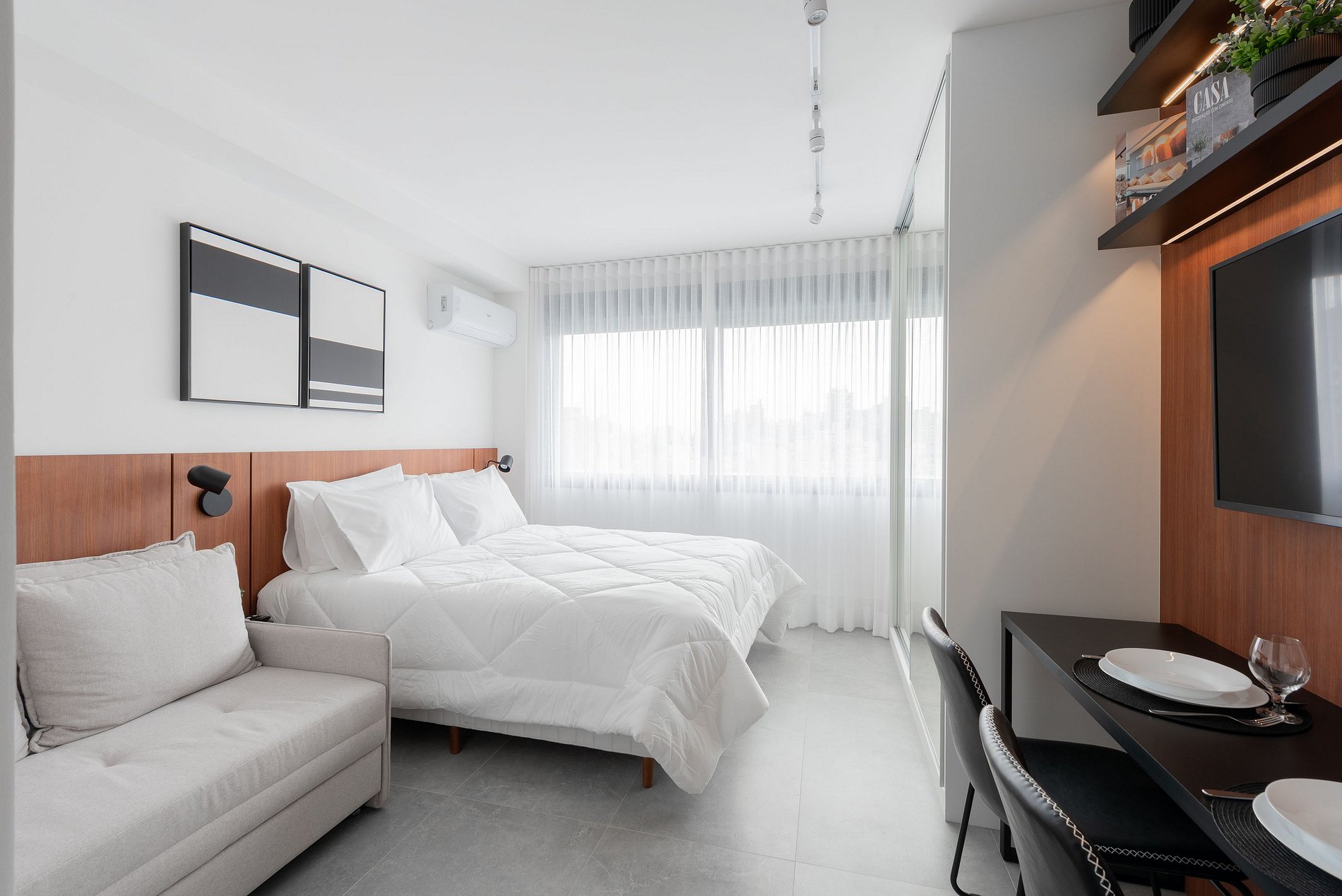 Studio Denver is an urban retreat in the elegant Bela Vista neighborhood, inside Skyline Park Moinhos. Inspired by the spirit of great cities and the calm of the mountains, it blends design and comfort in a space with a fully equipped kitchen, fast Wi-Fi, queen bed, and hot and cold air conditioning. From above, it reveals an inspiring view of Porto Alegre, close to Moinhos de Vento Park.