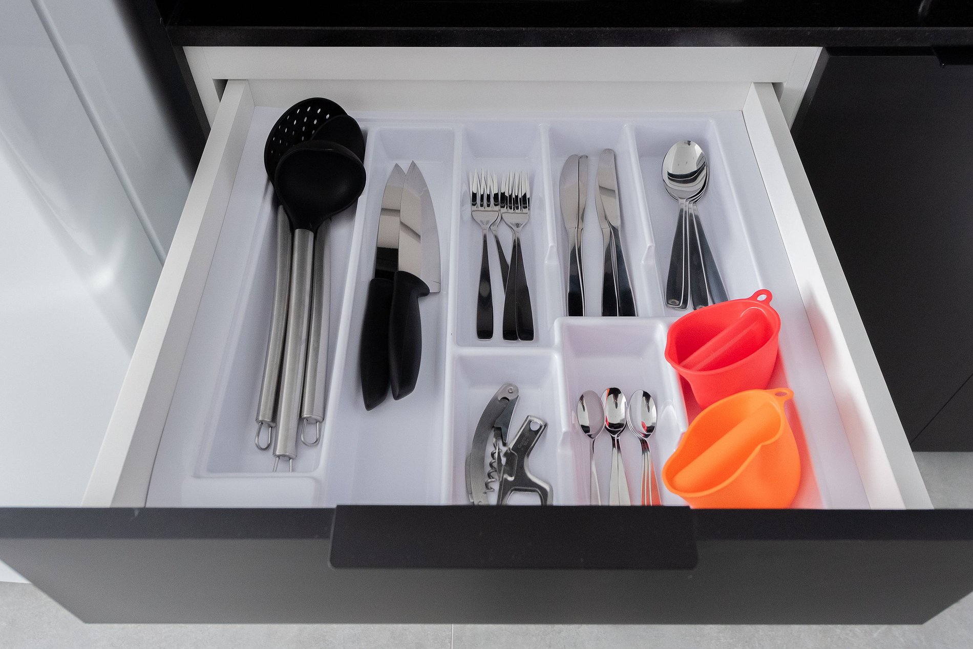 Pots, glasses, wine glasses, dishes, cutlery, and basic kitchen utensils