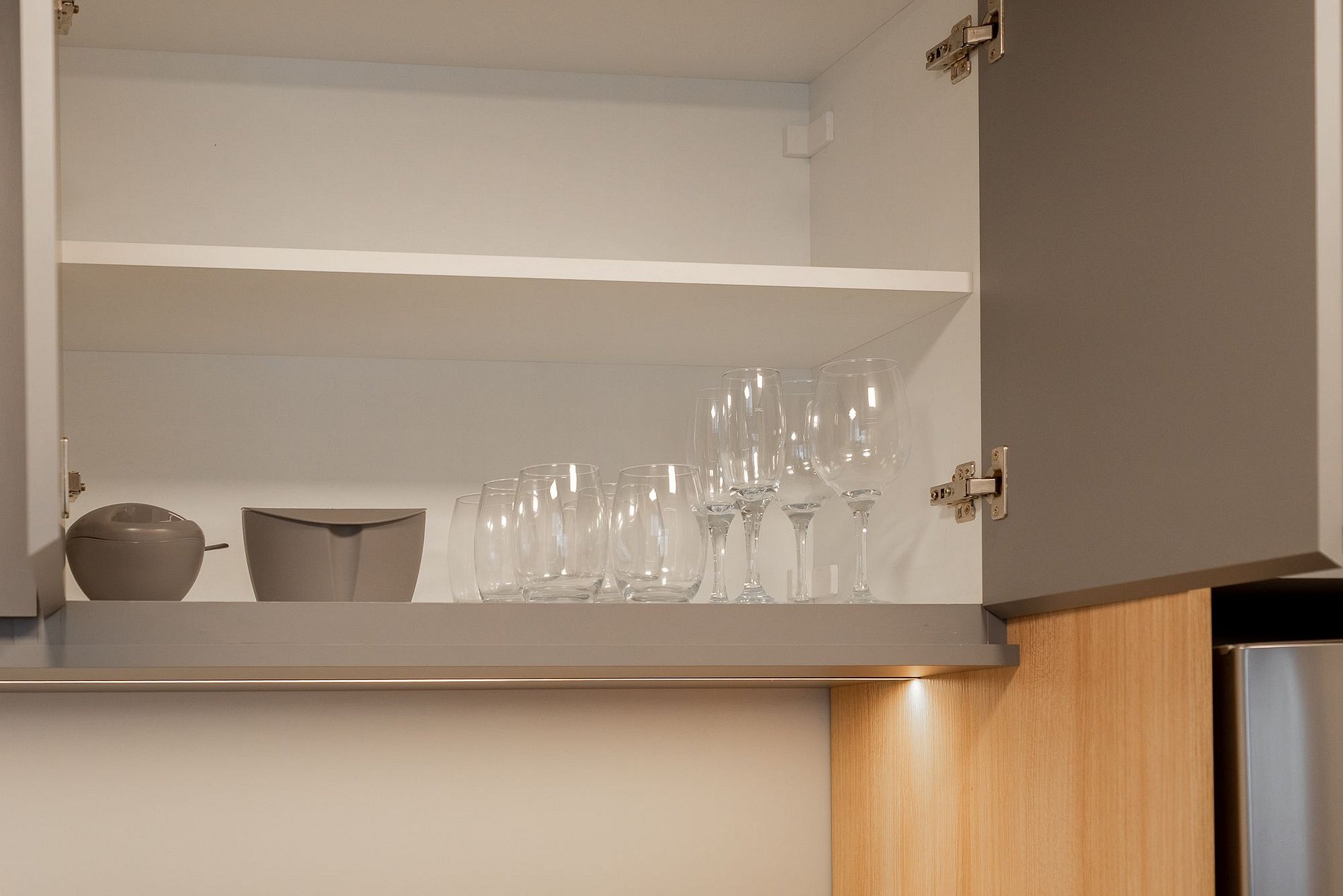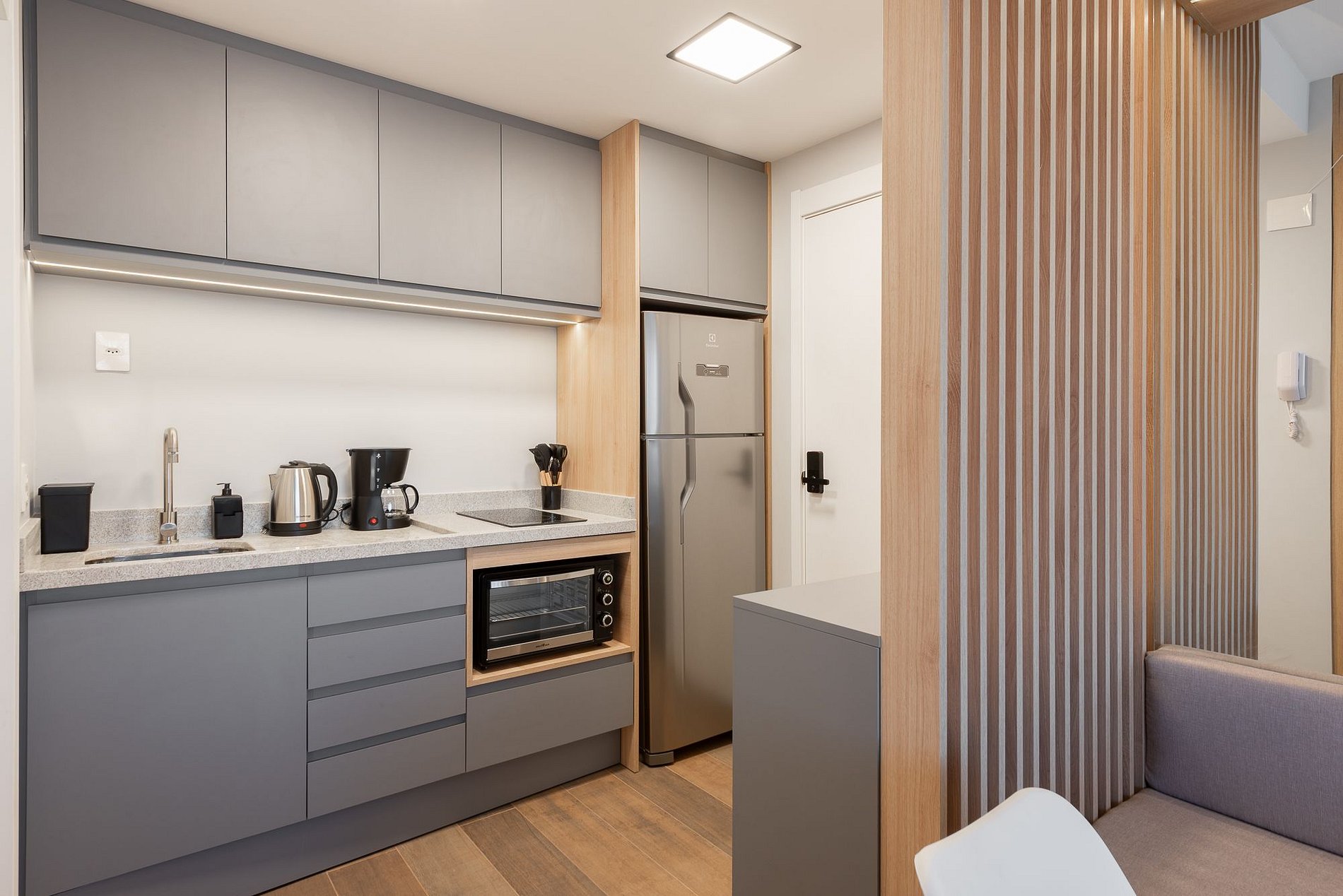 The Berlim apartment, located in the modern Skyline condominium in Porto Alegre, combines contemporary design and functionality. With an integrated layout, it features a fully equipped kitchen, workspace, double bed, and cozy sofa. The decor blends wood tones and gray for a sophisticated, welcoming feel — perfect for guests seeking comfort, convenience, and easy access to the city’s main areas.