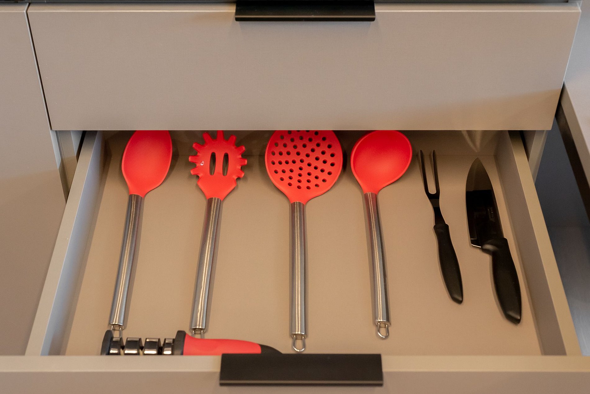 Ollas, copas, vasos, vajilla, cubiertos y utensilios básicos de cocina