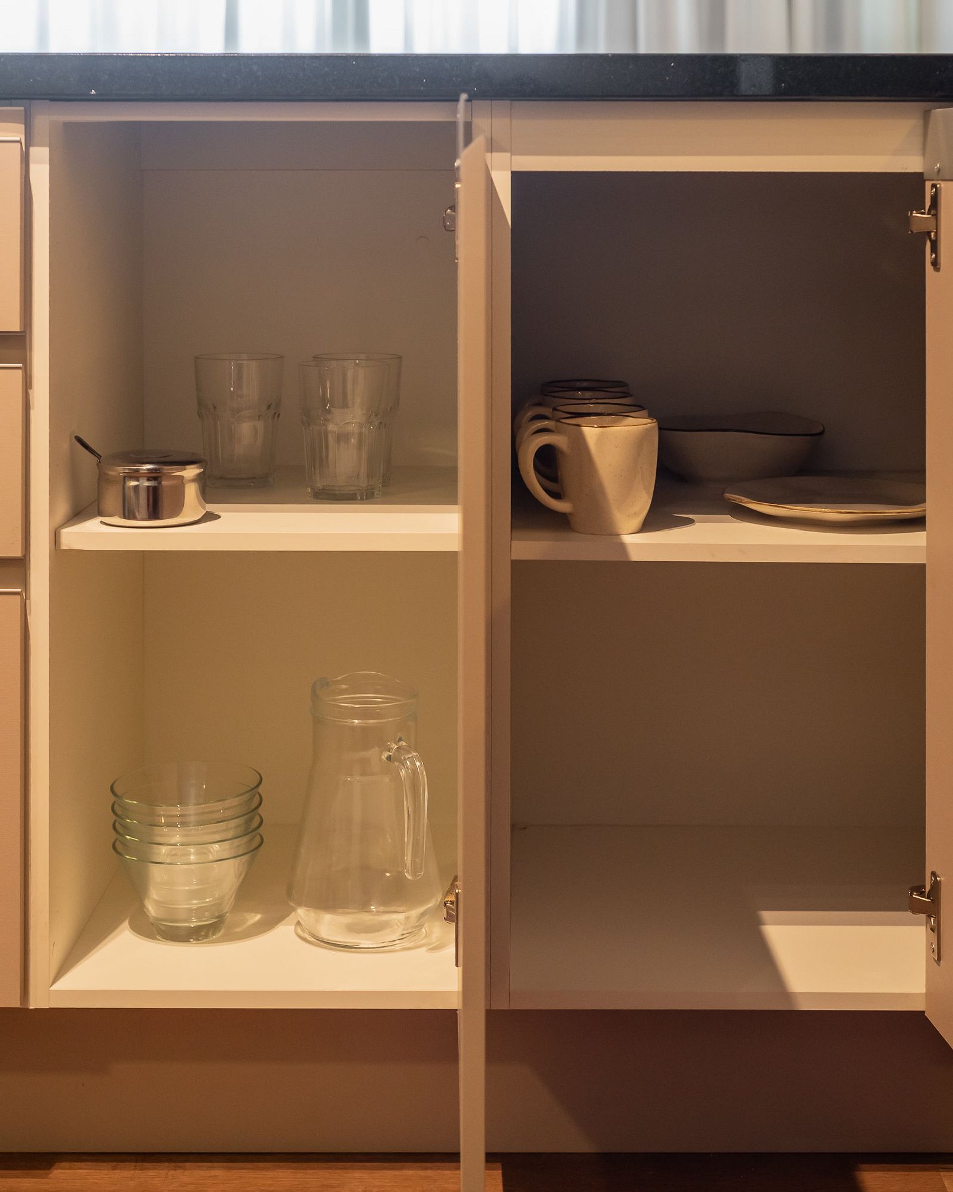 Cocina totalmente equipada con ollas, vasos, copas, vajilla, cubiertos y utensilios de cocina