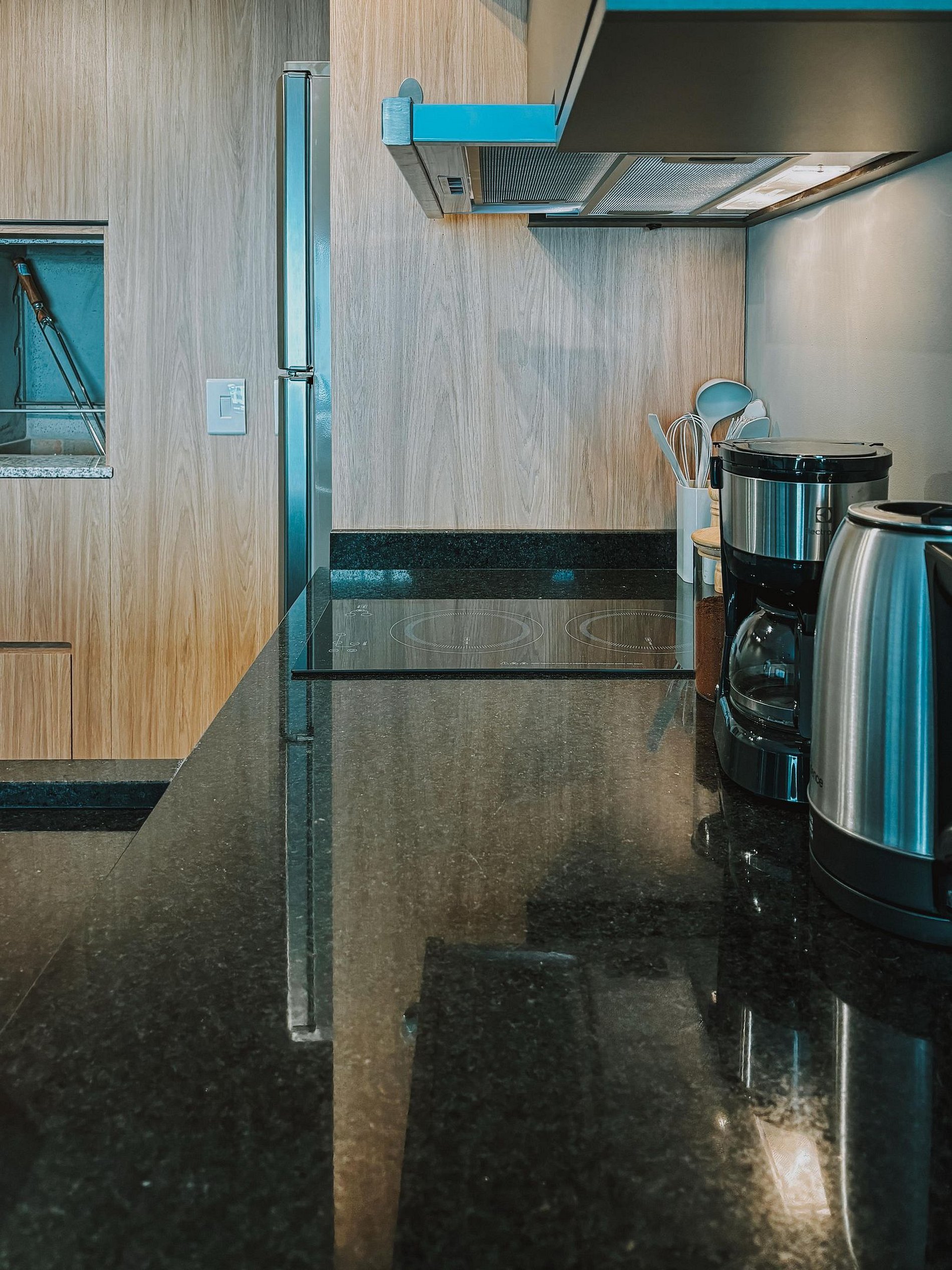 La cocina está totalmente equipada con refrigerador duplex, estufa de inducción de 2 bocas, microondas, horno, licuadora, tostadora, cafetera eléctrica, tetera eléctrica y parrilla con espeto, perfecta para momentos de ocio y convivencia.