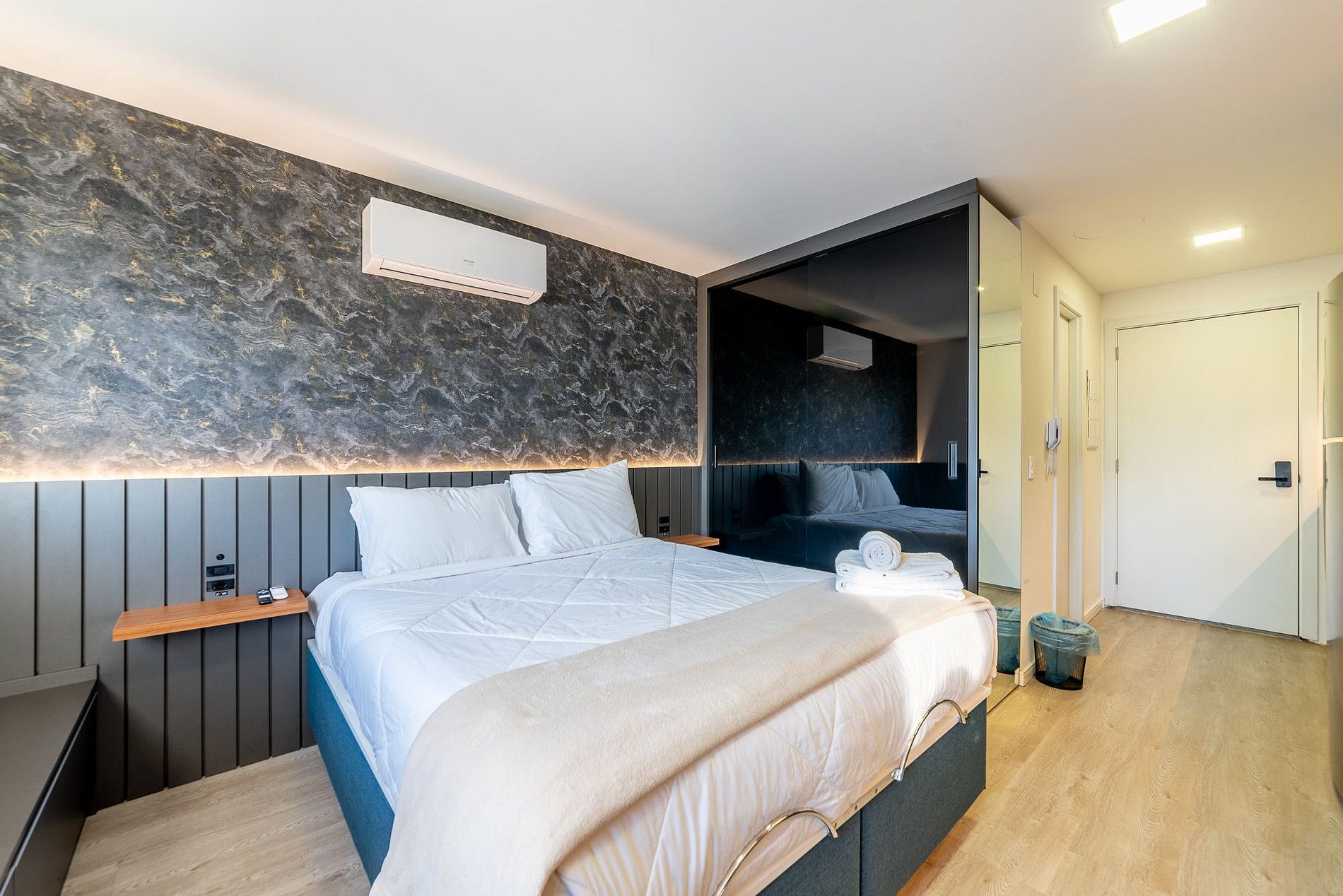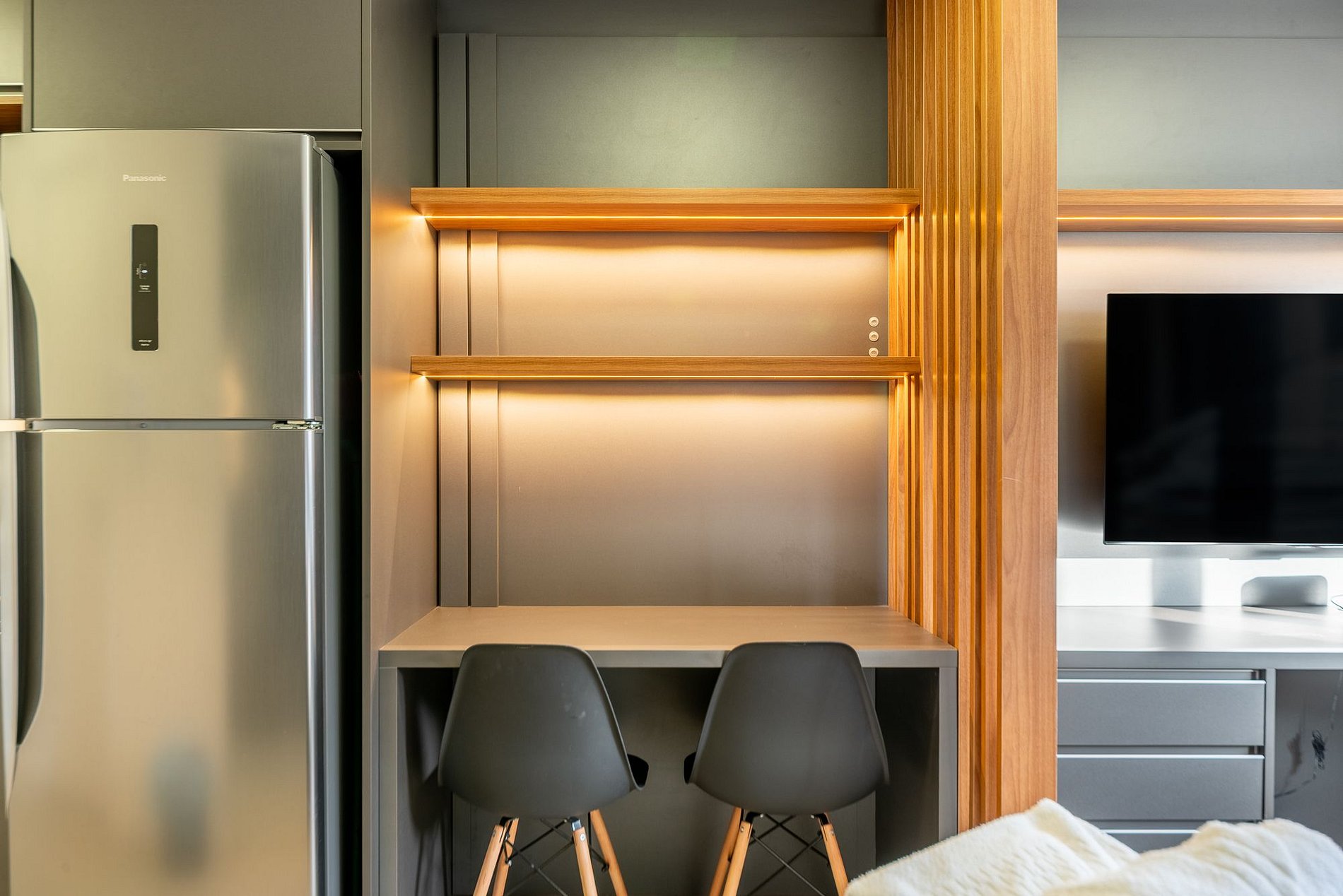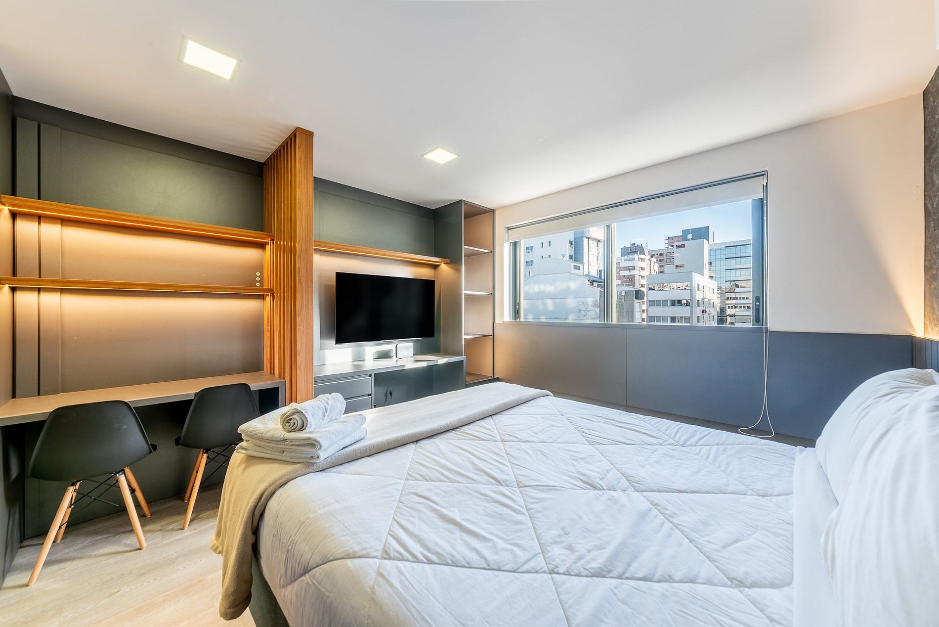 Moderno estudio en el 6º piso del edificio GO24, con una elegante decoración en negro y madera. Ideal para estancias prácticas y cómodas, con cama queen, cocina completa, Wi-Fi rápido y aire acondicionado. El edificio ofrece piscina en la azotea, gimnasio 24h, lavandería y espacio de coworking. Ubicado en la calle 24 de Outubro, en el barrio Auxiliadora, cerca de excelentes opciones gastronómicas, de compras y ocio. ¡Ven y disfruta la experiencia!