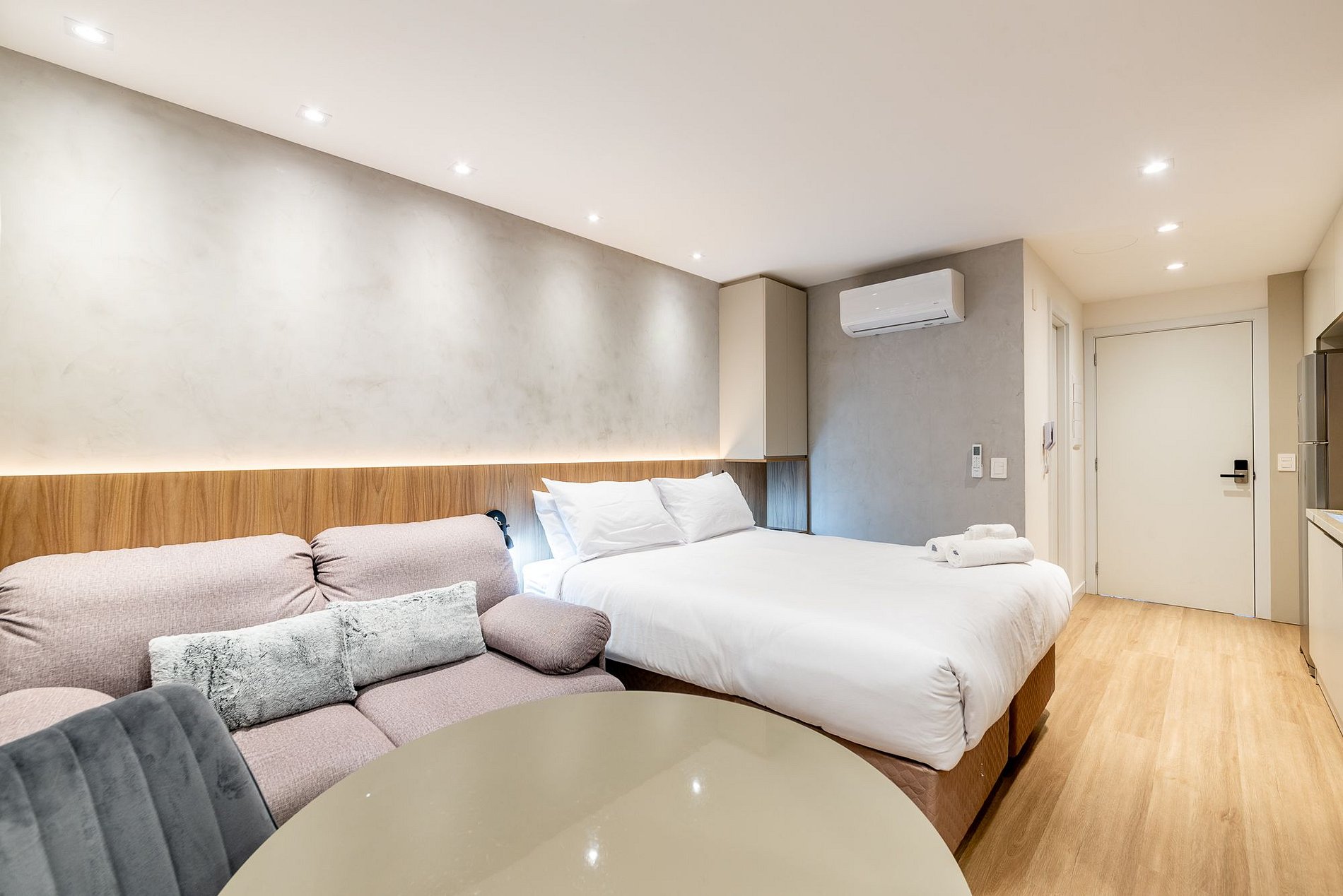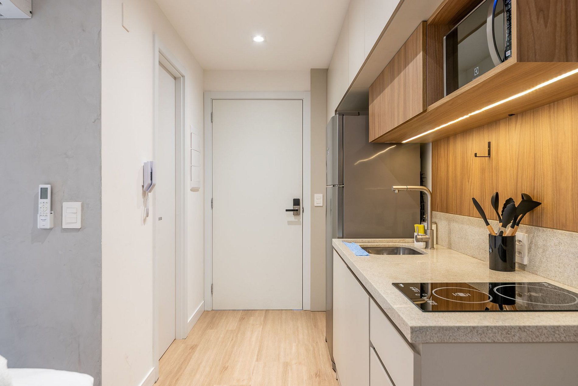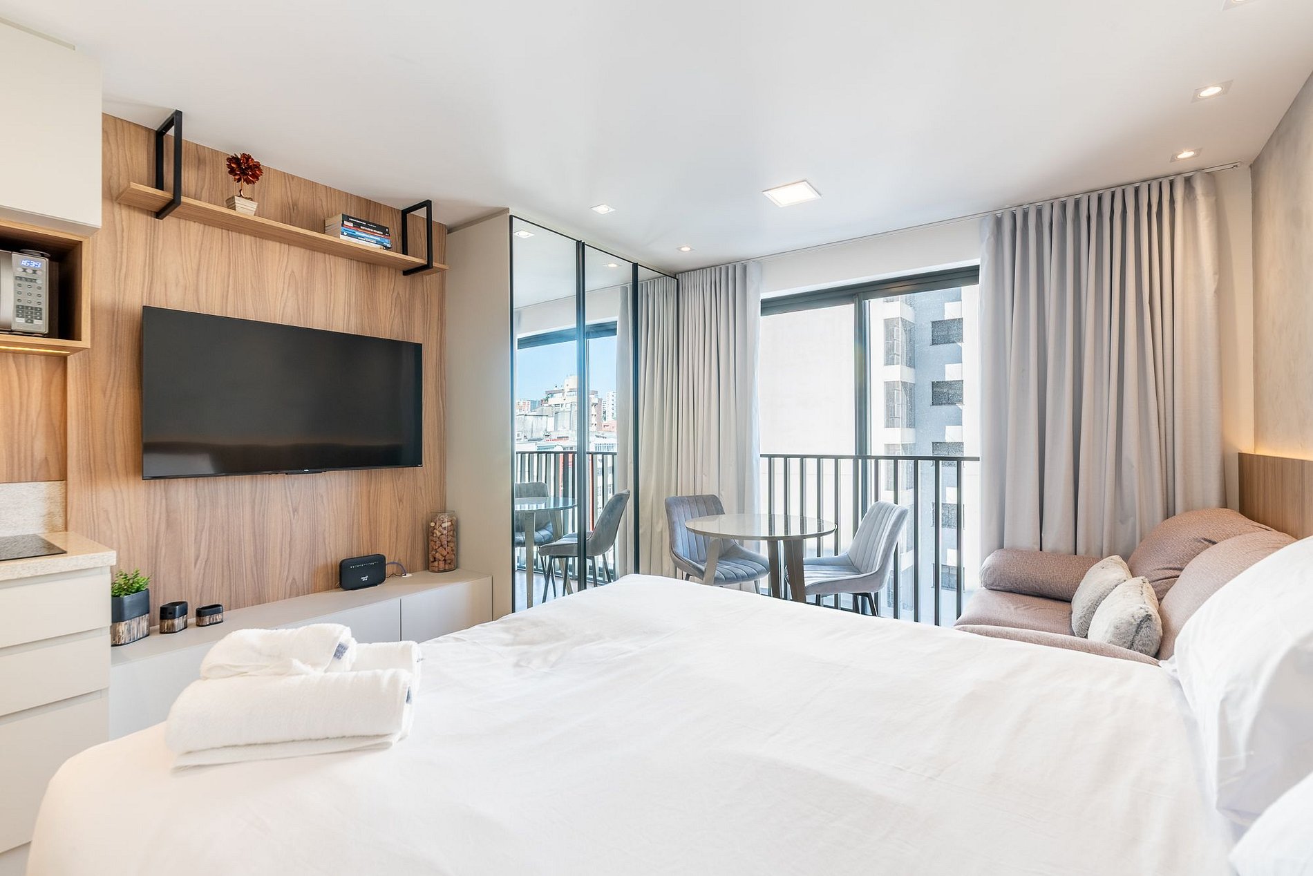 Moderno estudio en el 9º piso del edificio GO24, con una elegante decoración en negro y madera. Ideal para estancias prácticas y cómodas, con cama queen, cocina completa, Wi-Fi rápido y aire acondicionado. El edificio ofrece piscina en la azotea, gimnasio 24h, lavandería y espacio de coworking. Ubicado en la calle 24 de Outubro, en el barrio Auxiliadora, cerca de excelentes opciones gastronómicas, de compras y ocio. ¡Ven y disfruta la experiencia!