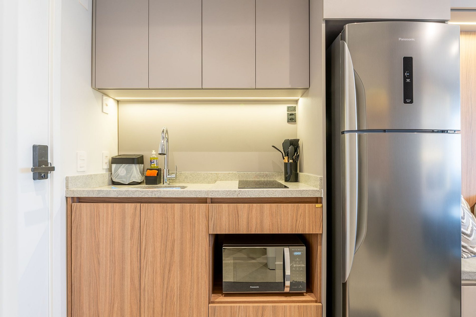 Microondas, cocina de inducción (2 fuegos), cafetera eléctrica, airfryer, licuadora, tostadora y refrigerador