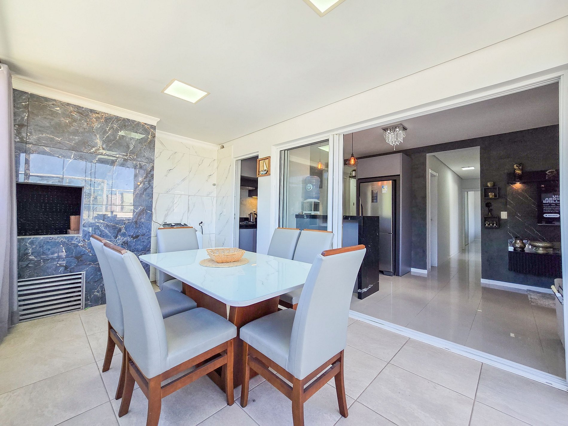 - Espaço de jantar com mesa e cadeiras, churrasqueira;