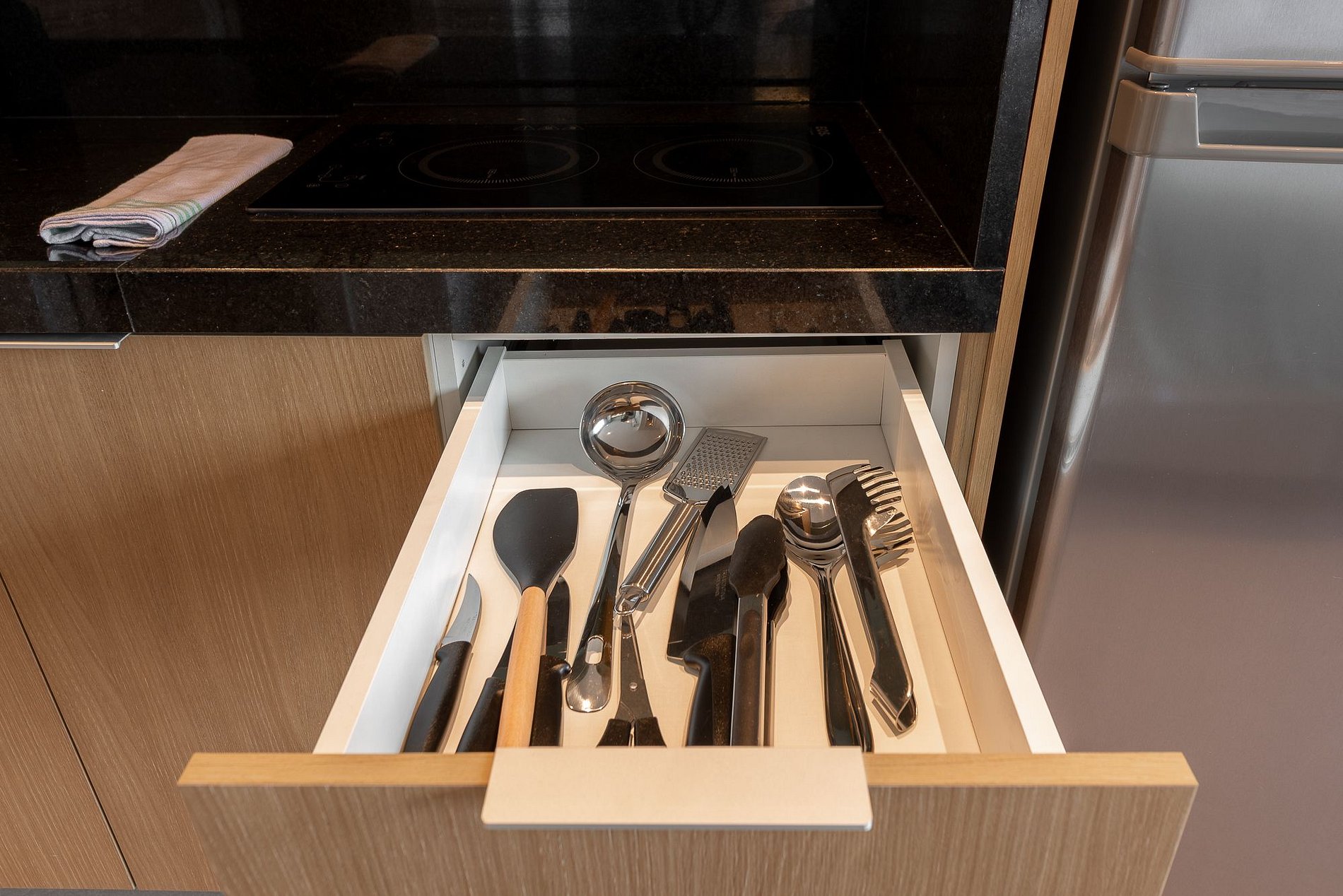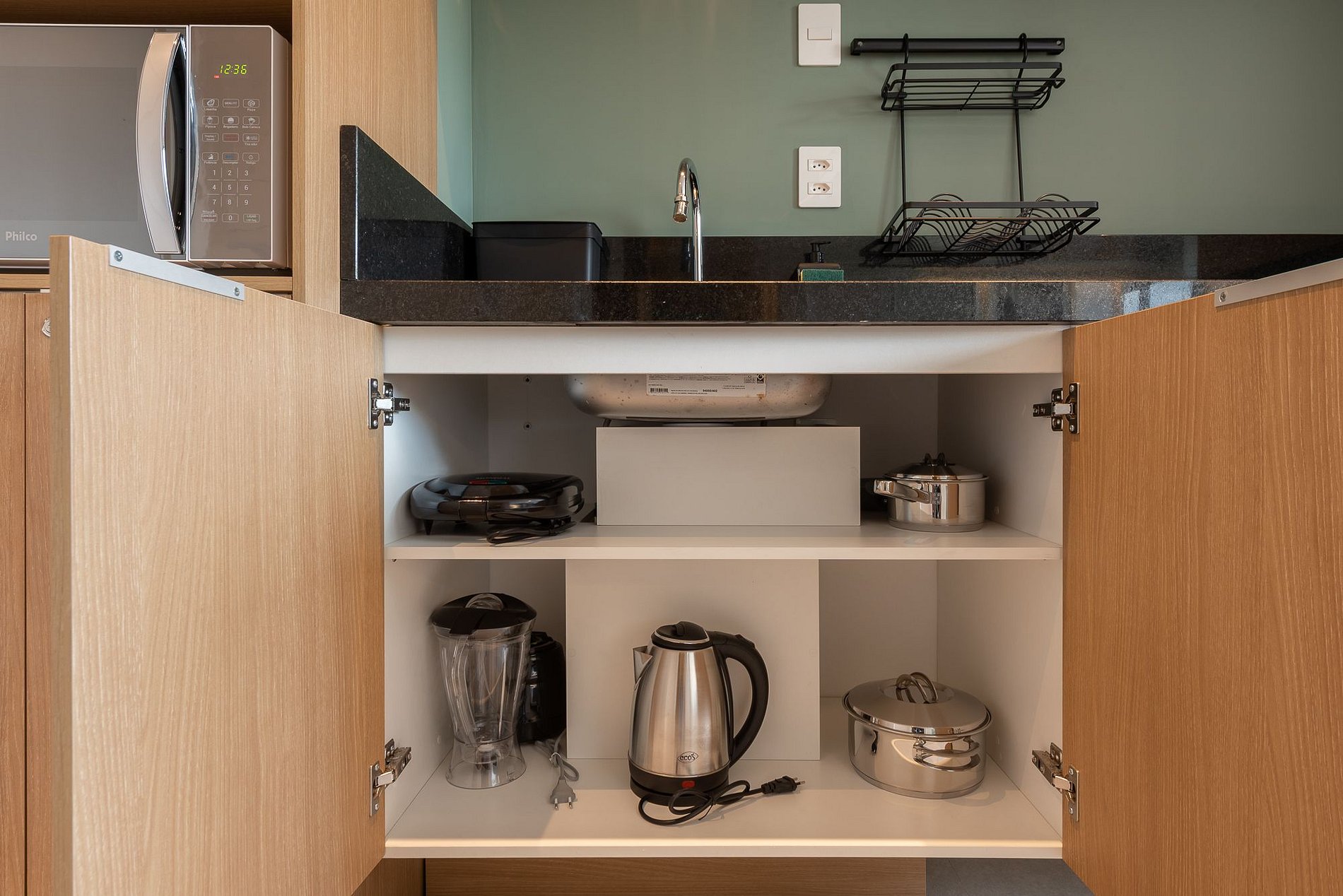 Panelas, copos, taças, louças, talheres e utensílios básicos de cozinha