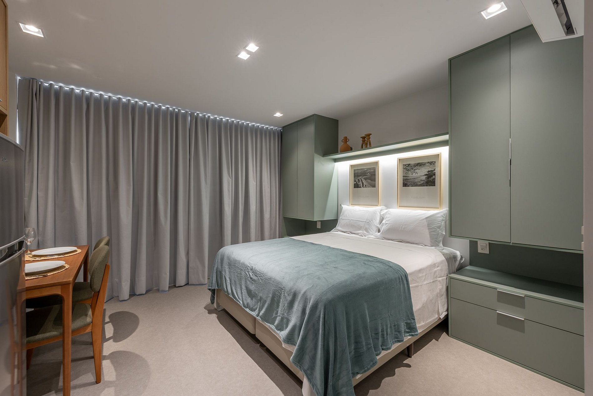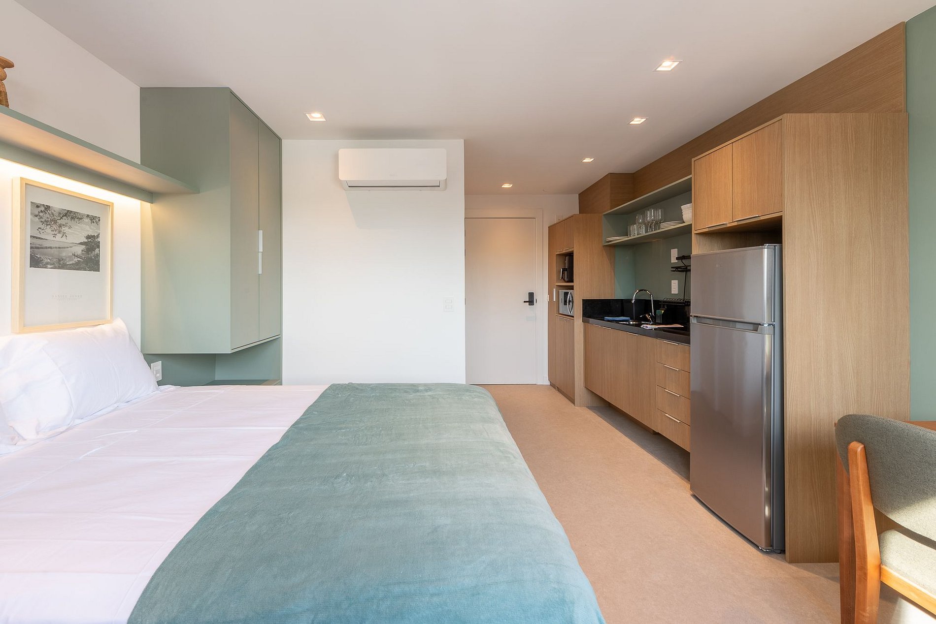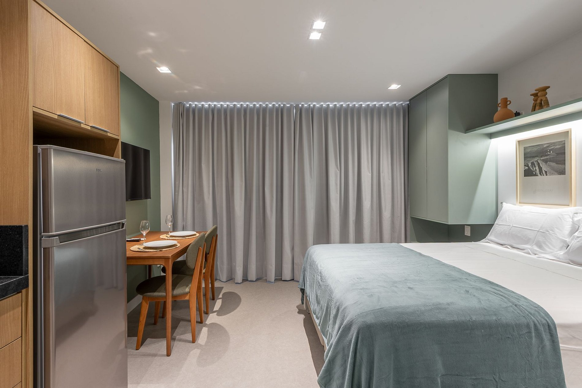 O Studio Oliva une conforto, praticidade e design em tons verdes suaves no coração do bairro Boa Vista. Localizado no moderno GO Carlos Gomes, oferece cama de casal, cozinha completa, mesa para refeições ou home office e uma linda vista da cidade. Com acesso à piscina, academia, lavanderia e rooftop, é o refúgio ideal para quem busca bem-estar e conveniência em Porto Alegre.