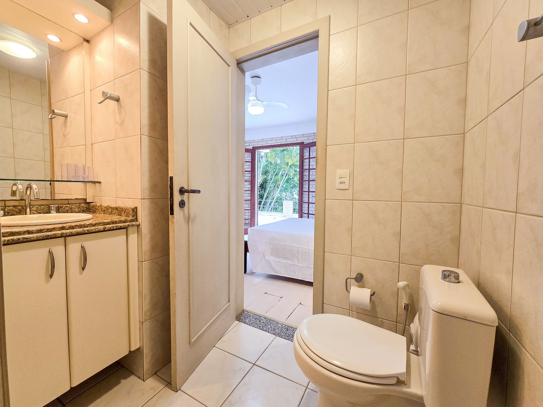 - um suíte equipada com cama casal, ar condicionado, ventilador, banheiro com chuveiro elétrico, roupas de cama e toalhas, armário para roupas, TV (não smart)