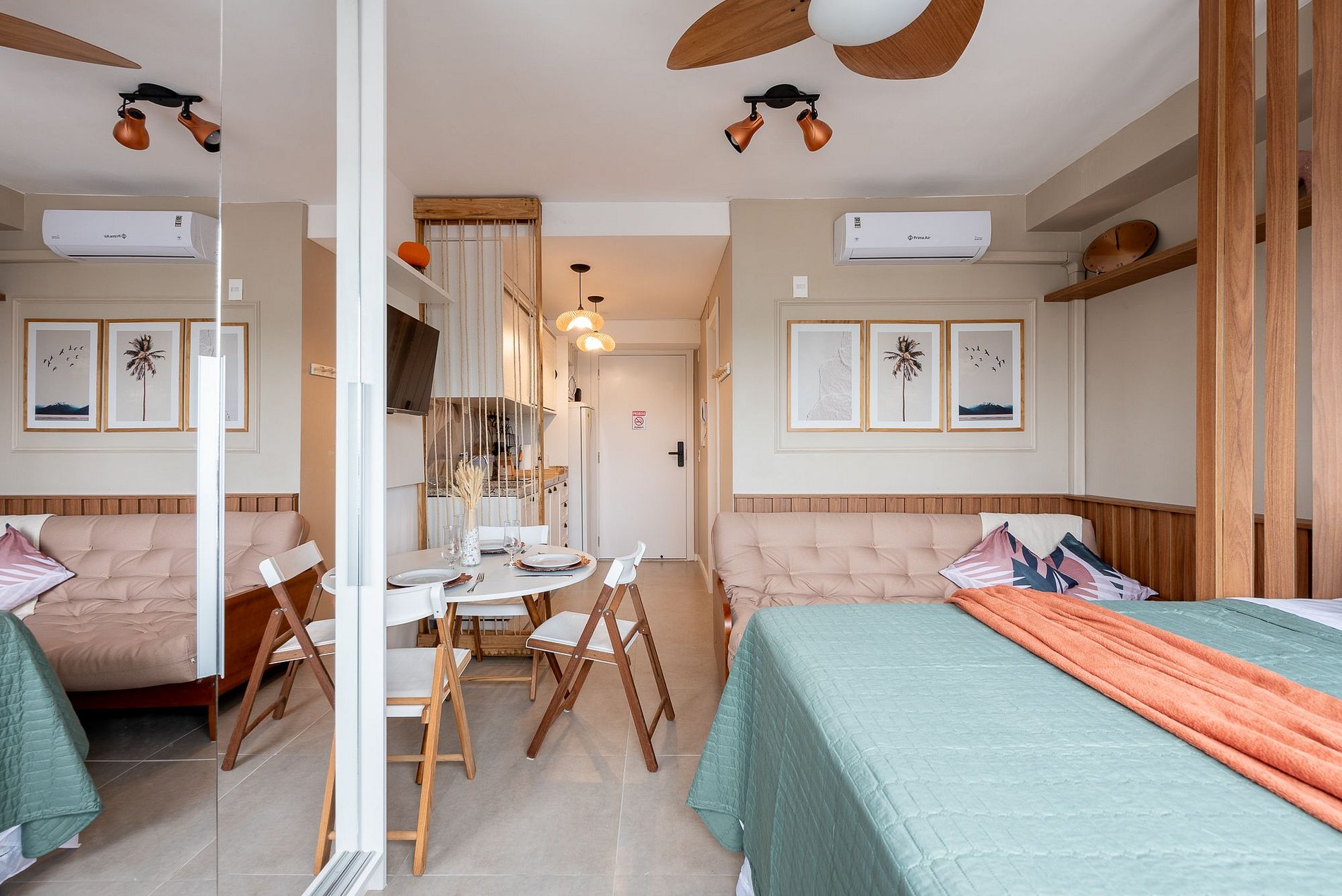 Importante: O apartamento é preparado para receber duas pessoas em cama de casal. Caso os hóspedes prefiram dormir separadamente, será necessário solicitar enxoval extra para o sofá-cama (ou cama auxiliar). Esse serviço pode ter custo adicional e precisa ser combinado antes da reserva.