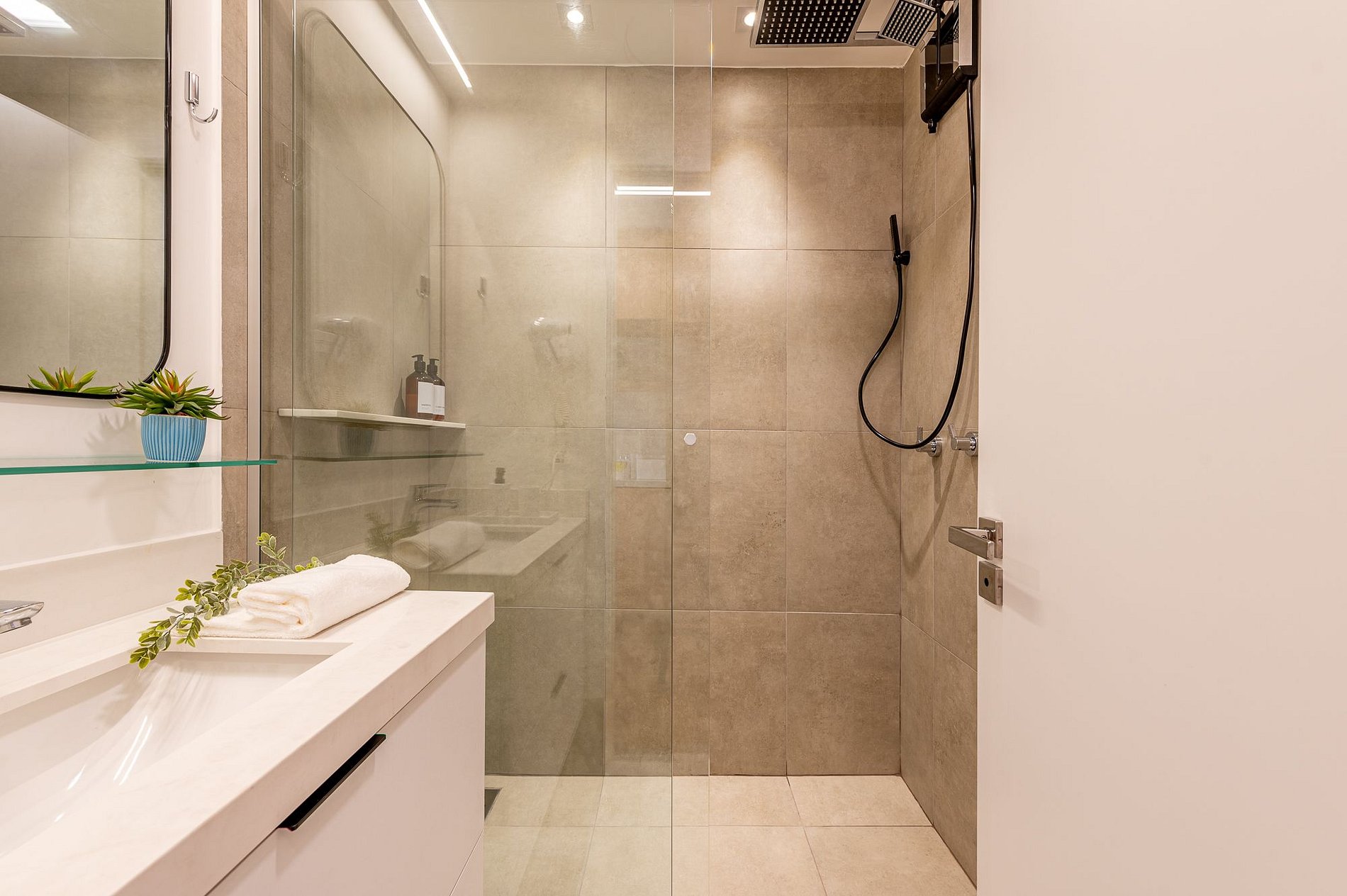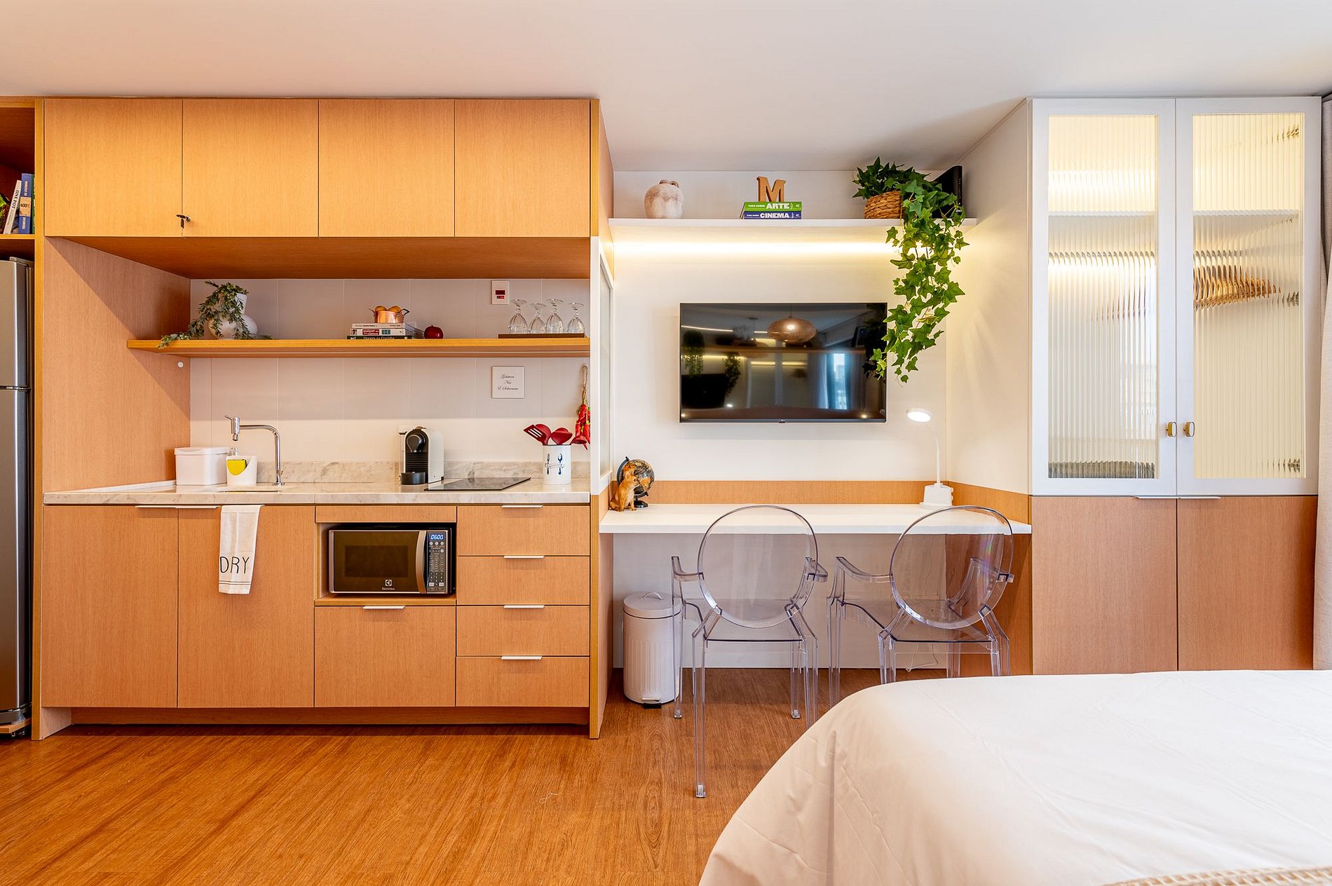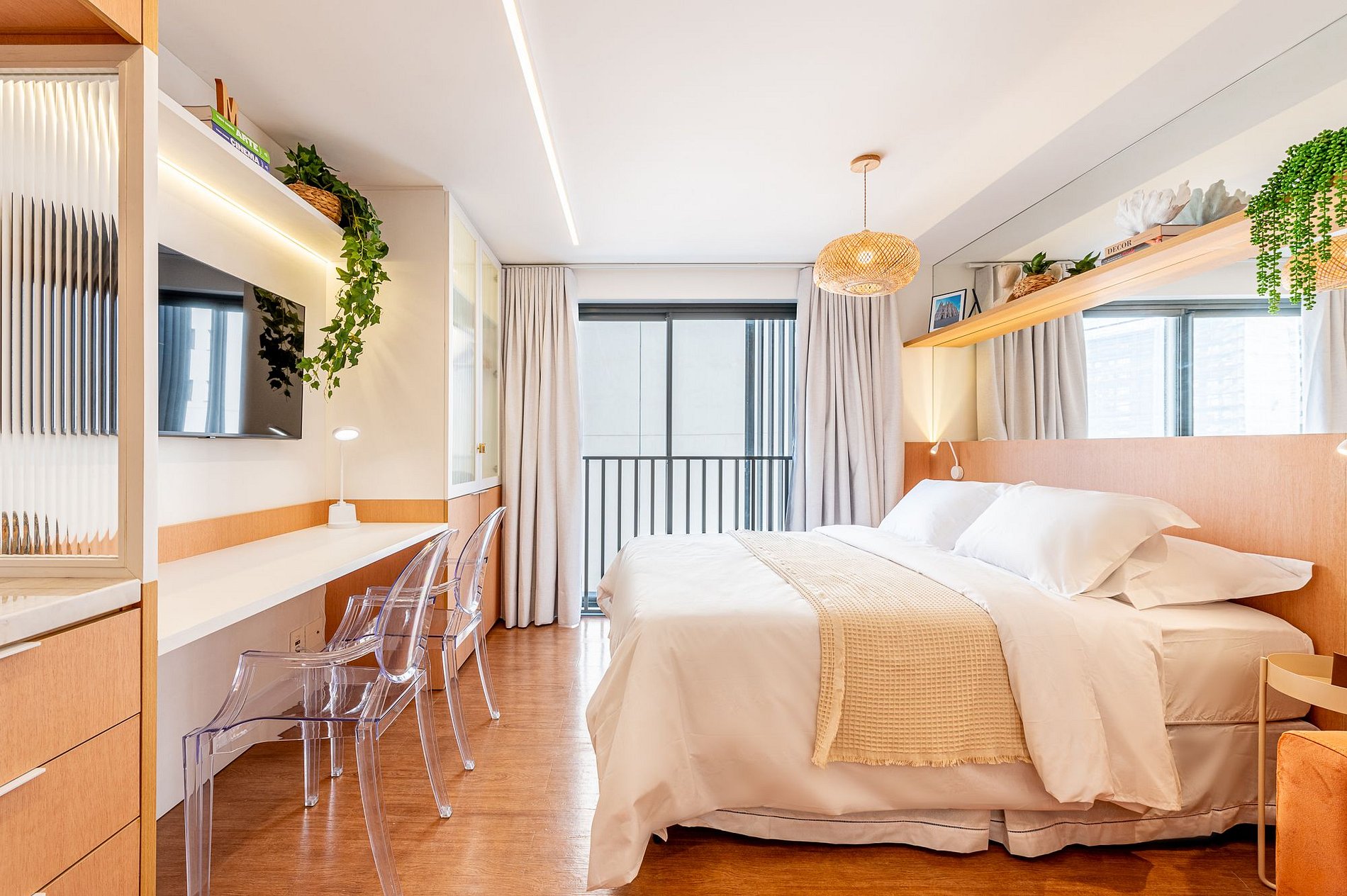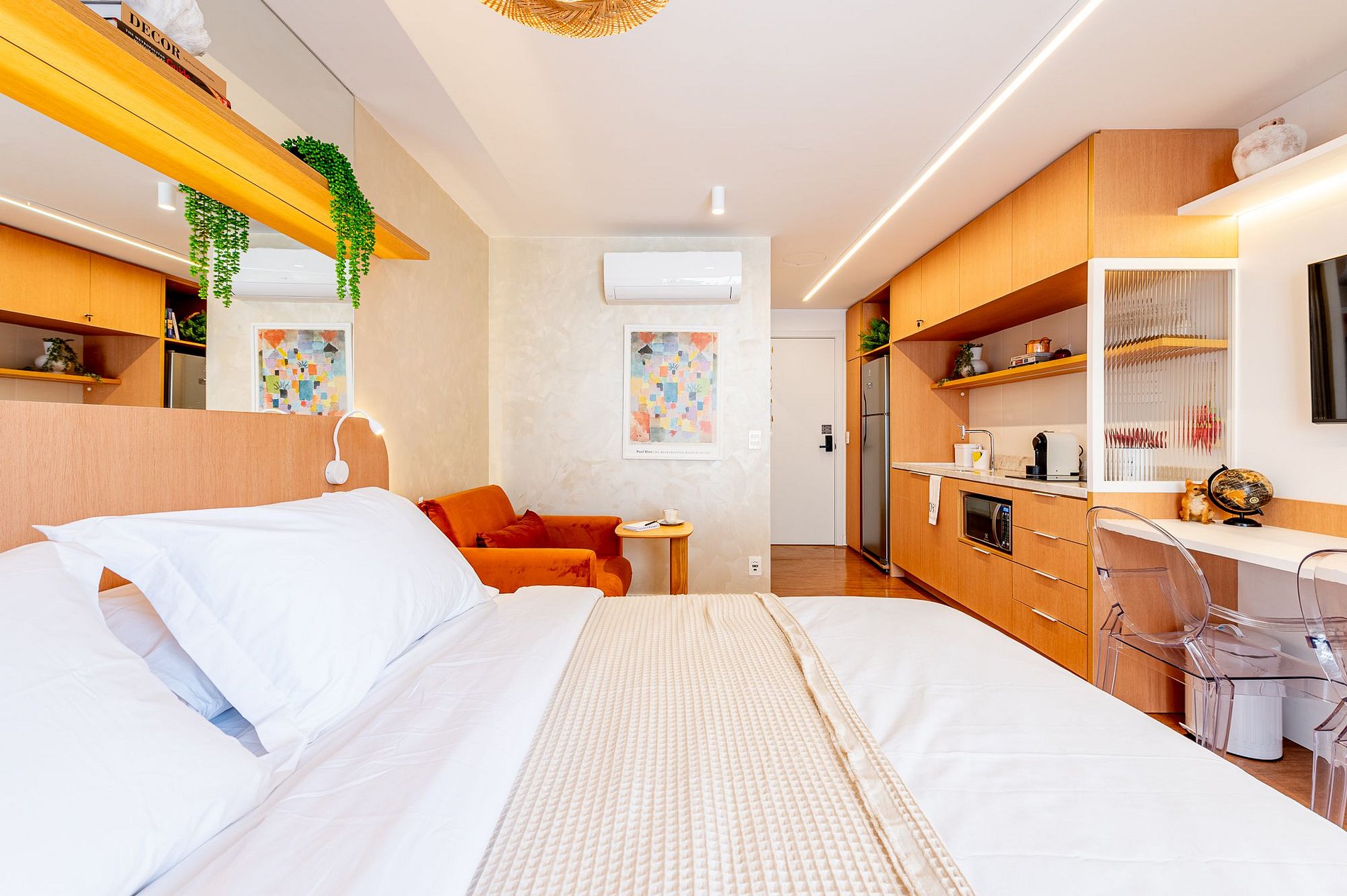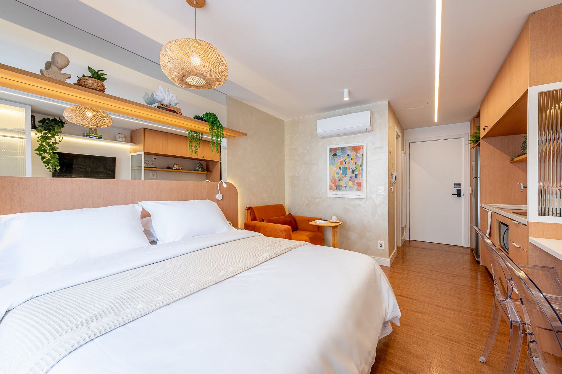 Prepare-se para uma estadia excepcional no Studio Milano, projetado para oferecer o máximo de conforto e praticidade. O ambiente combina um design moderno com uma atmosfera convidativa em tons claros e mármore branco, criando um cenário elegante para sua visita.