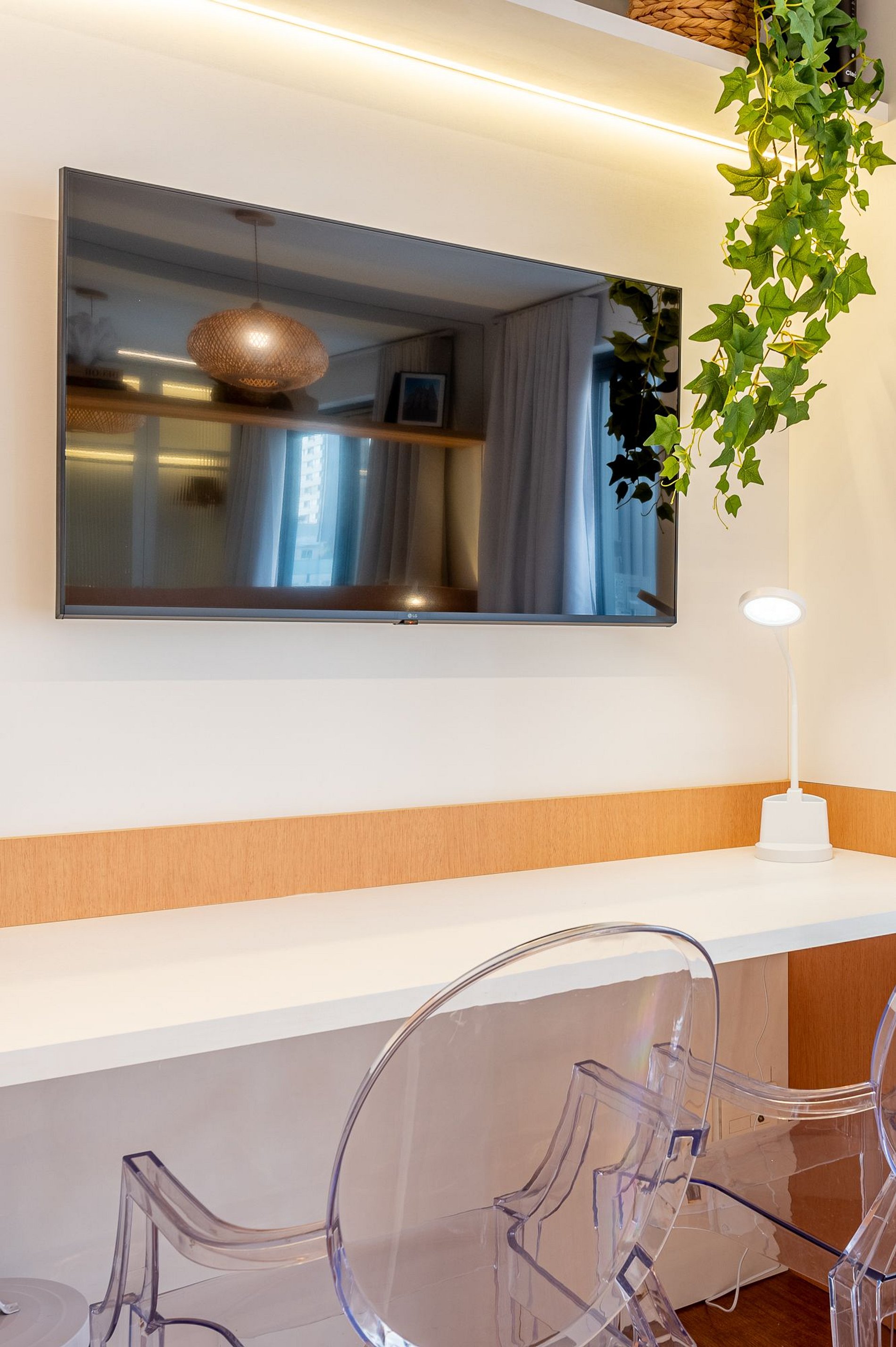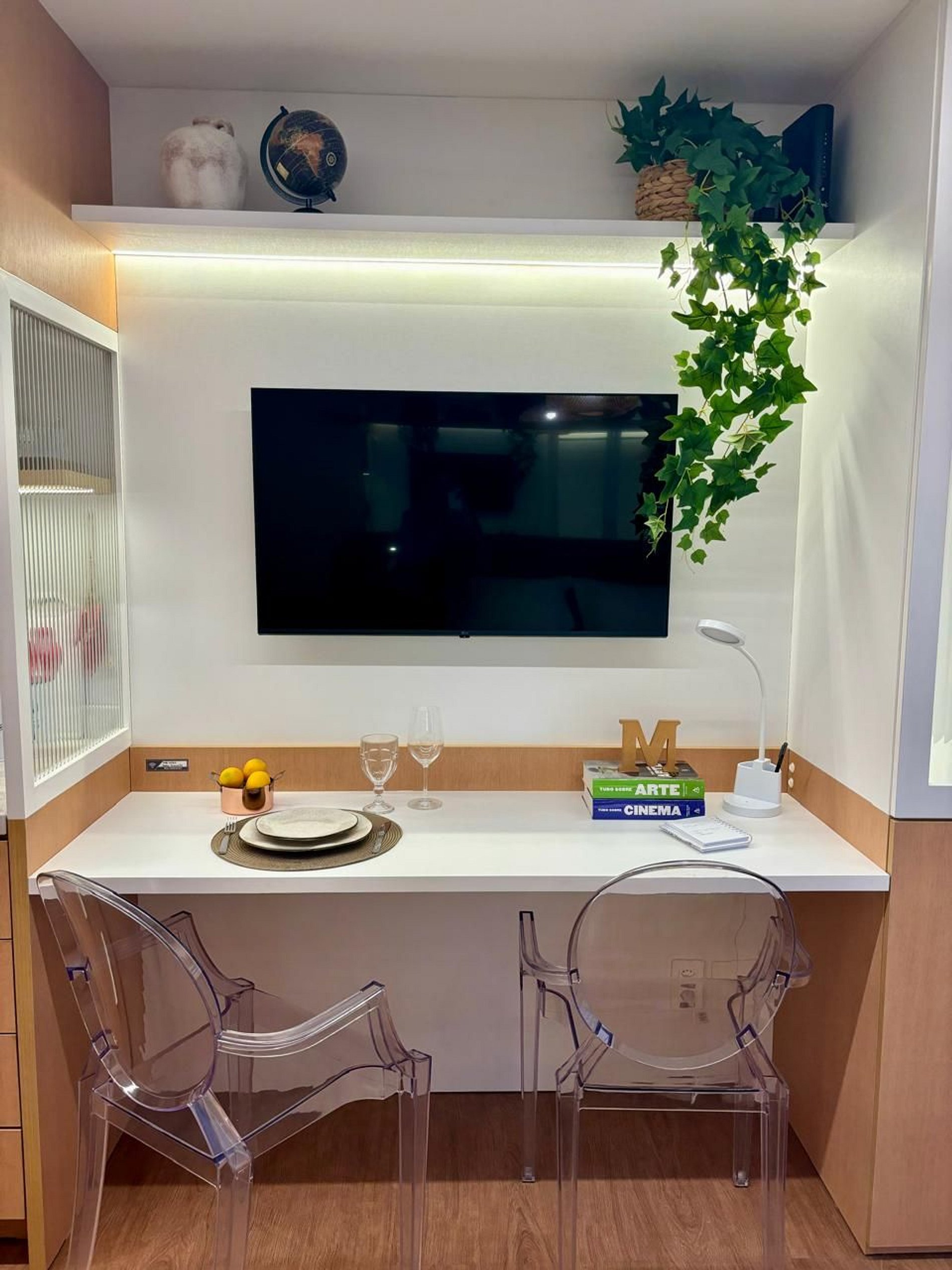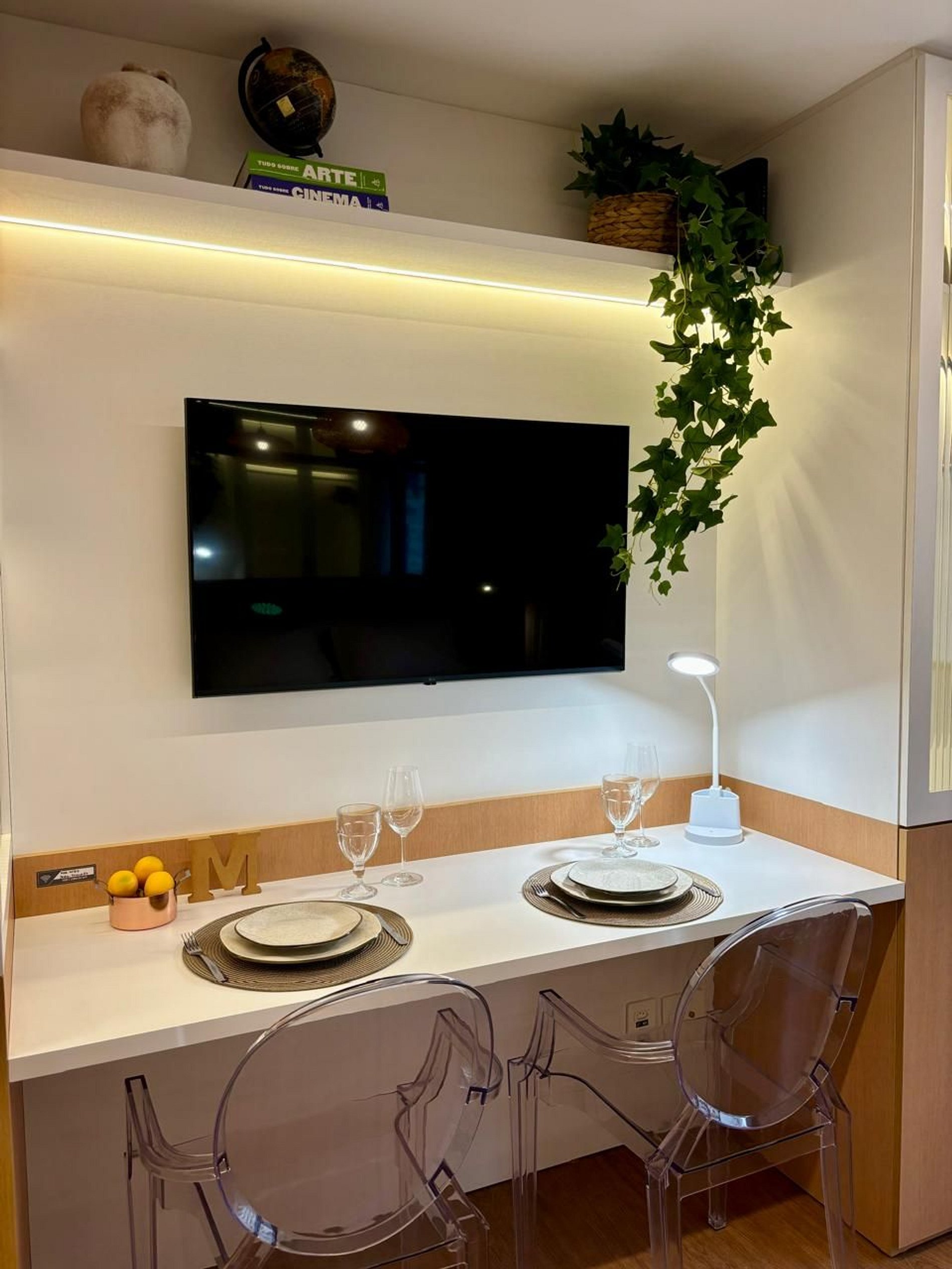 • Trabalho e Lazer: Para quem precisa trabalhar, oferecemos uma estação de trabalho dedicada. Para relaxar, uma Smart TV de 43 polegadas e Wi-Fi de alta velocidade estão à sua disposição.