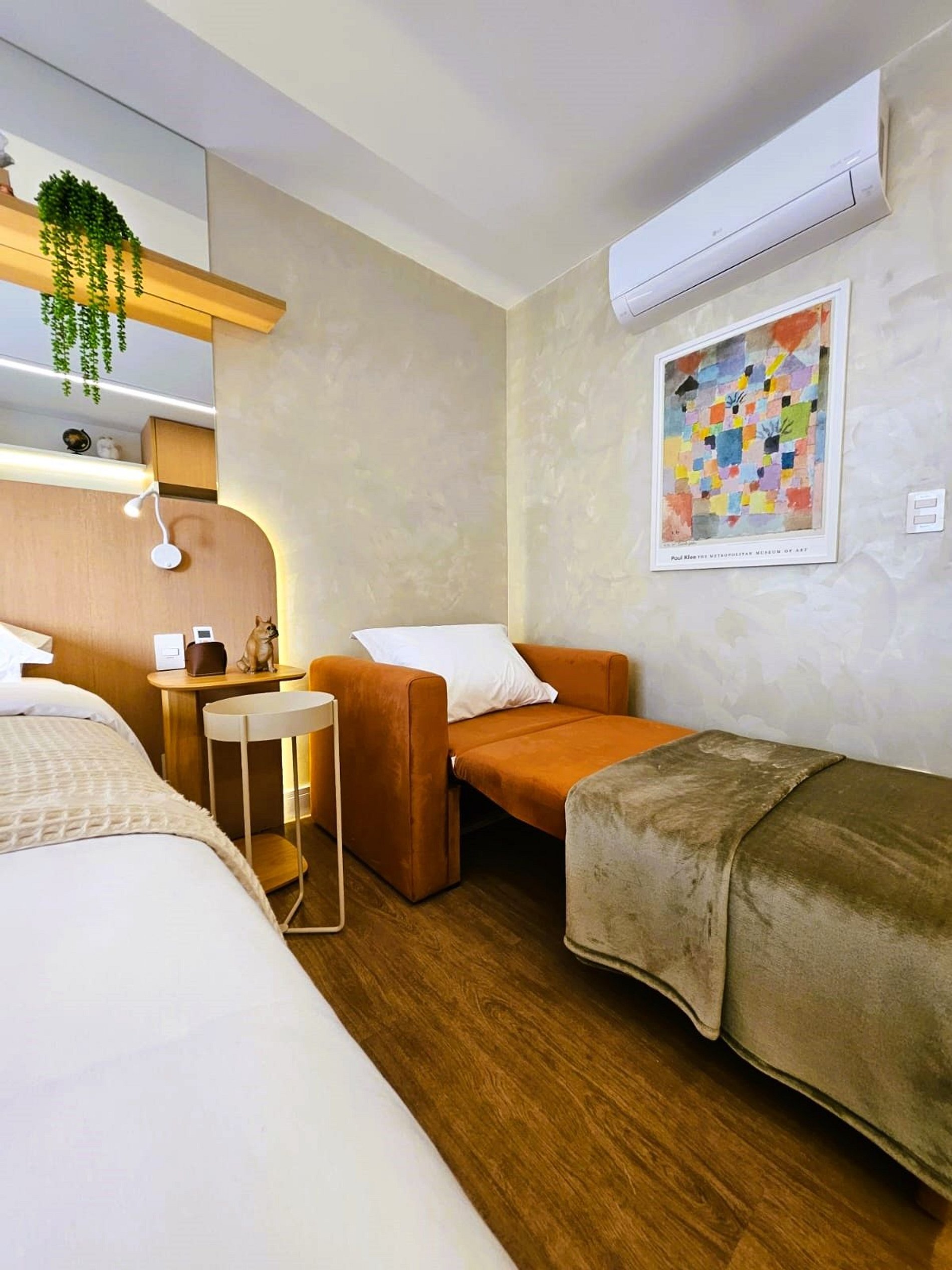 • Acomodações: Uma confortável cama queen-size com enxoval 100% algodão de 200 fios e um sofá-cama de solteiro garantem o descanso ideal para até 3 hóspedes.