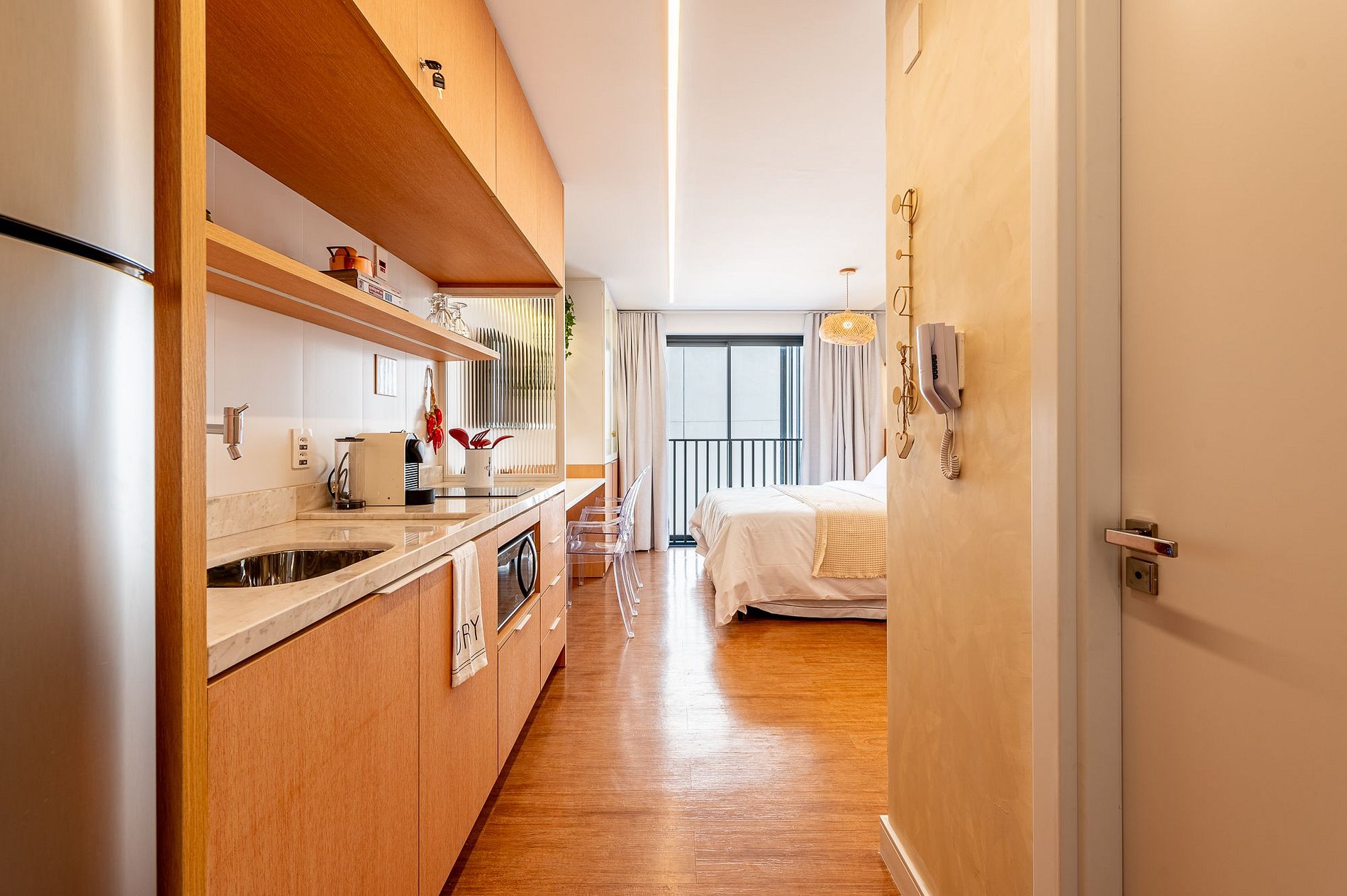 Sua reserva garante acesso privativo e exclusivo a todo o apartamento Studio Milano. O check-in é simplificado e seguro, realizado através de uma fechadura digital com senha individual, oferecendo total autonomia na sua chegada.