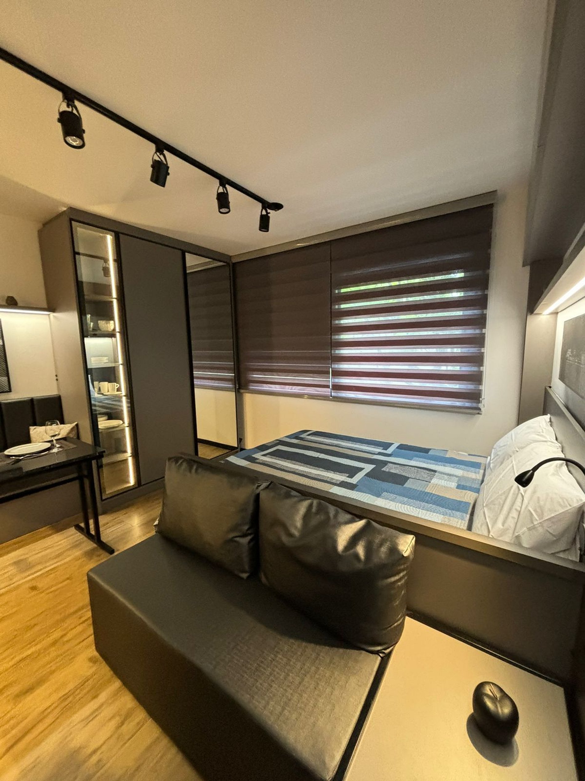 O apartamento conta com cama de casal, cozinha completa (equipada com utensílios, micro-ondas, cafeteira, cooktop e mais), e um banheiro privado com todos os amenities essenciais. Além disso, o studio oferece uma vaga de estacionamento exclusiva para sua comodidade.