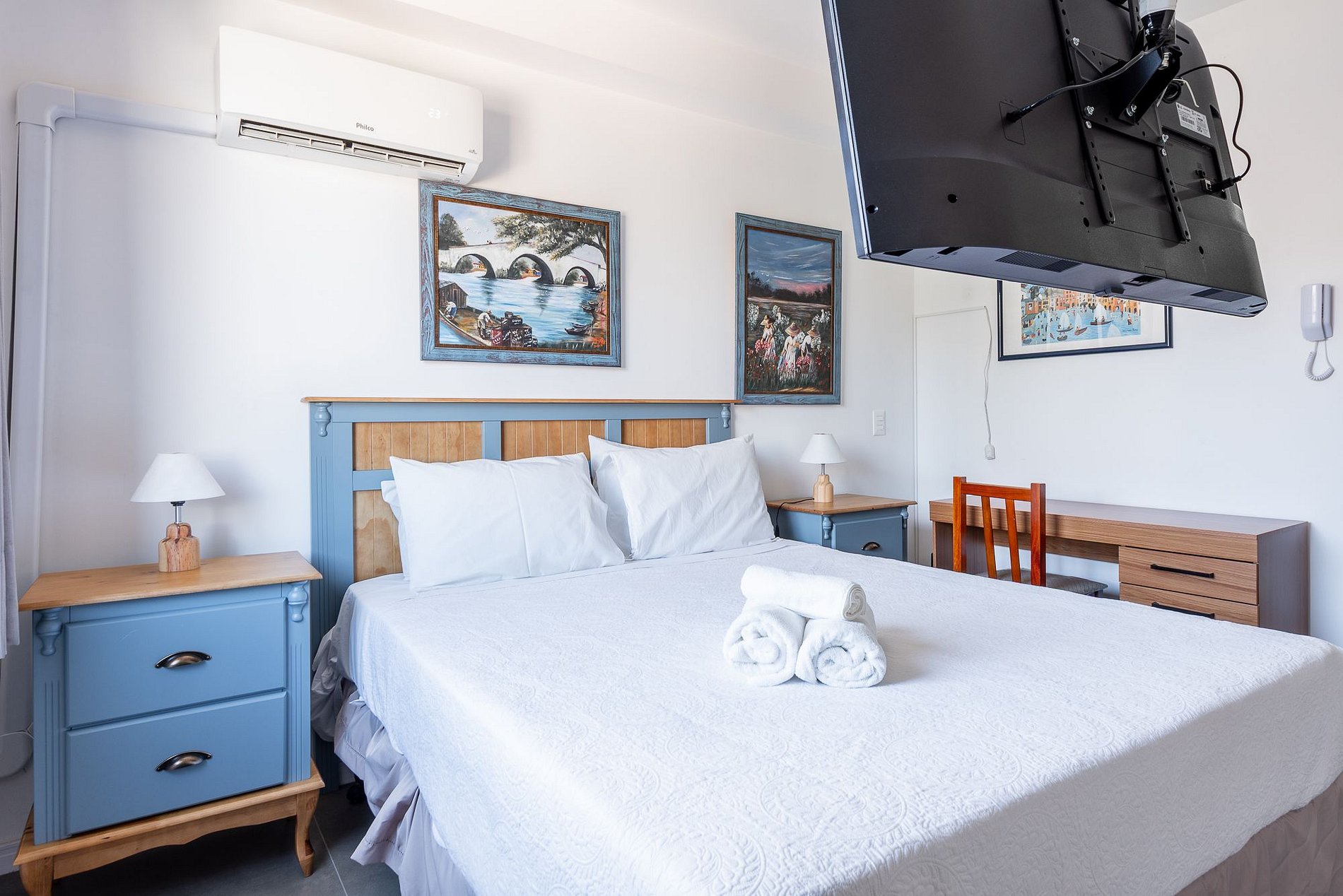 - Roupas de cama, travesseiros, coberta, toalhas e amenities (shampoo, condicionador, sabonete e papel higiênico)