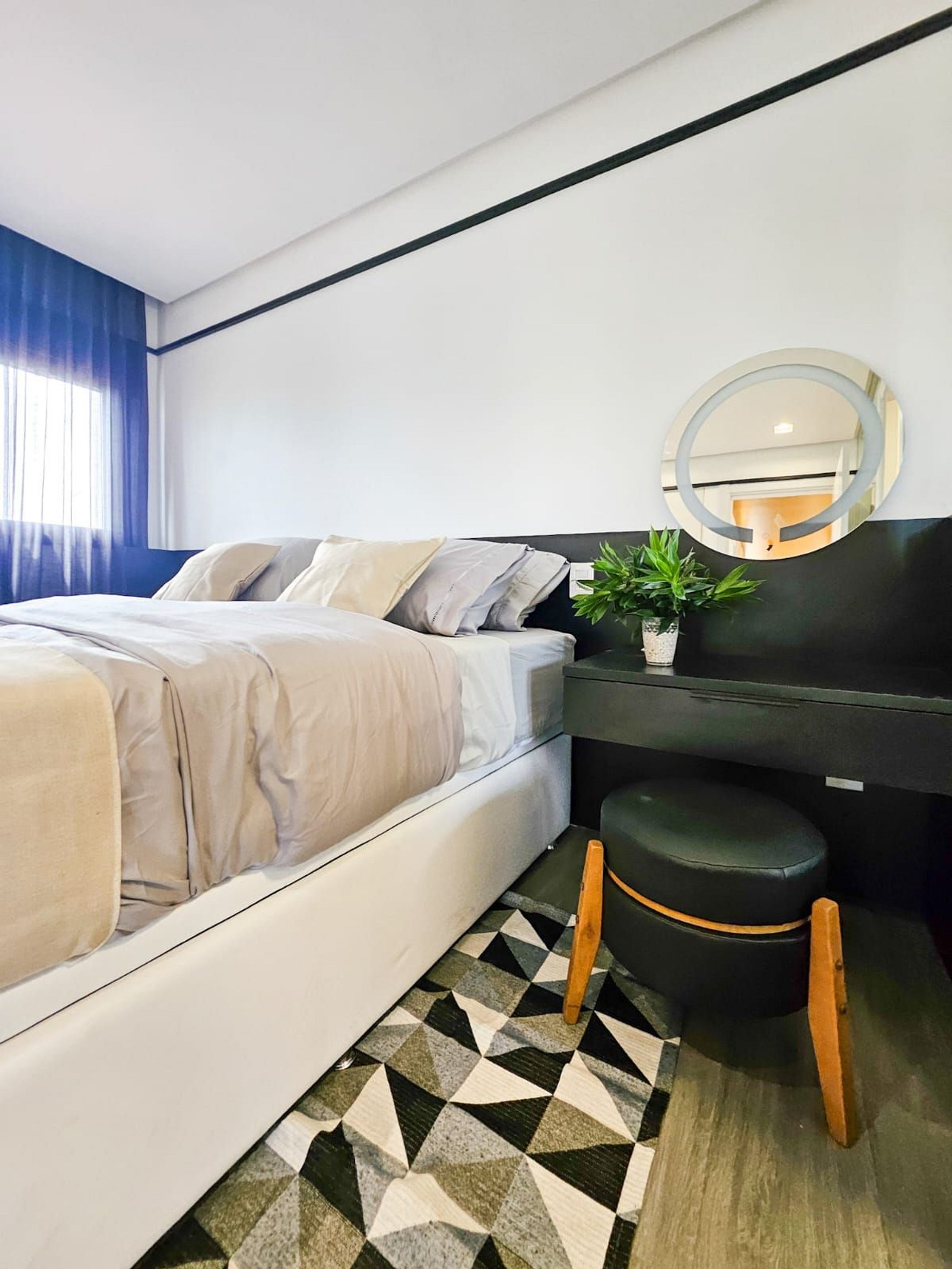 O apartamento oferece conforto, modernidade e uma vista espetacular do 11º andar. A suíte conta com TV e cama queen, enquanto o segundo quarto possui um espaço de trabalho e cama de solteiro. A sala tem um sofá confortável e mesa de jantar, perfeita para refeições ou home office.