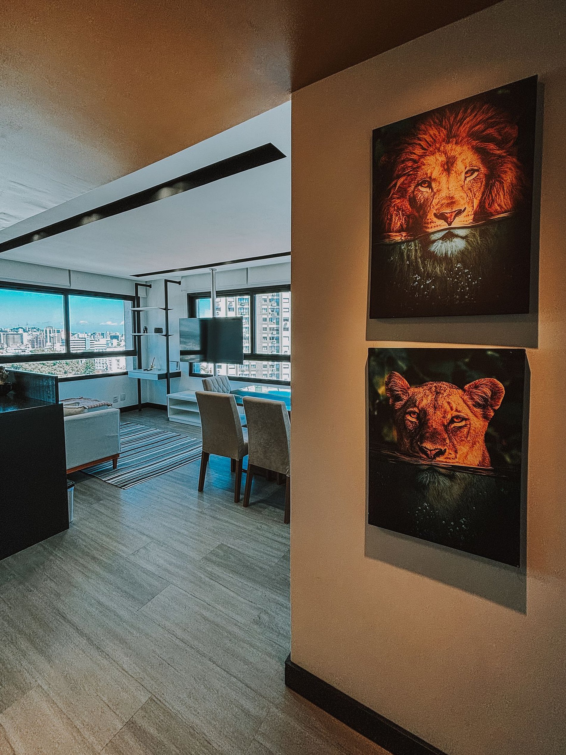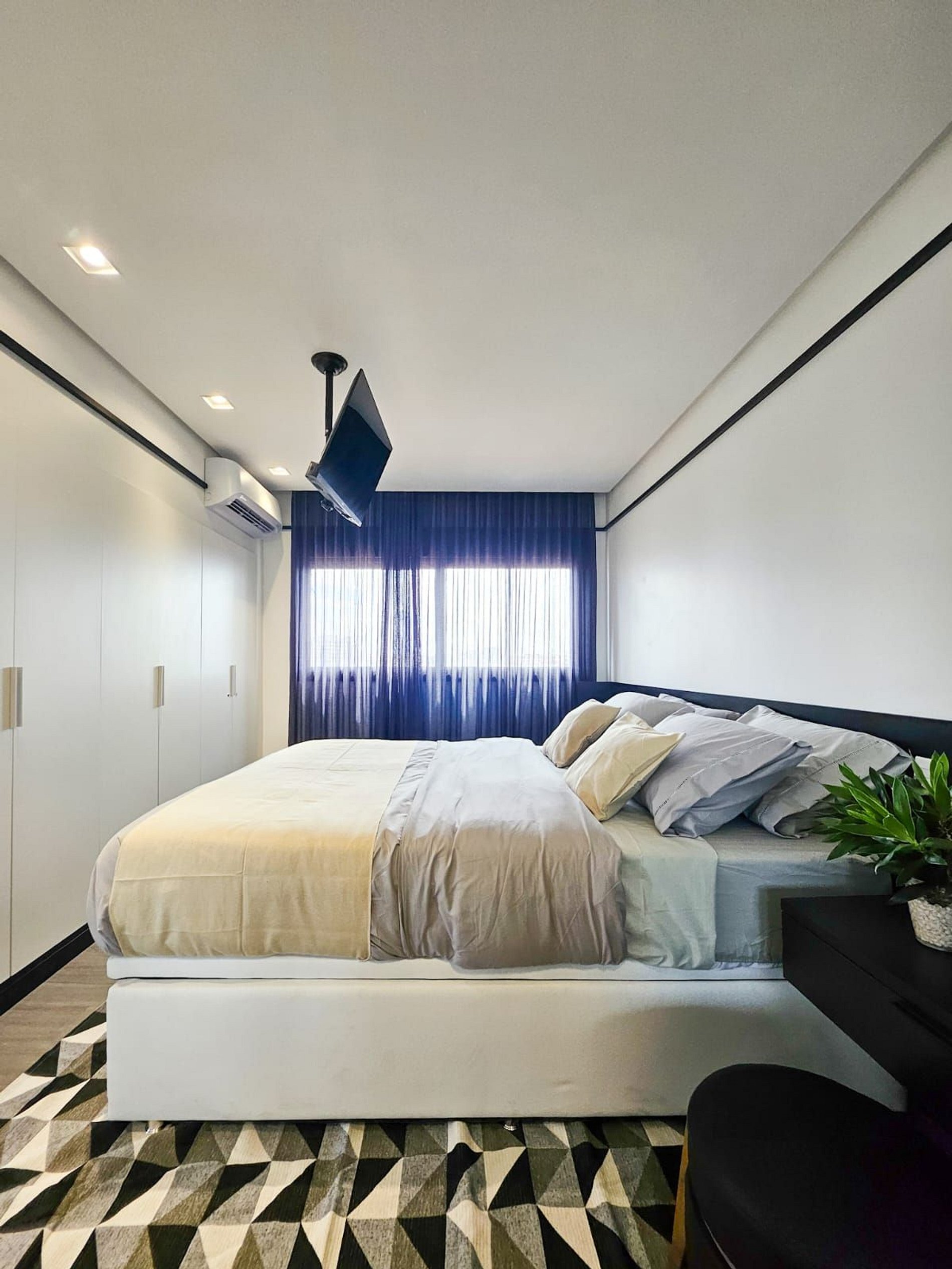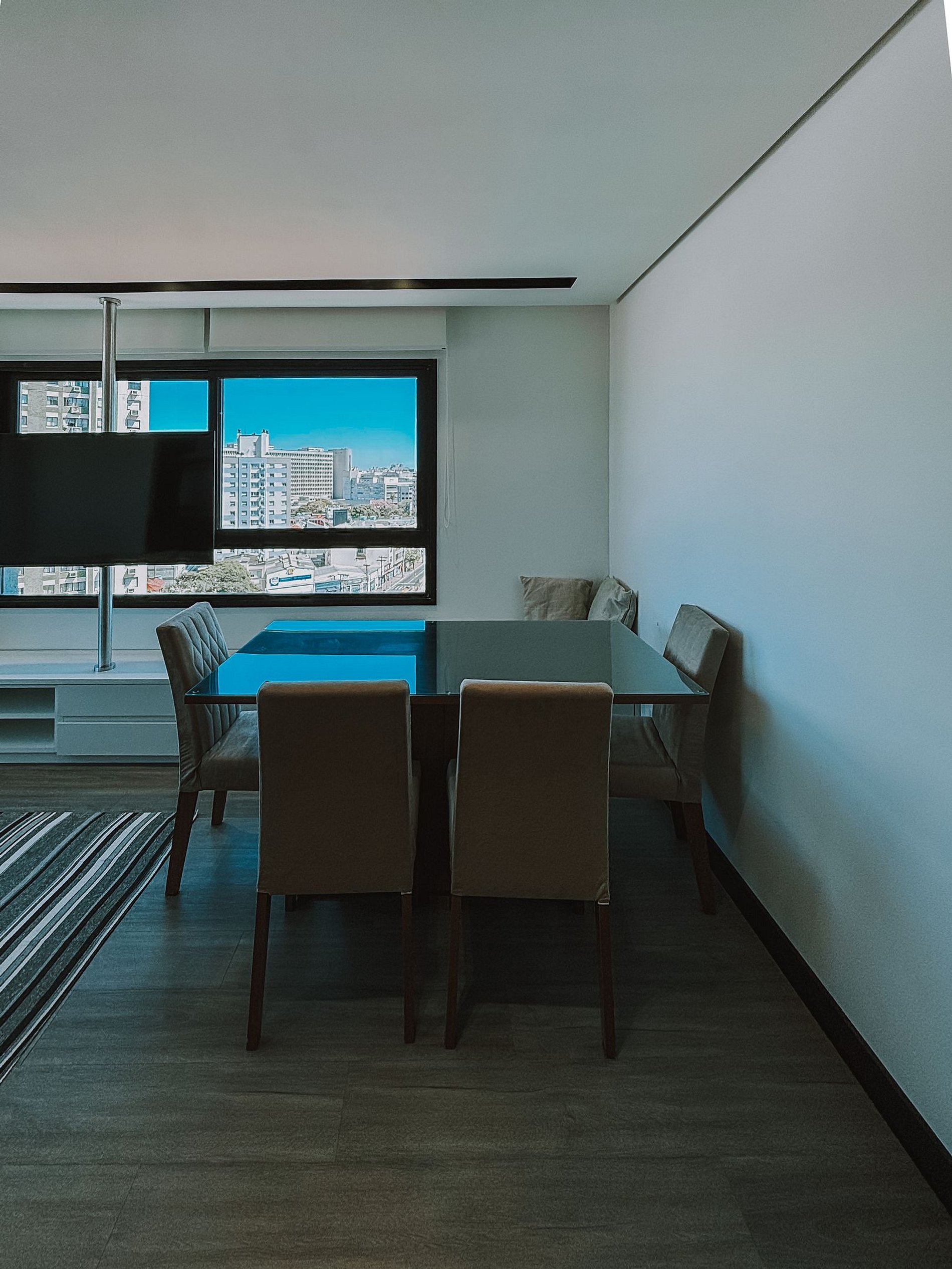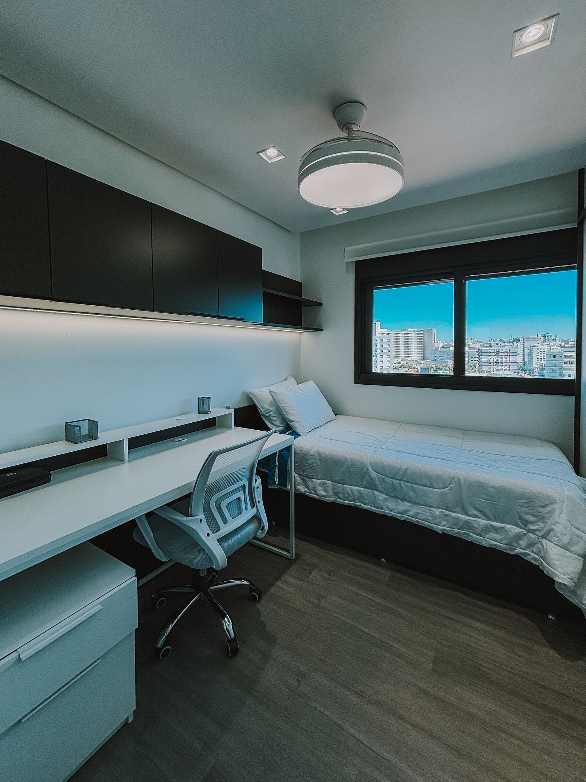 O apartamento oferece conforto, modernidade e uma vista espetacular do 11º andar. A suíte conta com TV e cama queen, enquanto o segundo quarto possui um espaço de trabalho e cama de solteiro. A sala tem um sofá confortável e mesa de jantar, perfeita para refeições ou home office.