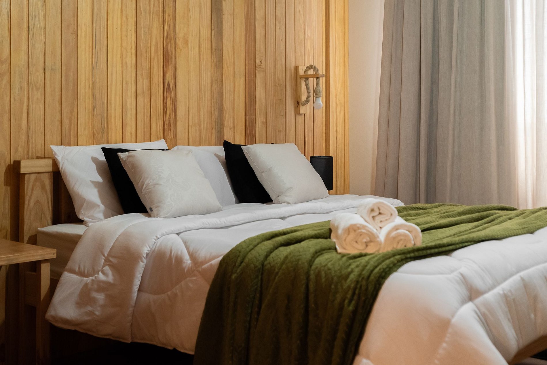 Acomodações: cama queen com, armário para roupas com cabides, cortinas blackout e espelho de corpo inteiro.