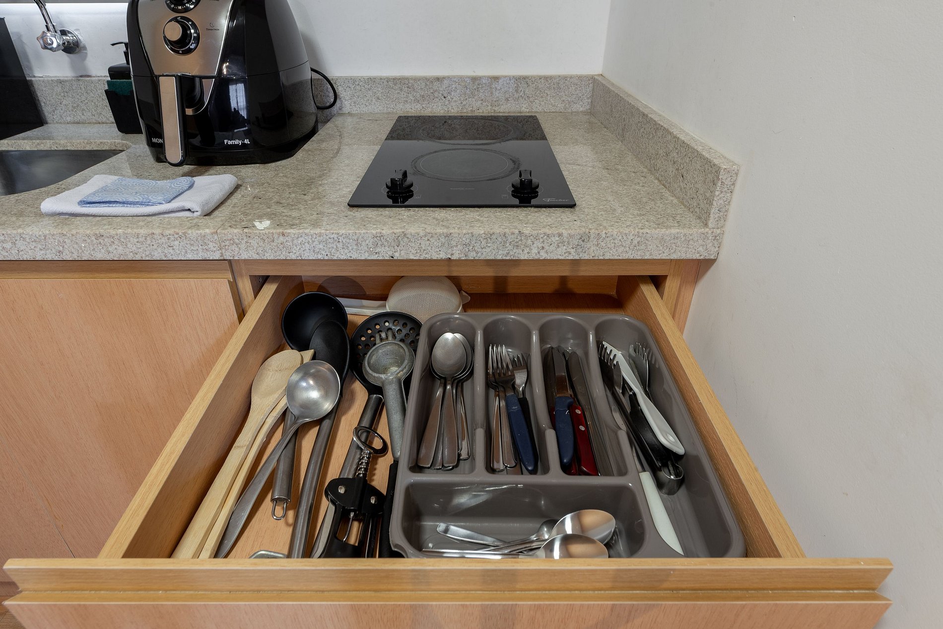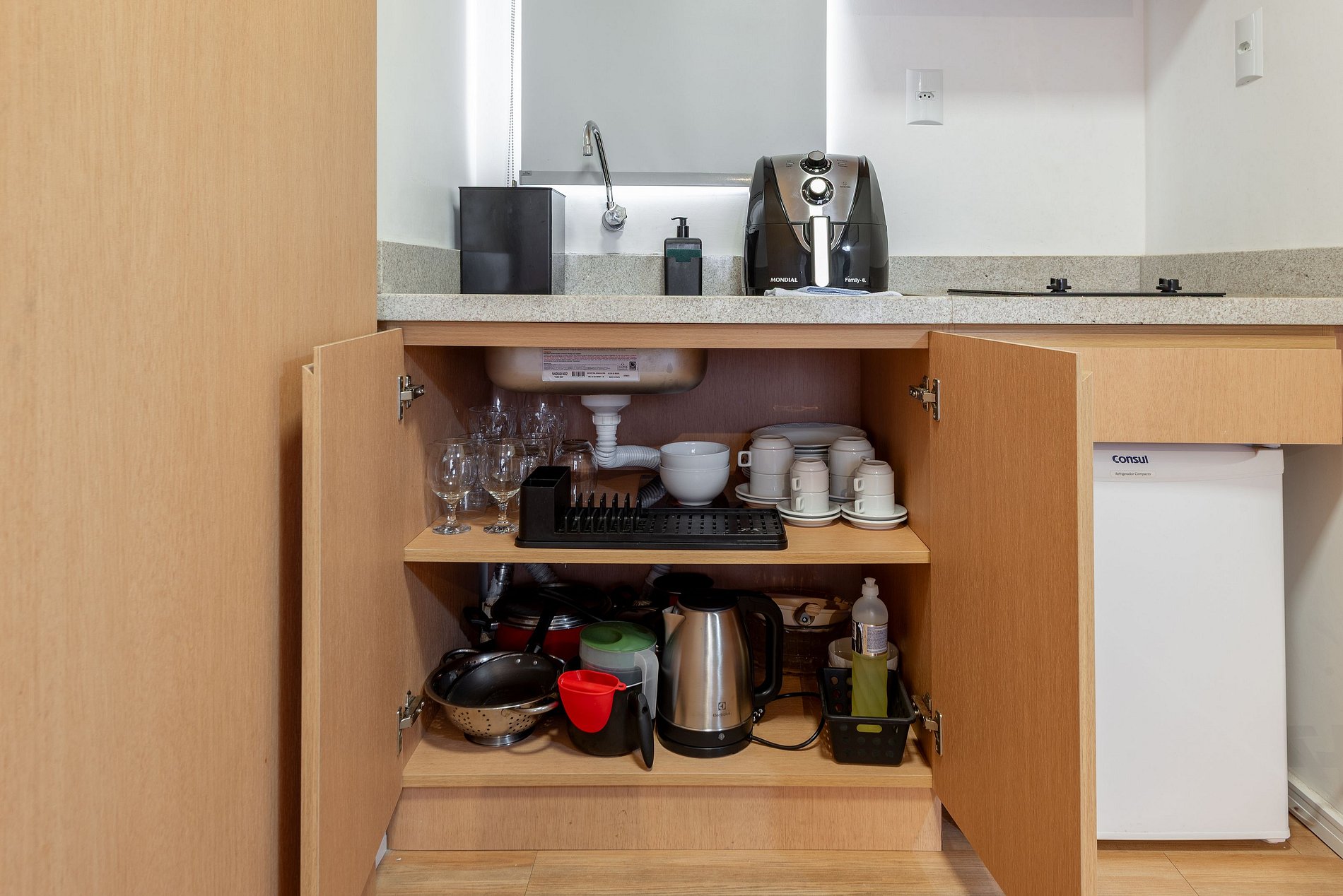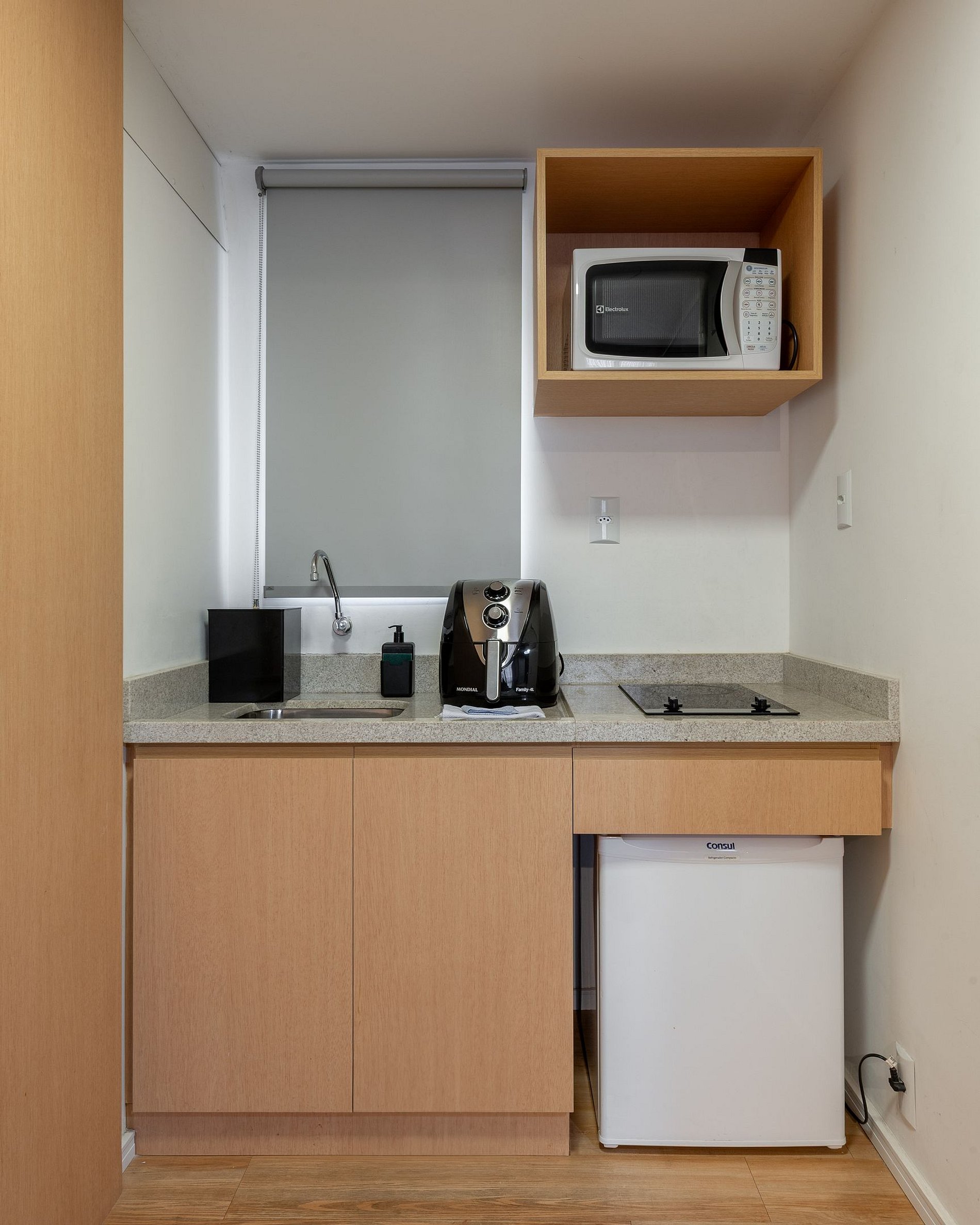 Cozinha equipada: panelas, louças, taças, talheres, utensílios básicos, cooktop de indução (2 queimadores), forno, forno de micro-ondas, cafeteira Nespresso, frigobar.