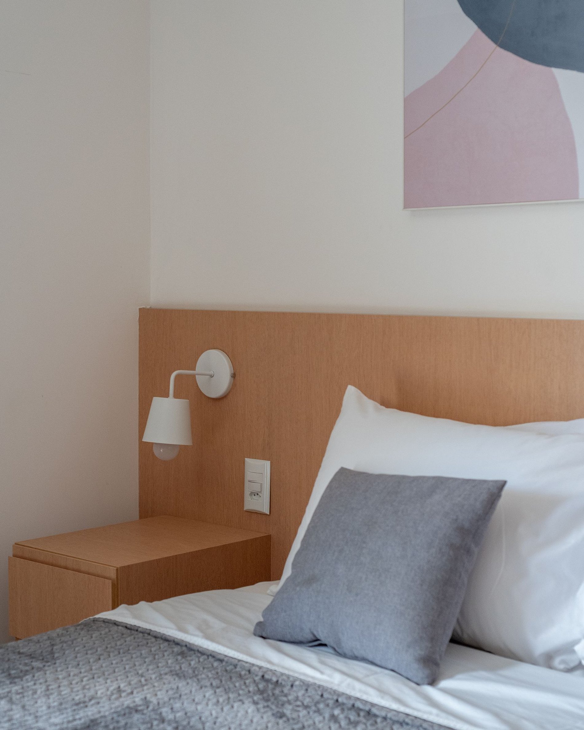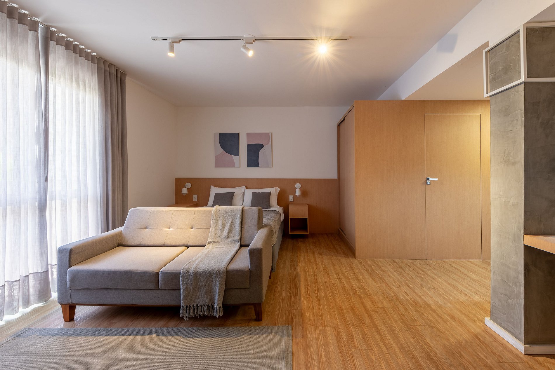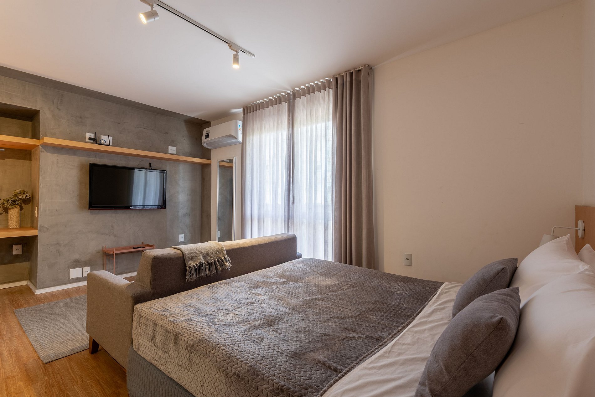 Acomodações: cama queen com, armário para roupas com cabides, cortinas blackout e espelho de corpo inteiro.