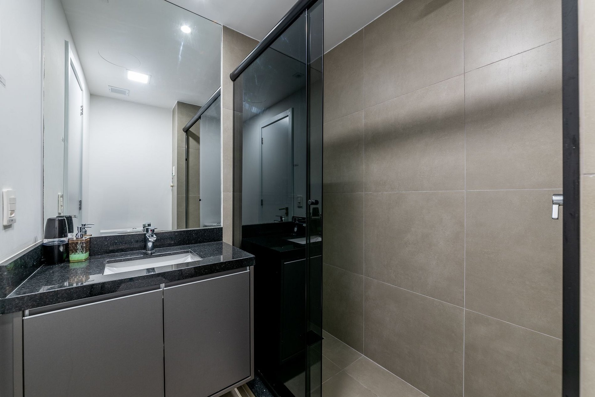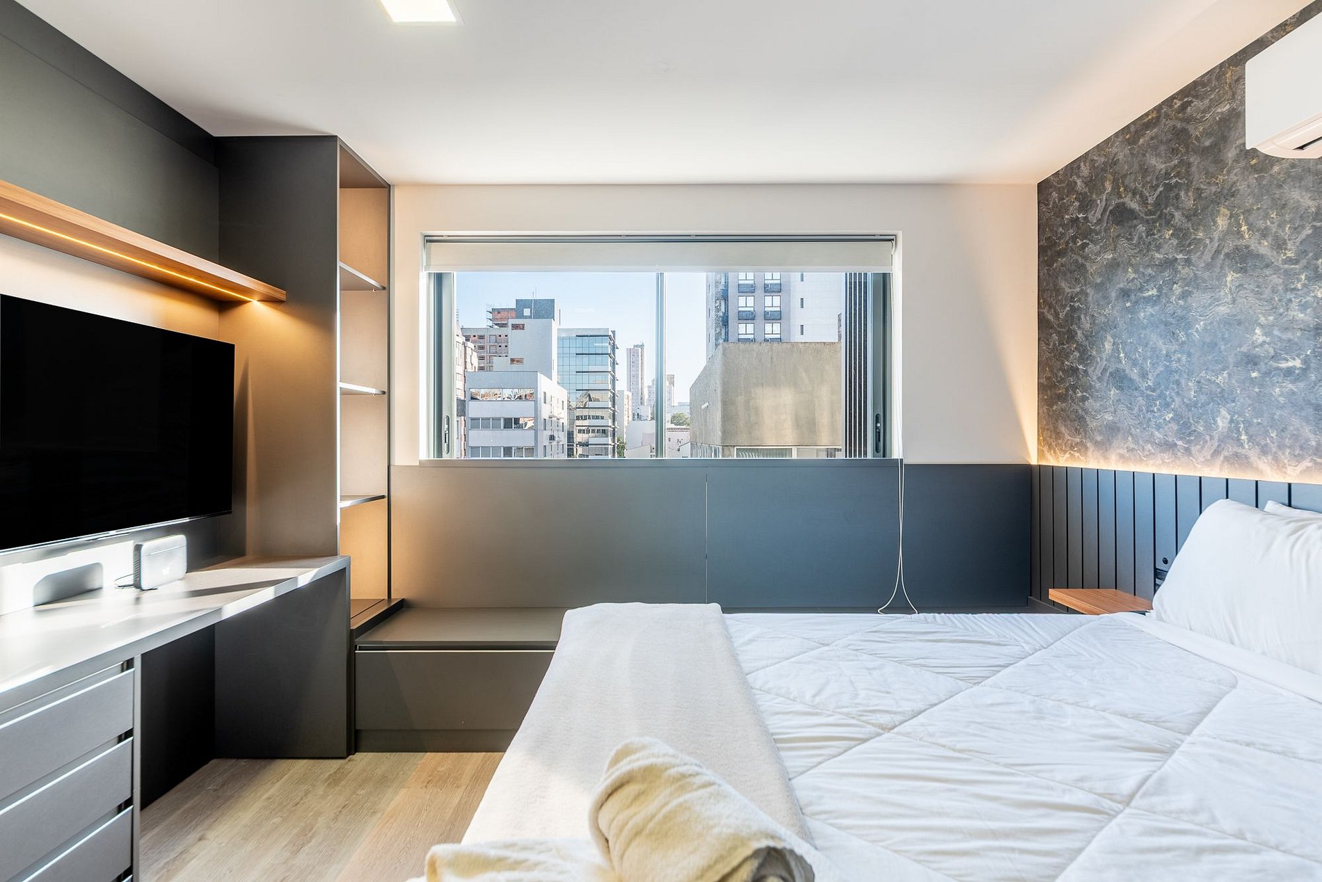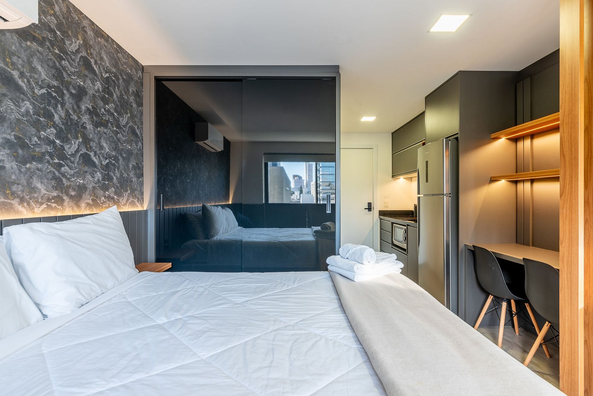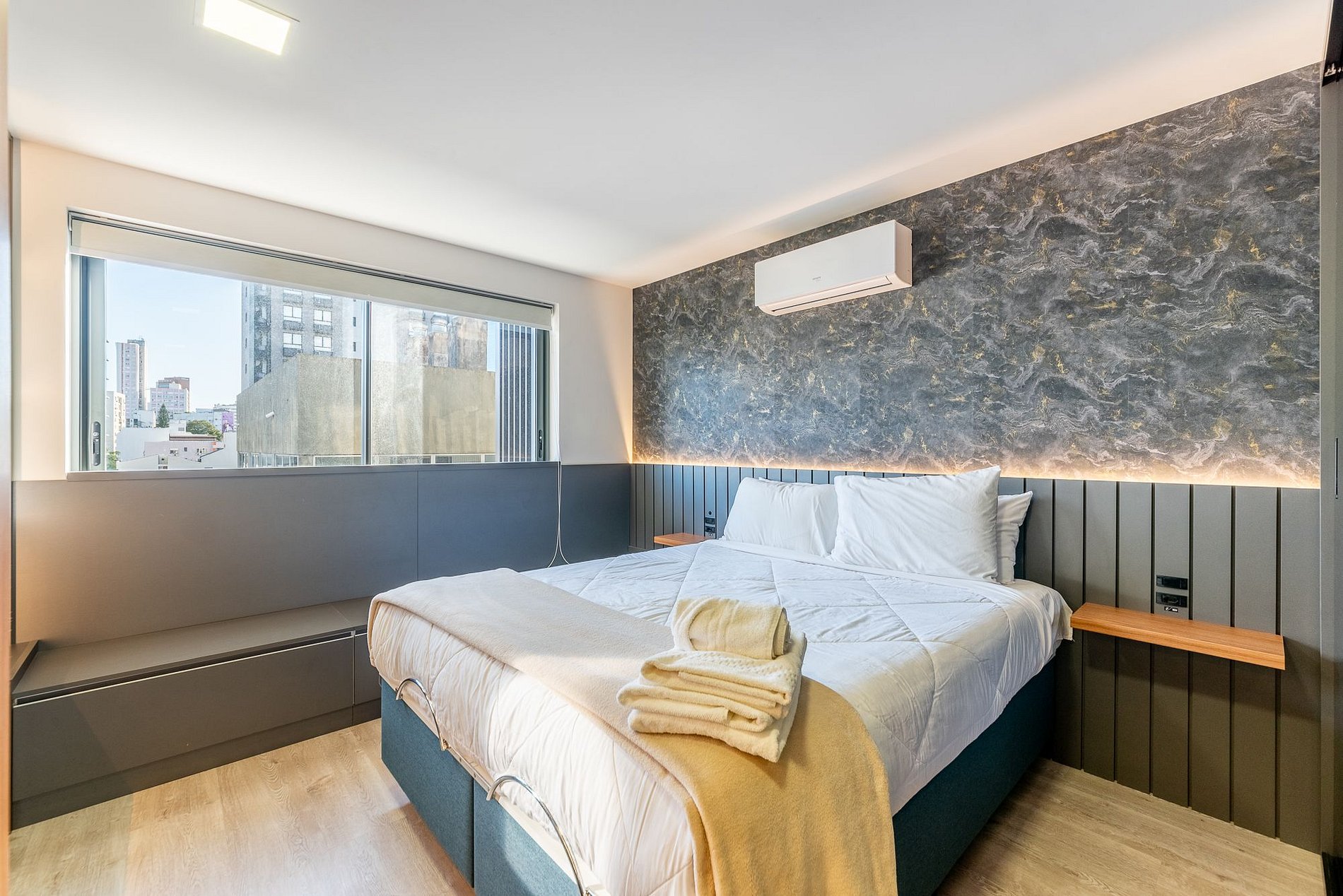Studio moderno no 6º andar do edifício GO24, com decoração elegante em preto e madeira. Ideal para estadias práticas e confortáveis, com cama queen, cozinha completa, Wi-Fi rápido e ar-condicionado. O prédio oferece rooftop com piscina, academia 24h, lavanderia e coworking. Localizado na Rua 24 de Outubro, no bairro Auxiliadora, perto de ótimas opções de gastronomia, compras e lazer. Viva essa experiência!