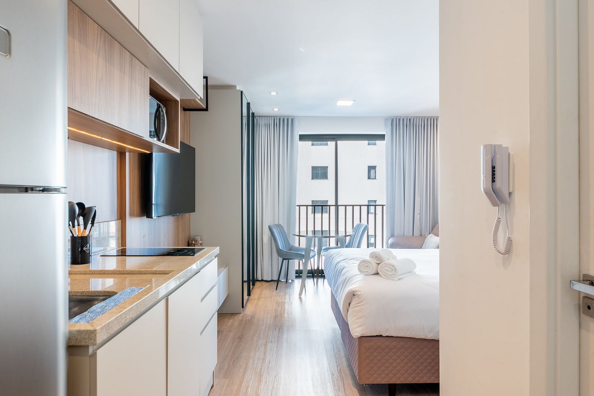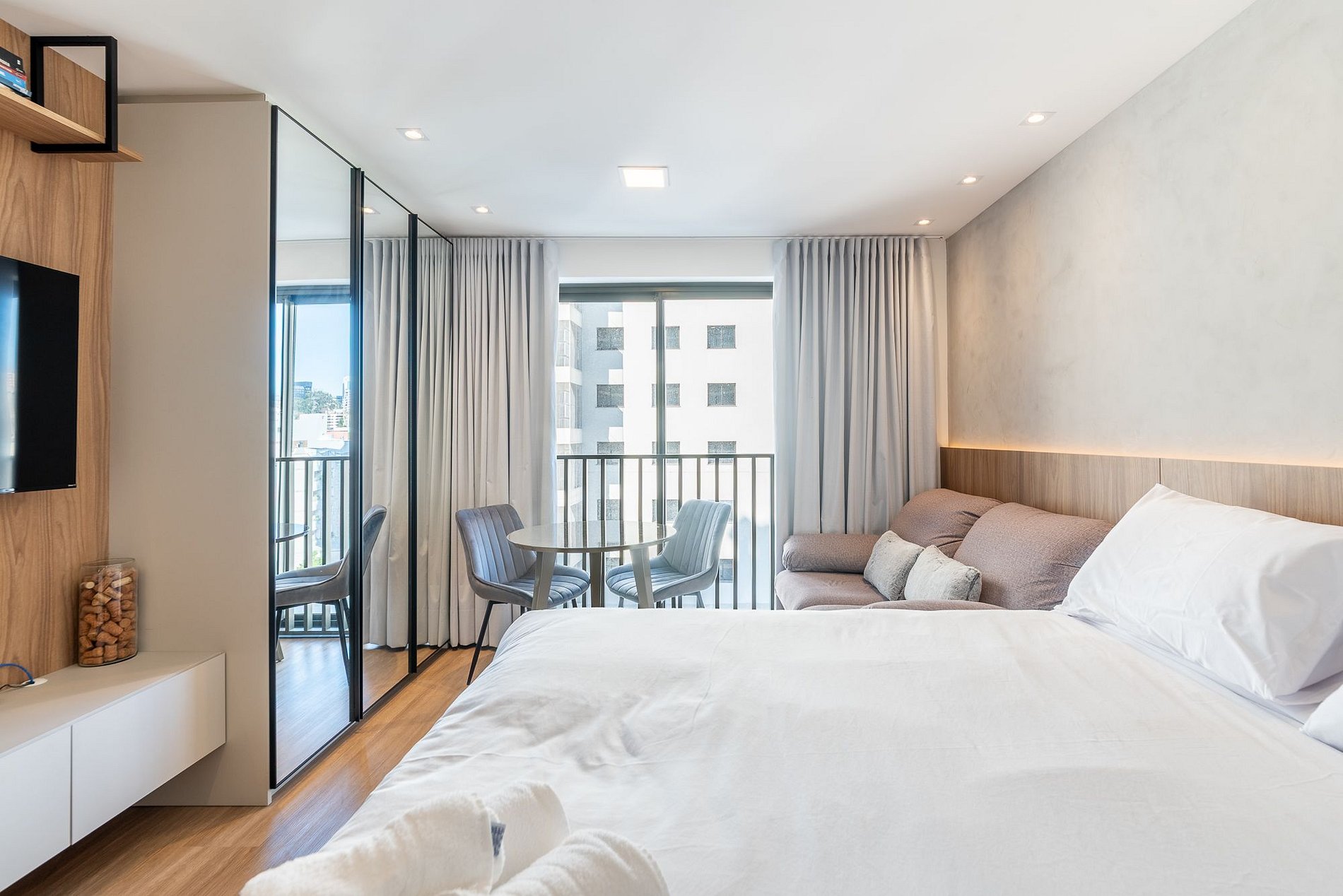 Studio moderno no 9º andar do edifício GO24, com decoração elegante em preto e madeira. Ideal para estadias práticas e confortáveis, com cama queen, cozinha completa, Wi-Fi rápido e ar-condicionado. O prédio oferece rooftop com piscina, academia 24h, lavanderia e coworking. Localizado na Rua 24 de Outubro, no bairro Auxiliadora, perto de ótimas opções de gastronomia, compras e lazer. Viva essa experiência!