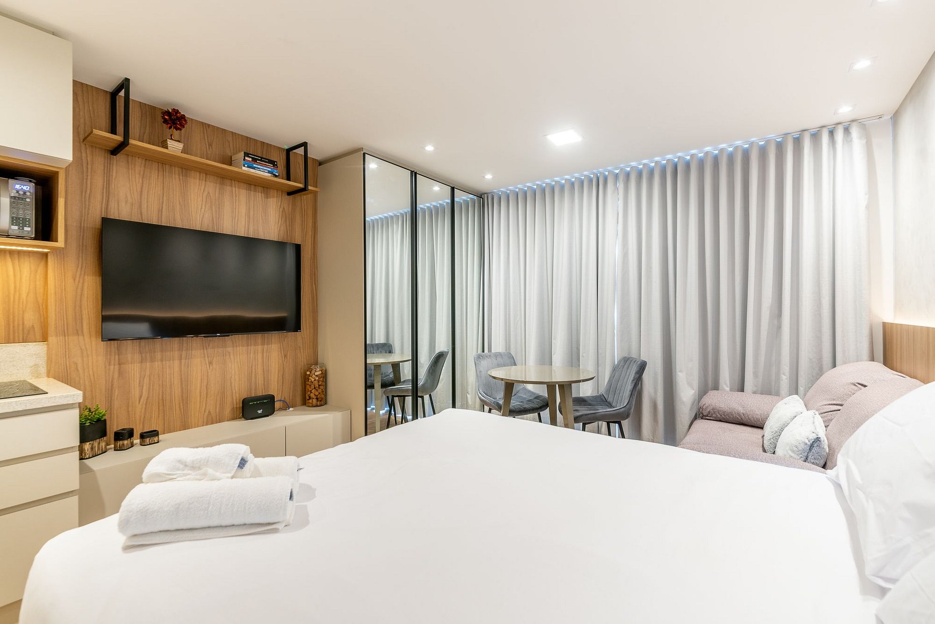 Importante: O apartamento é preparado para receber duas pessoas em cama de casal. Caso os hóspedes prefiram dormir separadamente, será necessário solicitar enxoval extra para o sofá-cama (ou cama auxiliar). Esse serviço pode ter custo adicional e precisa ser combinado antes da reserva.