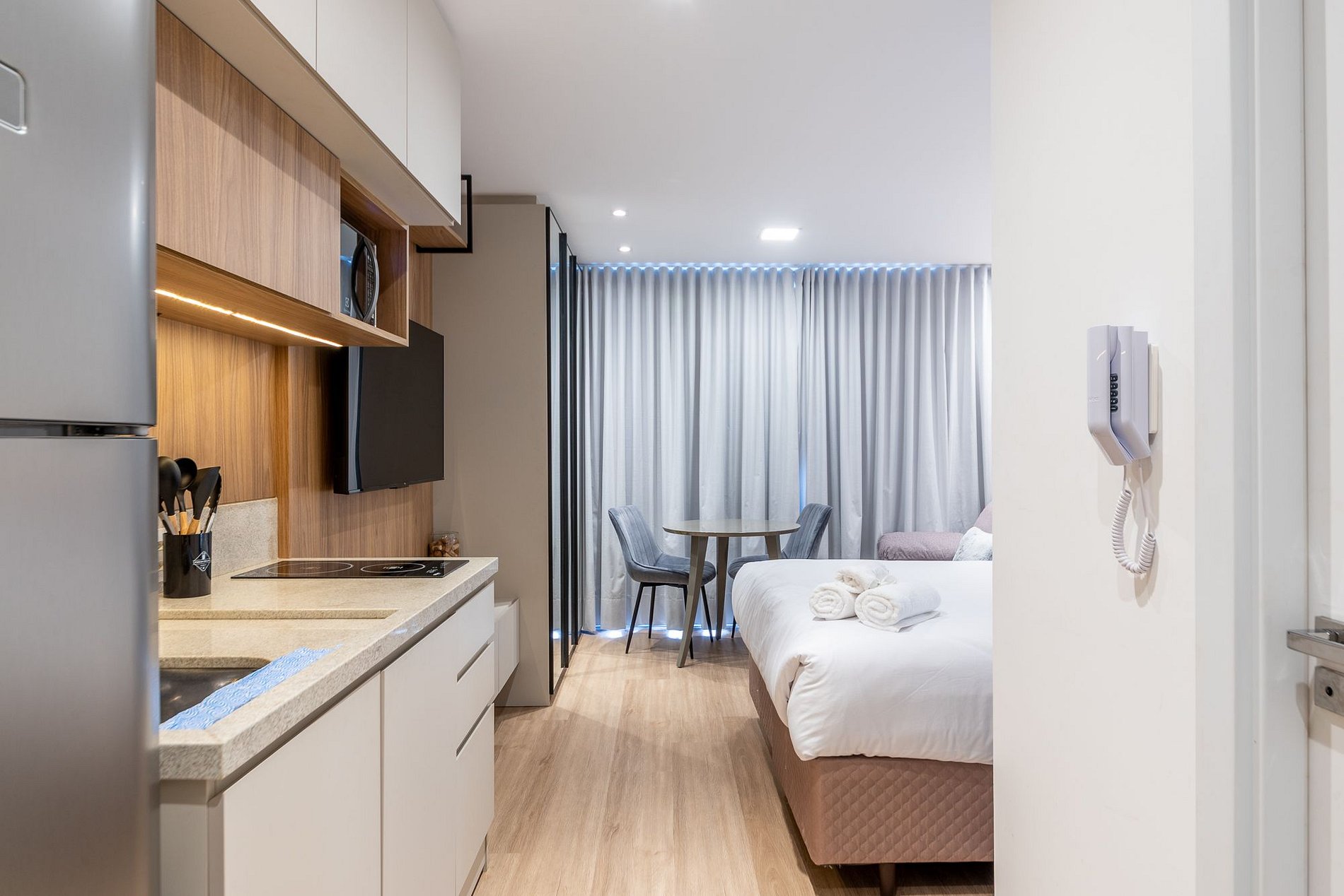 Studio moderno no 9º andar do edifício GO24, com decoração elegante em preto e madeira. Ideal para estadias práticas e confortáveis, com cama queen, cozinha completa, Wi-Fi rápido e ar-condicionado. O prédio oferece rooftop com piscina, academia 24h, lavanderia e coworking. Localizado na Rua 24 de Outubro, no bairro Auxiliadora, perto de ótimas opções de gastronomia, compras e lazer. Viva essa experiência!
