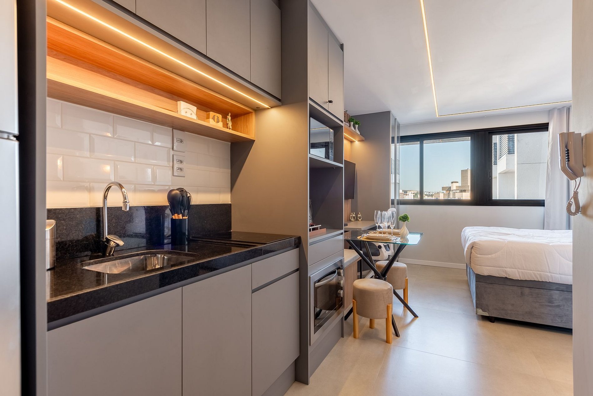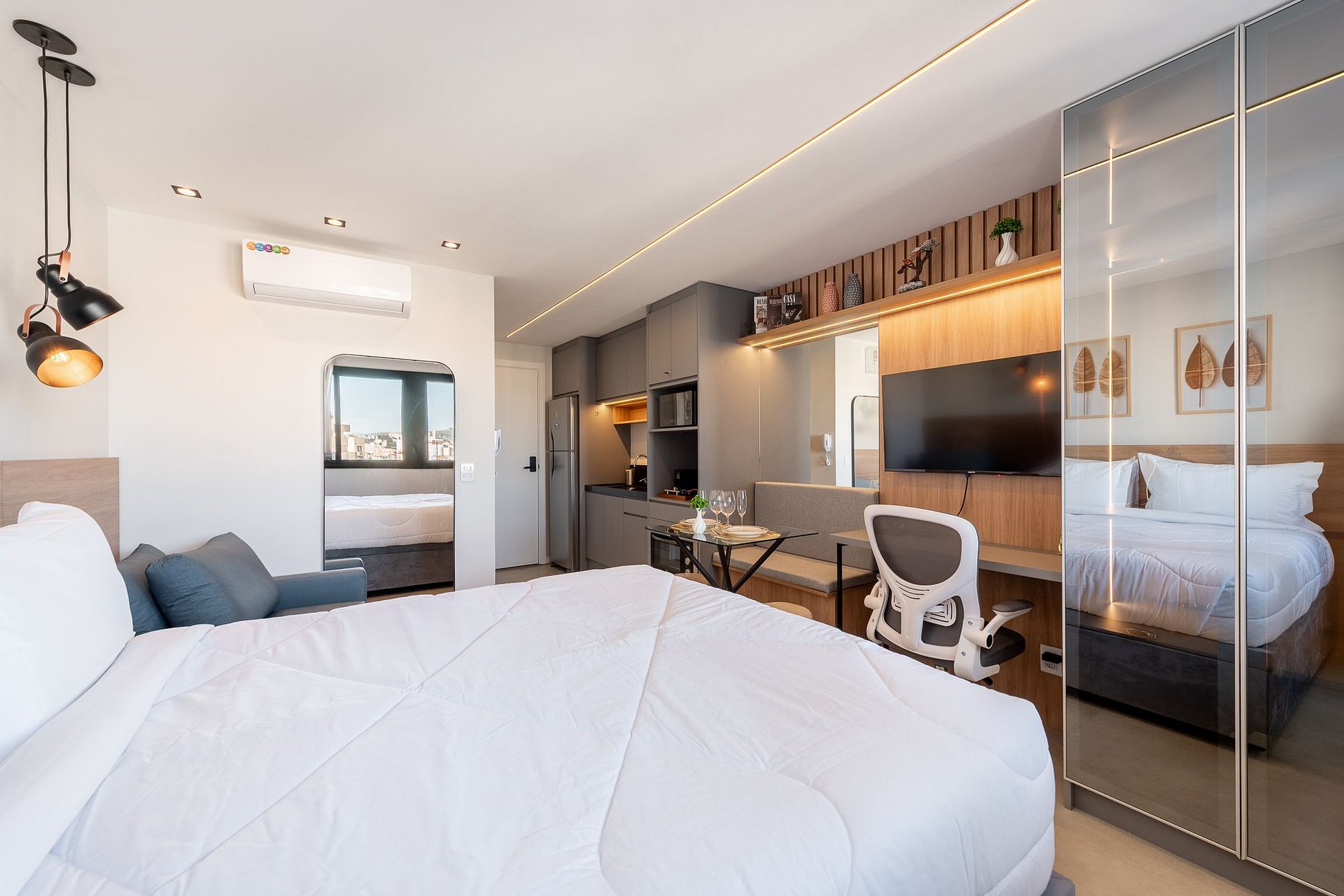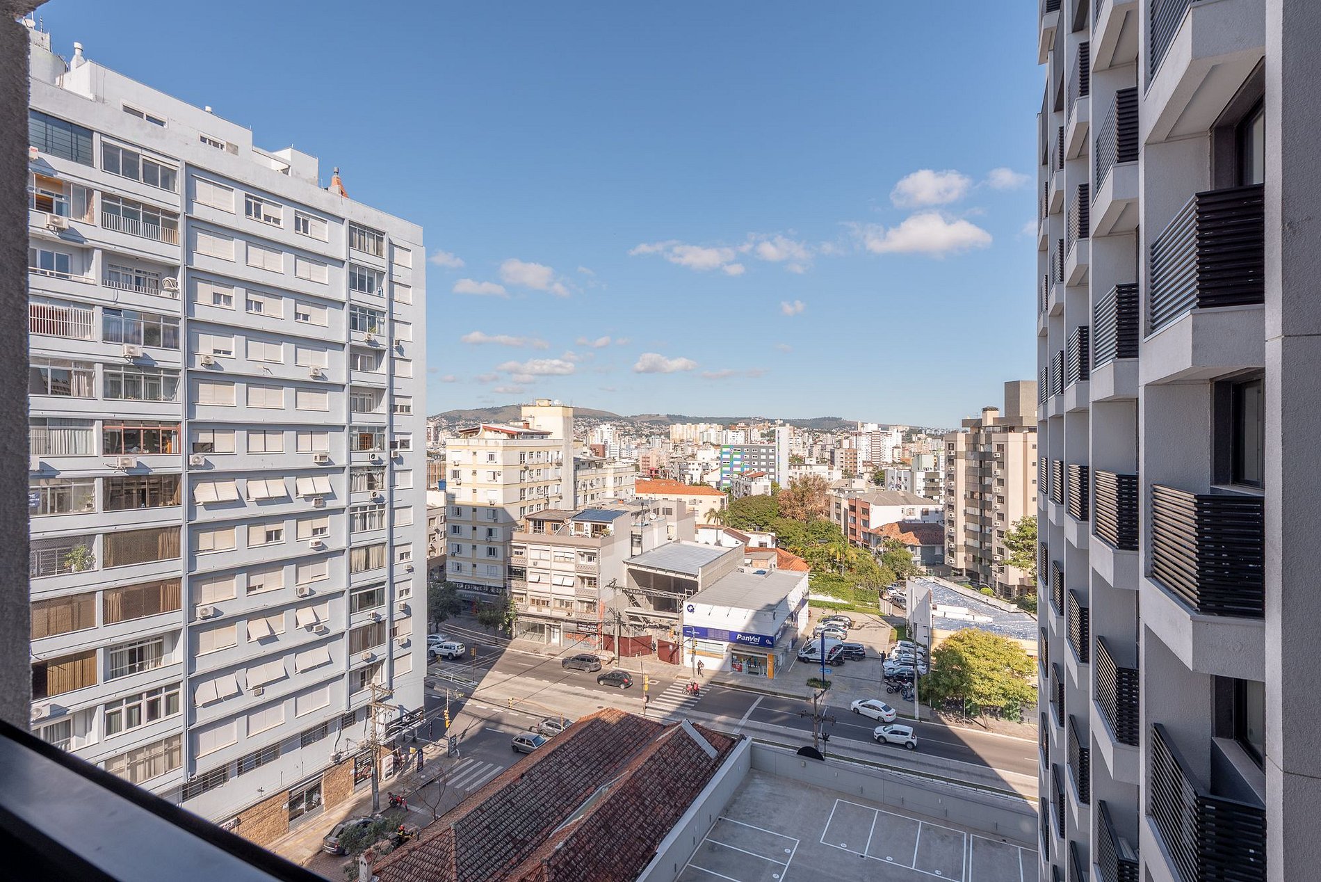Studio moderno no bairro nobre Rio Branco, Porto Alegre. Sofá-cama, cama Queen, ar-condicionado quente/frio, cozinha completa e Wi-Fi. Self check-in com fechadura digital e portaria 24h. Acesso a academia, coworking, rooftop com piscina e espaço pet. Lavanderia paga no prédio. Vaga de garagem fixa e coberta no estacionamento ao lado (50m), com controle disponível no apartamento.