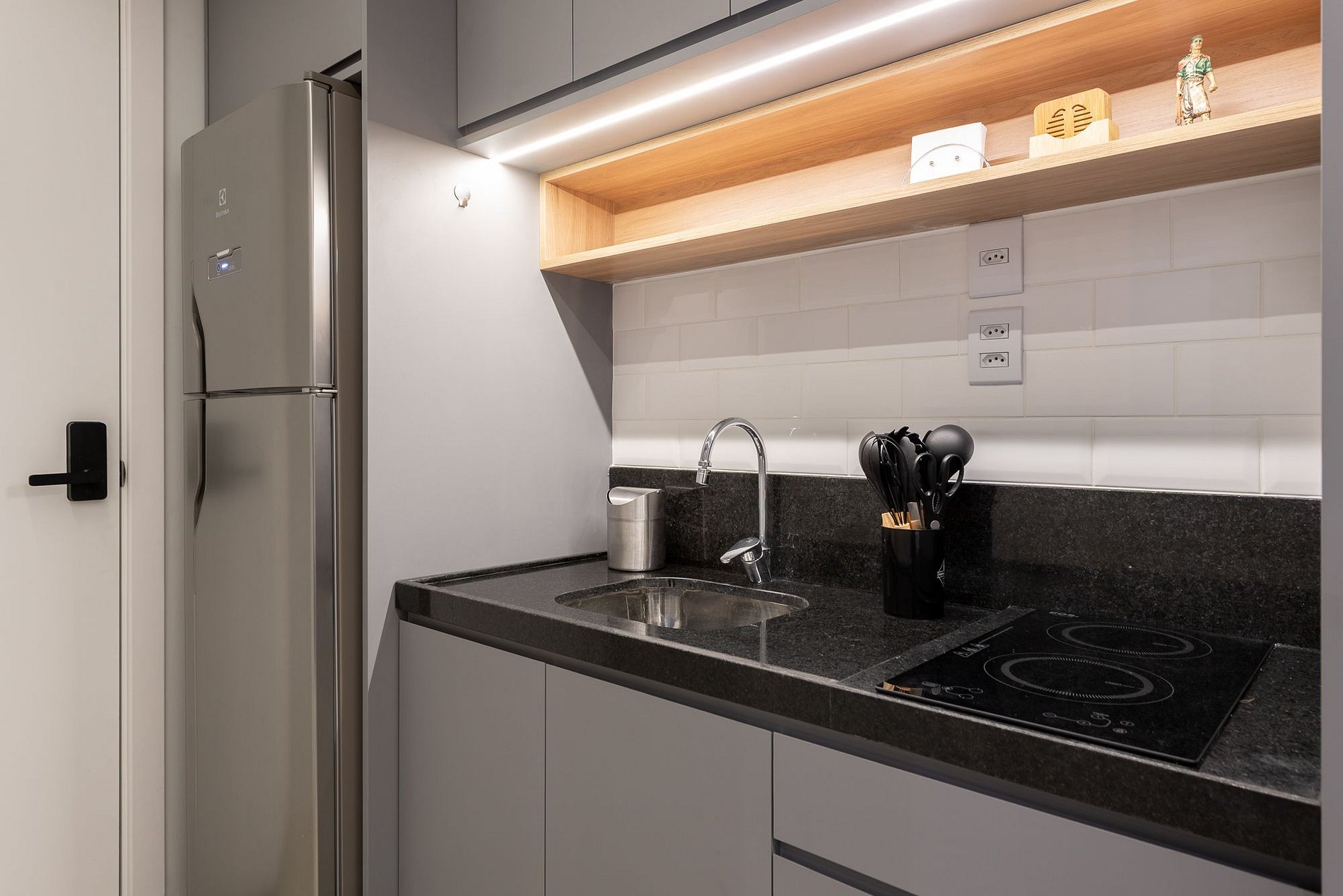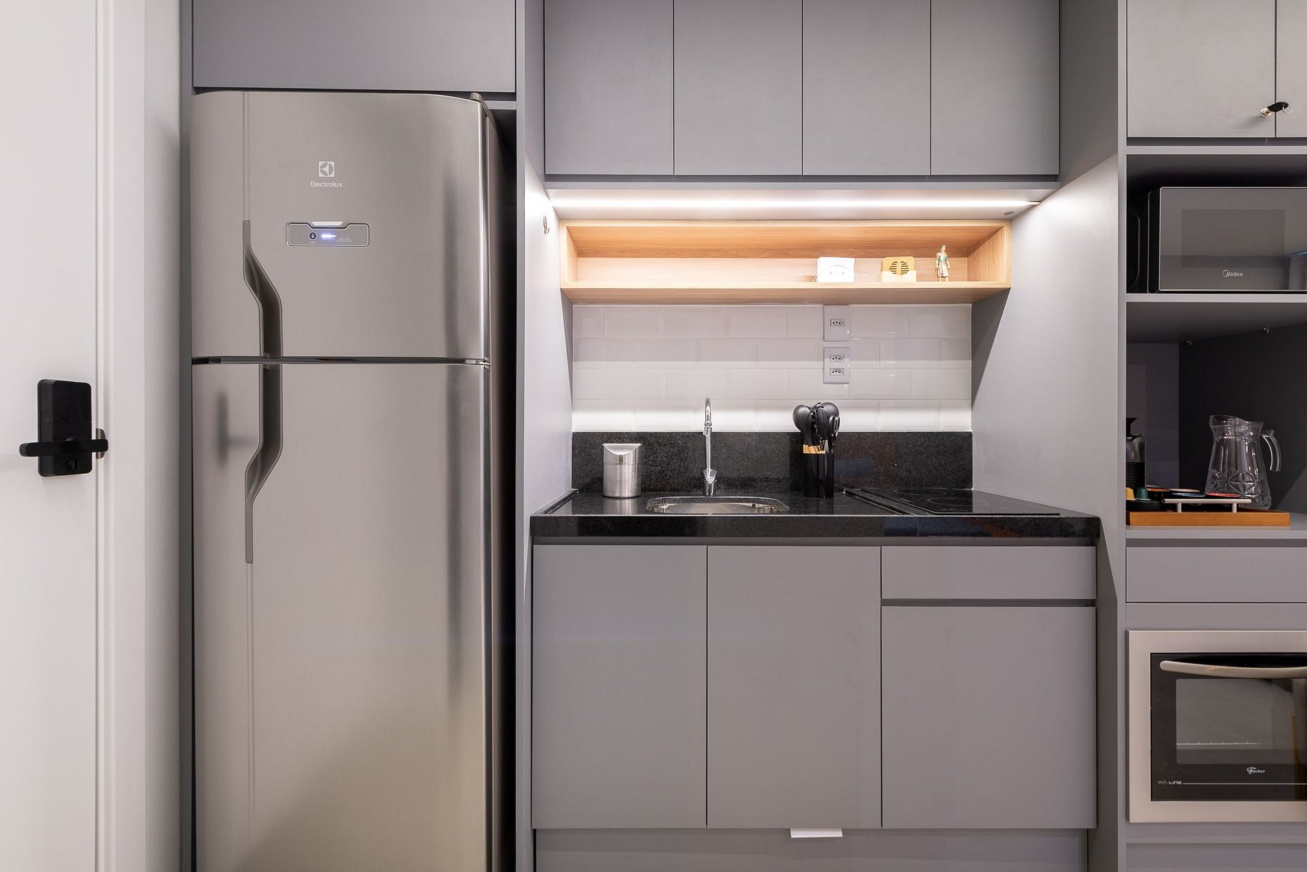 - Cooktop de indução (2 bocas), forno, micro-ondas, geladeira