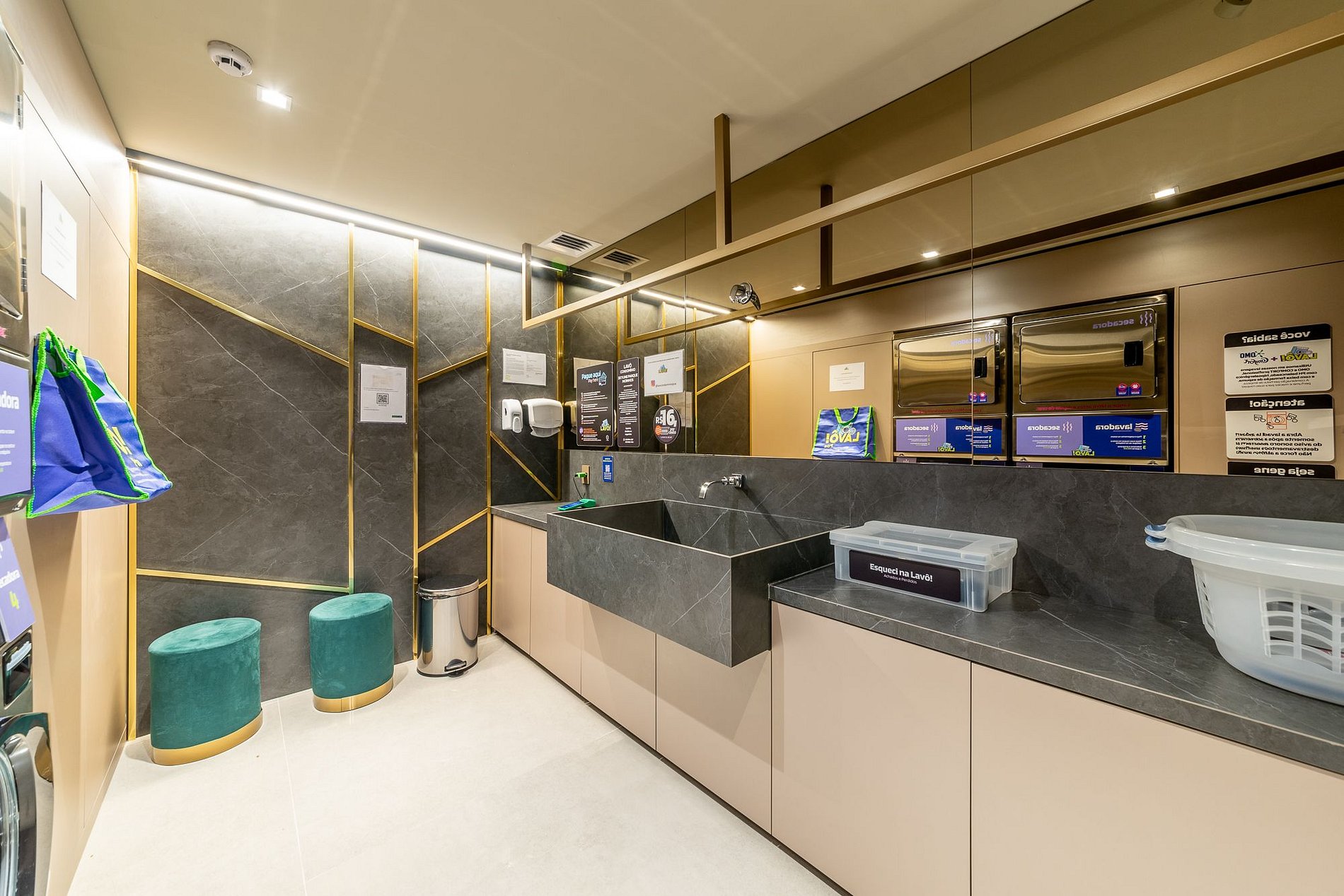A lavanderia no térreo é equipada com máquinas de lavar e secar e funciona através de pagamento com cartão de crédito em um terminal de autoatendimento, disponível ao lado dos equipamentos.
