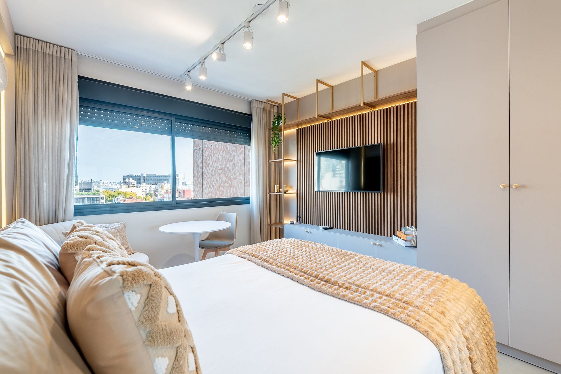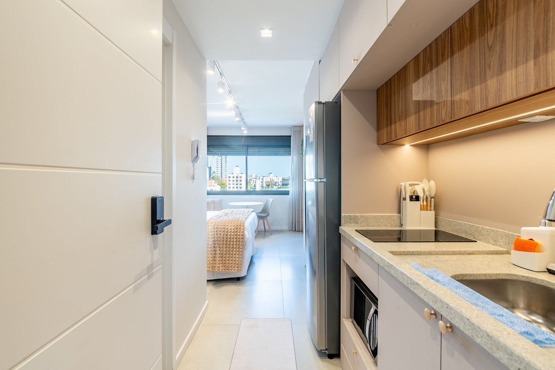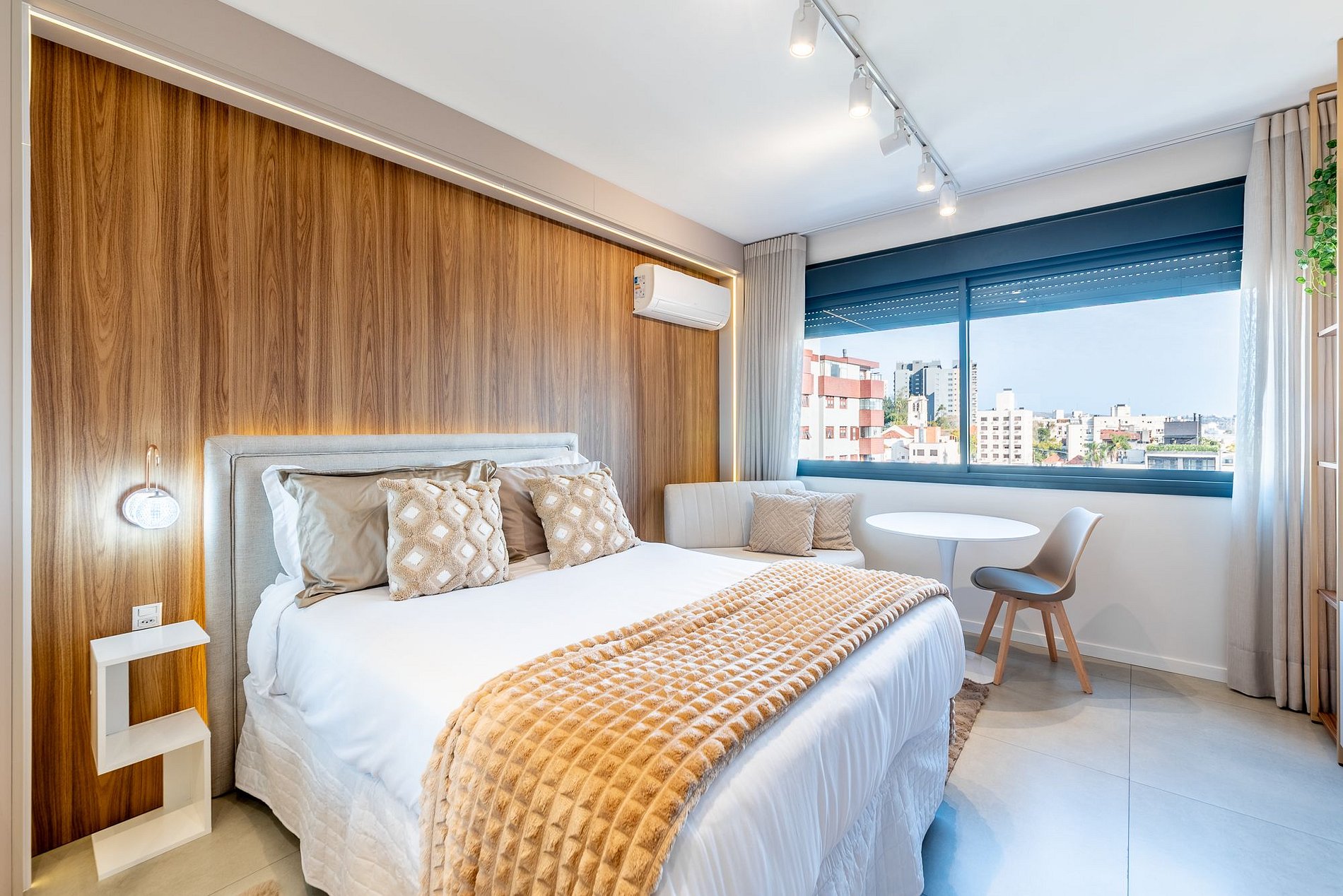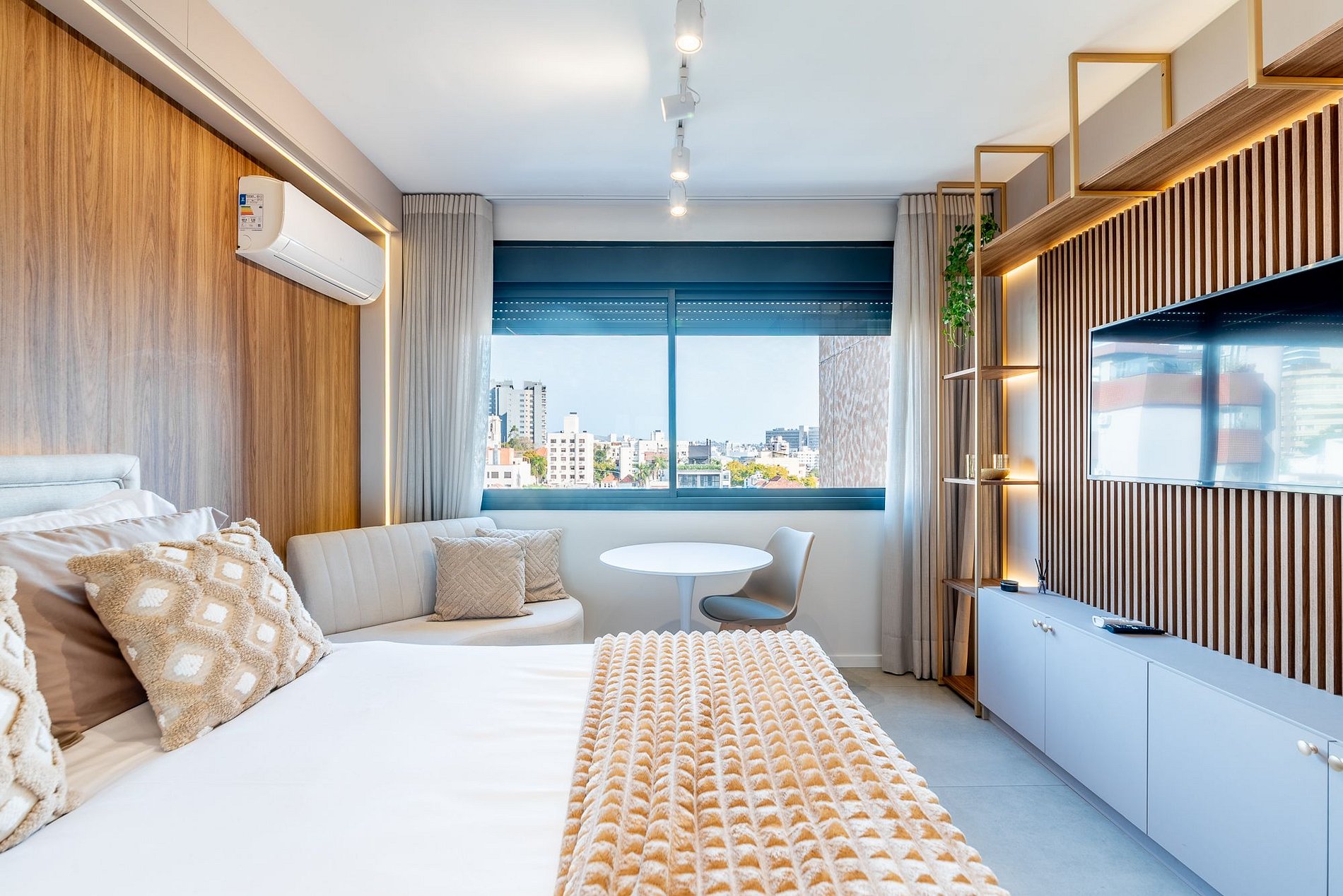 Studio moderno e aconchegante no 7º andar do Skyline Parque Moinhos, em Porto Alegre. Decorado em tons neutros, oferece cama de casal, ar-condicionado, Smart TV, Wi-Fi e cozinha completa com eletros. Self check-in por fechadura digital, portaria 24h e vaga de garagem rotativa. Localização privilegiada, próxima ao Parcão, Shopping e às melhores opções de gastronomia da cidade.