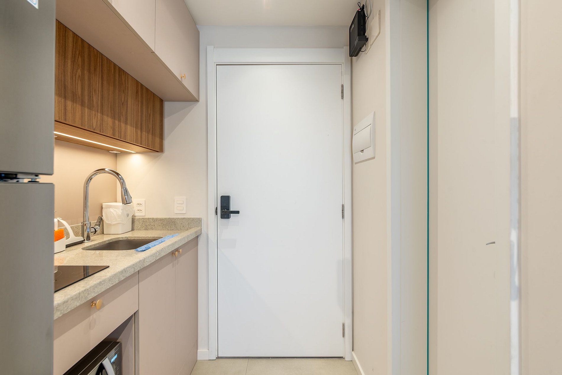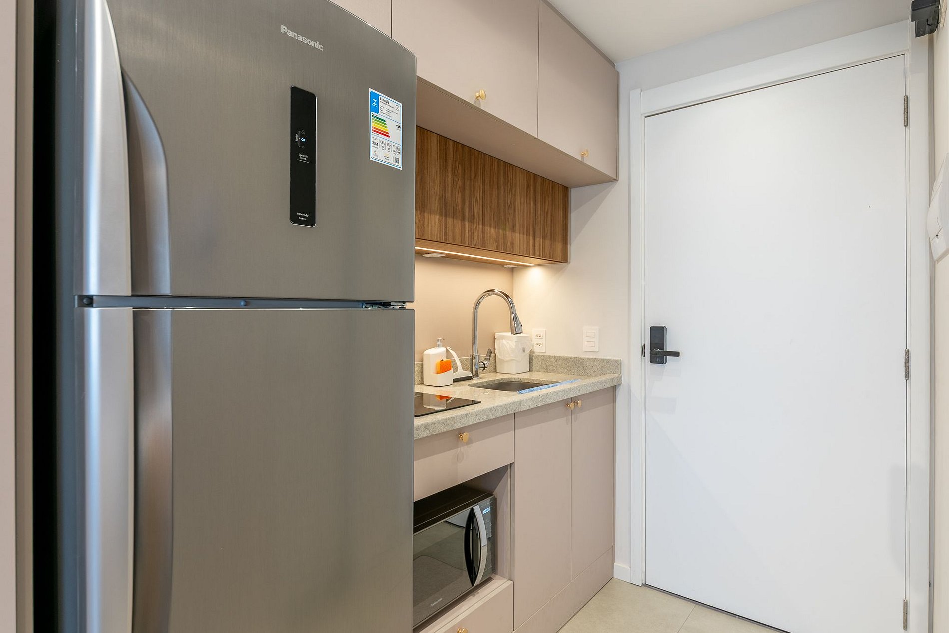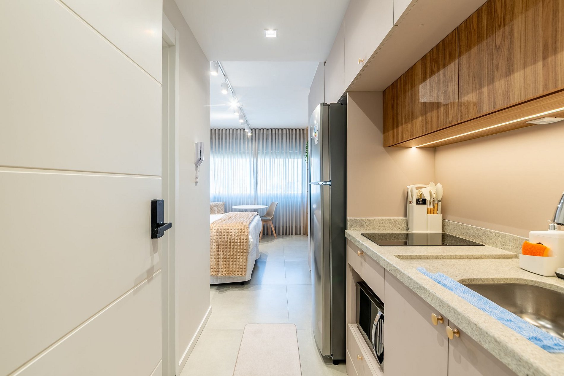 - Micro-ondas, cooktop de indução (2 bocas), cafeteira elétrica, airfryer, liquidificador, torradeira e geladeira