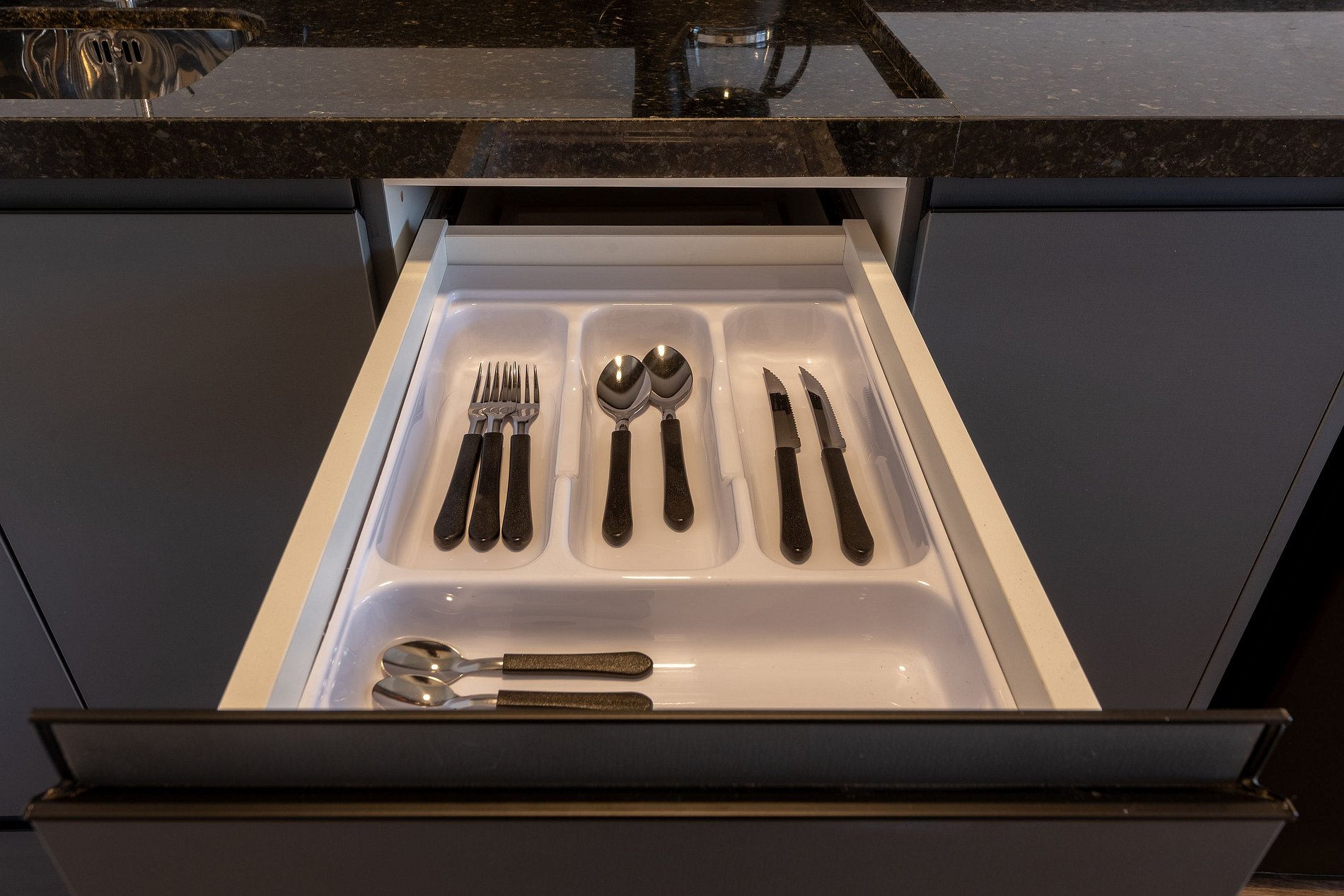 Panelas, copos, taças, louças, talheres e utensílios básicos de cozinha