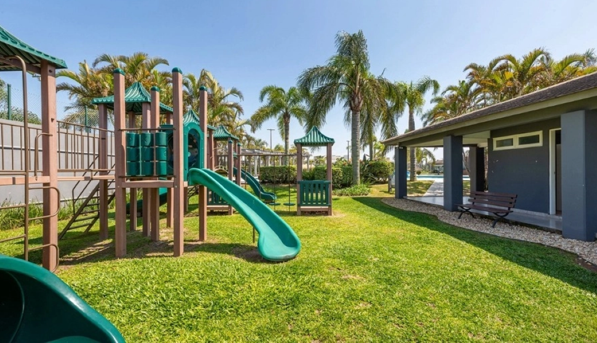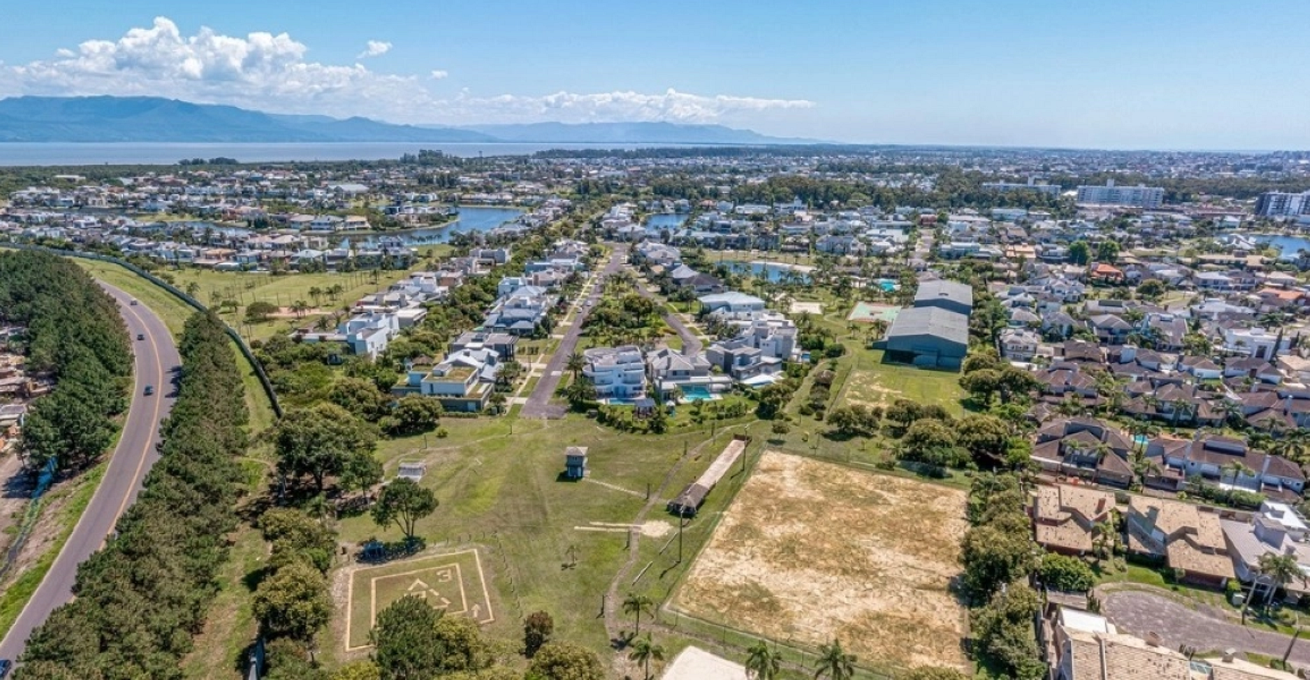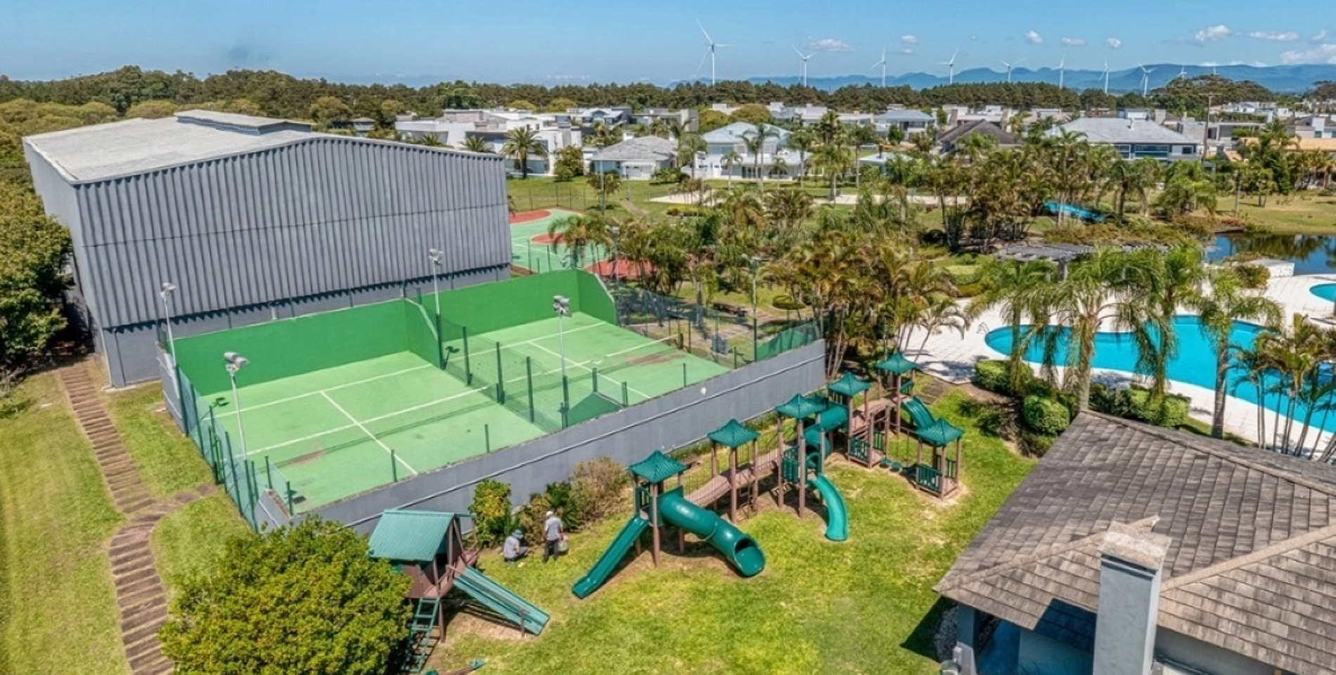 Entre seus diferenciais estão uma praia artificial com lago interno, piscinas adulto e infantil, quadras de tênis (inclusive coberta de saibro), quadras de paddle e poliesportiva, campos de futebol, pistas de caminhada, playground e espaços de convivência à beira-lago.